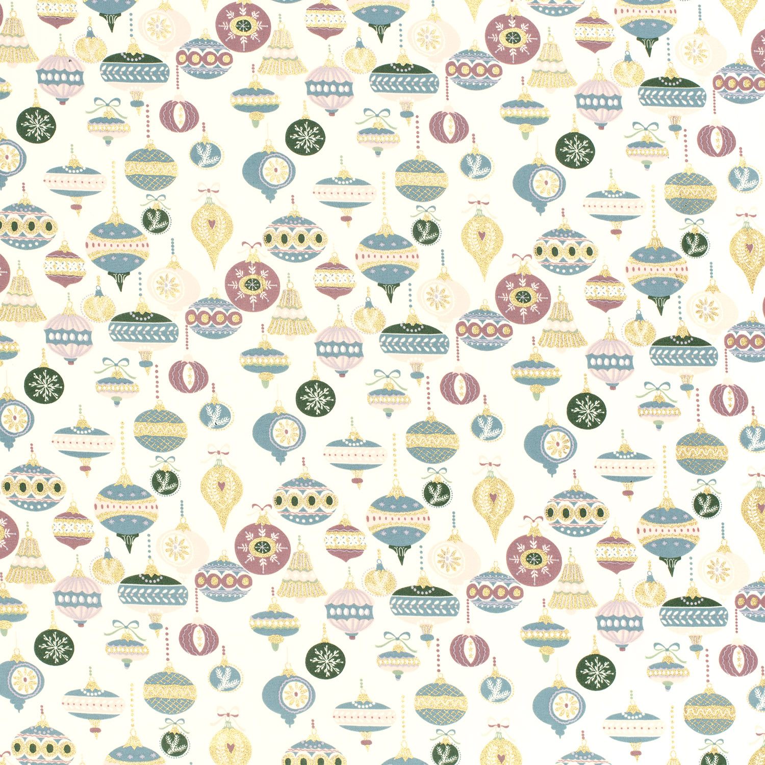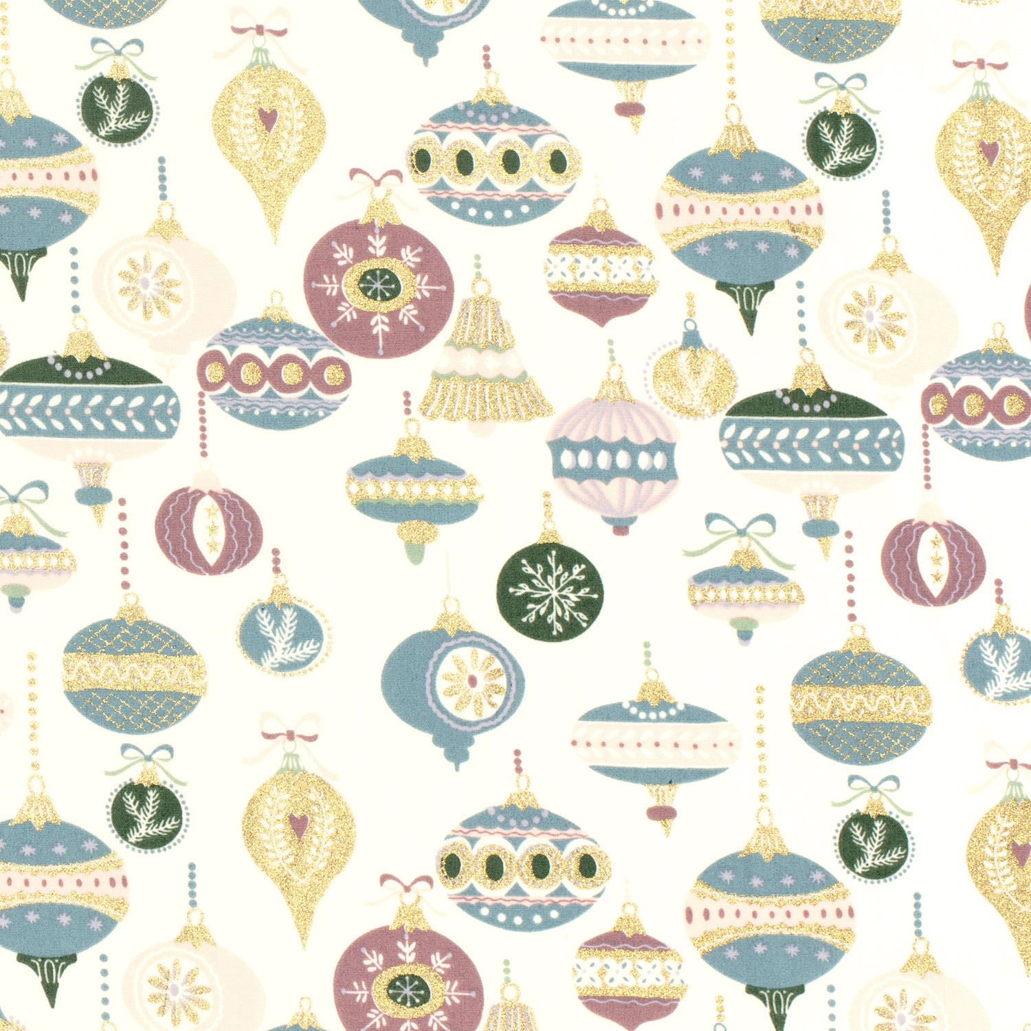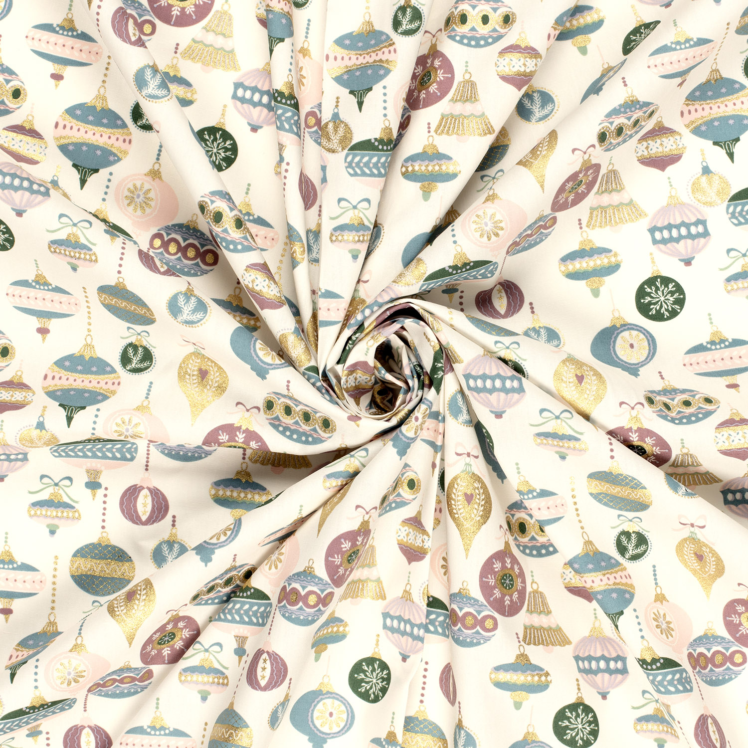 Een feestelijke stofdroom voor de mooiste tijd van het jaar: Op een elegante ecru ondergrond dansen betoverende kerstballen in verschillende vormen en maten, liefdevol versierd met fijne details. Zachte goudtinten en warme, gedempte kleuren geven het ontwerp een stijlvolle en tegelijk gezellige uitstraling – perfect voor een warme kerstsfeer.