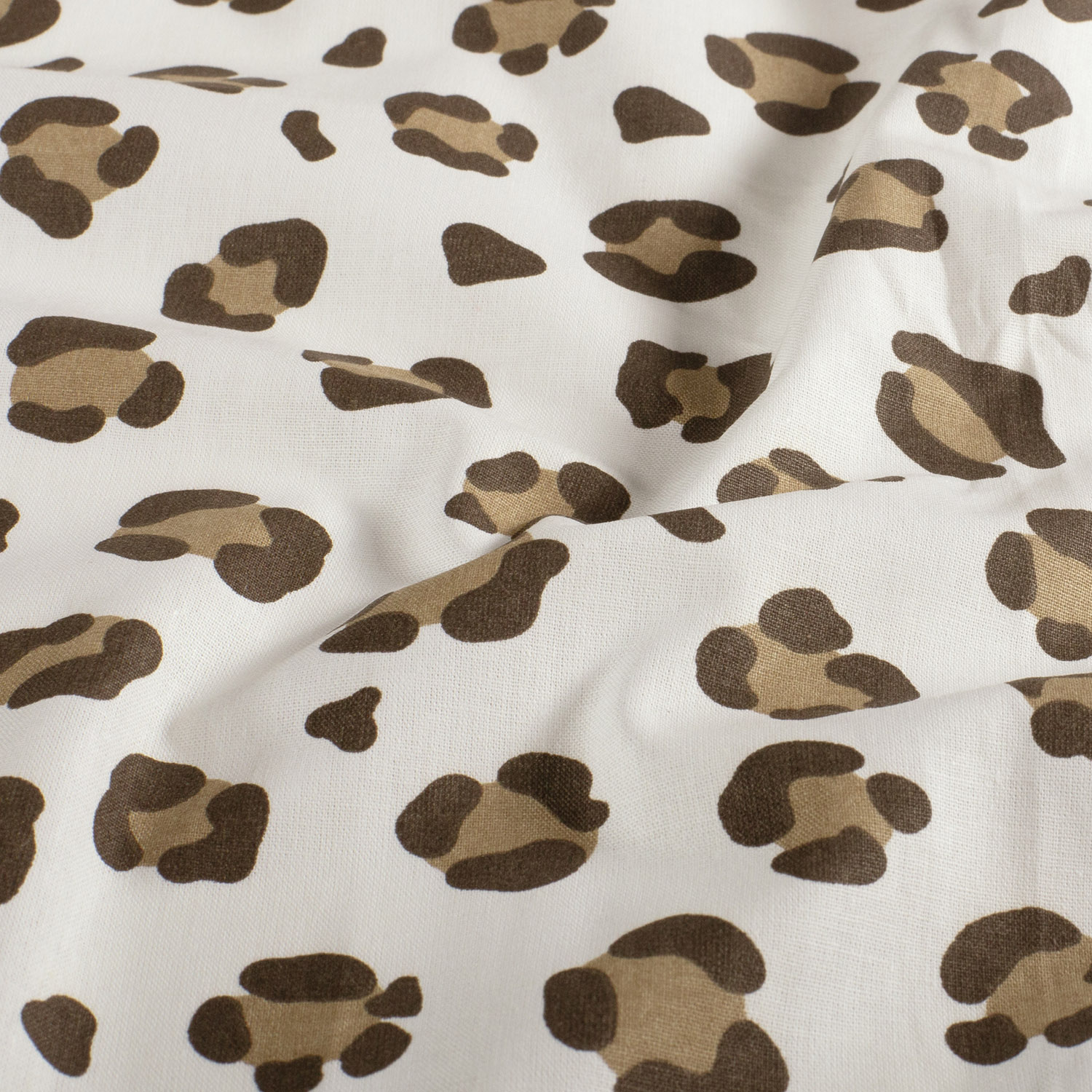 Deze popelinestof brengt met zijn moderne leomotief een stijlvolle vleugje wildheid in je naaiwerken. Op een lichte, crème-beige achtergrond zijn onregelmatige leo-vlekken in warme bruin- en karameltinten verdeeld, subtiel geaccentueerd door zachte grijzige-beige schaduwen.