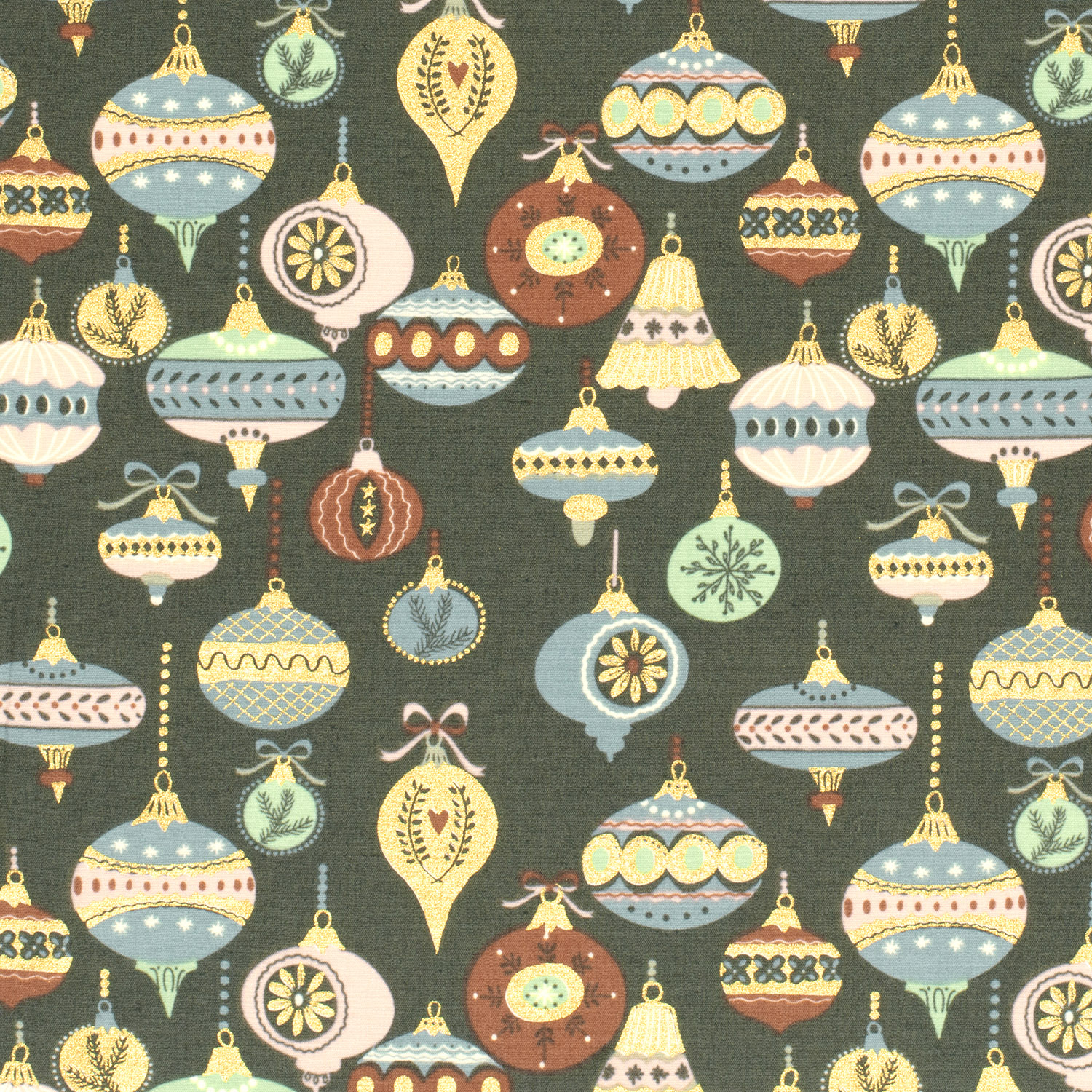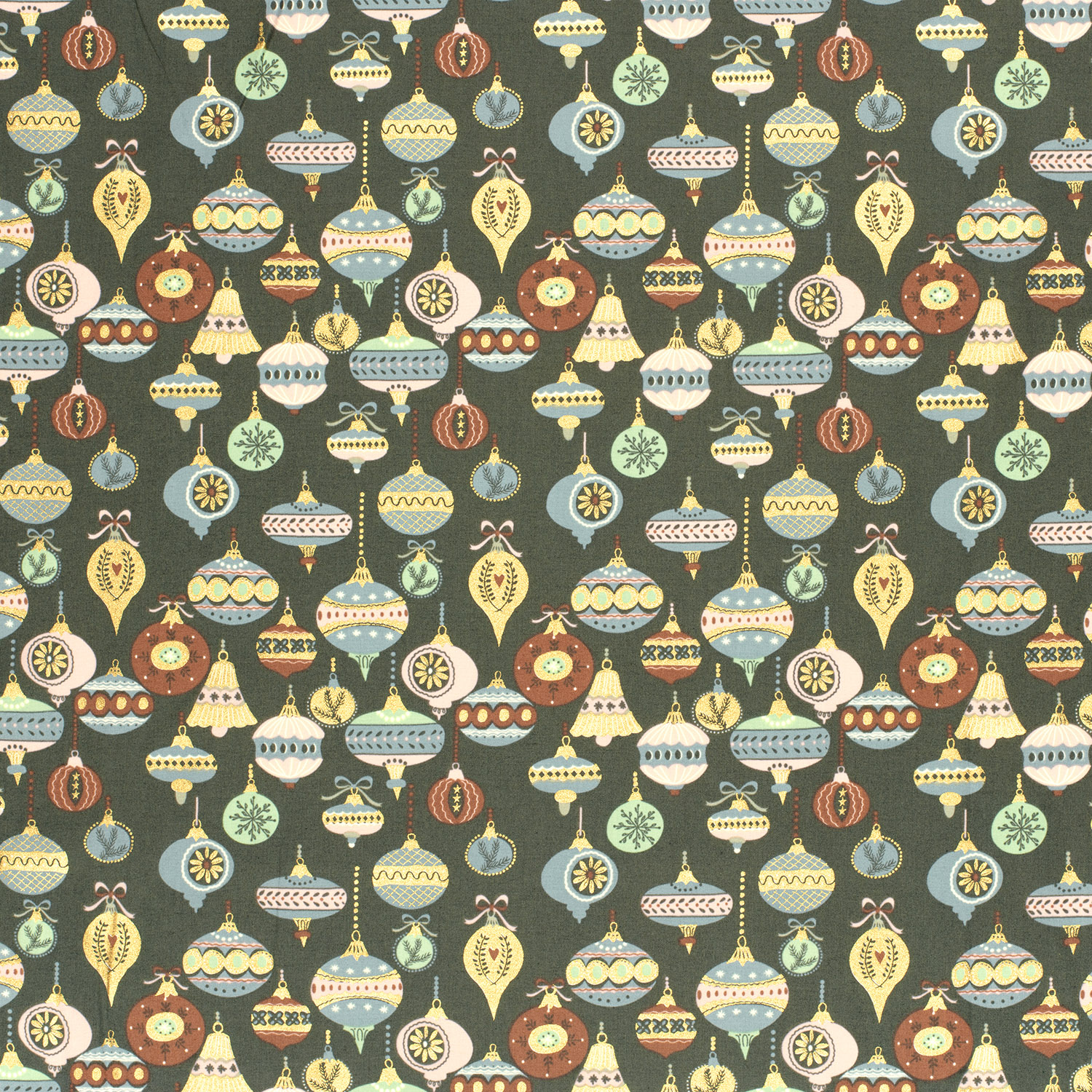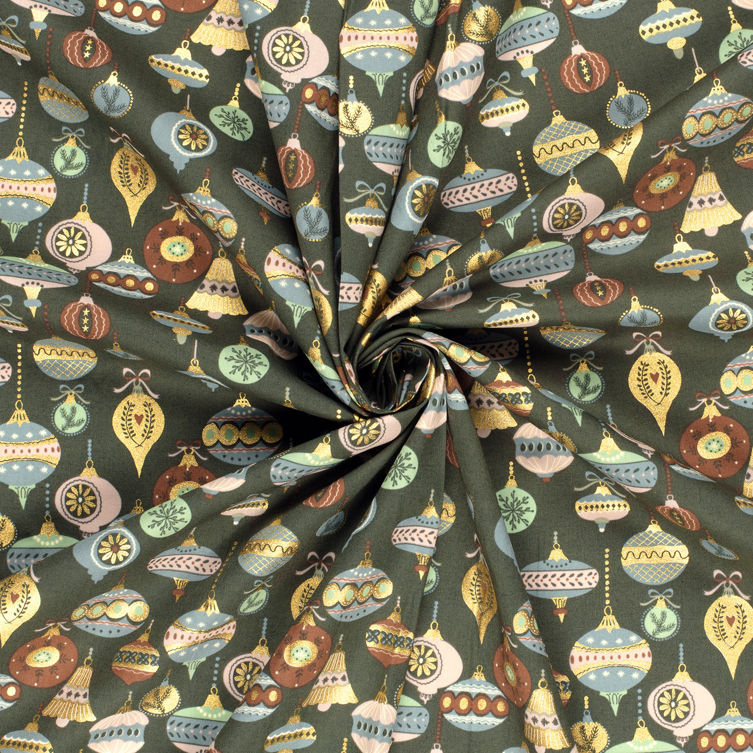 Deze feestelijke stof betovert bij de eerste blik: voor een elegante kaki achtergrond staan stijlvolle kerstballen in een rij – fijn getekend, met liefdevolle details en delicate ornamenten. Gouden accenten laten het ontwerp subtiel glanzen en geven de stof een elegante, kerstachtige uitstraling zonder te speels te zijn.