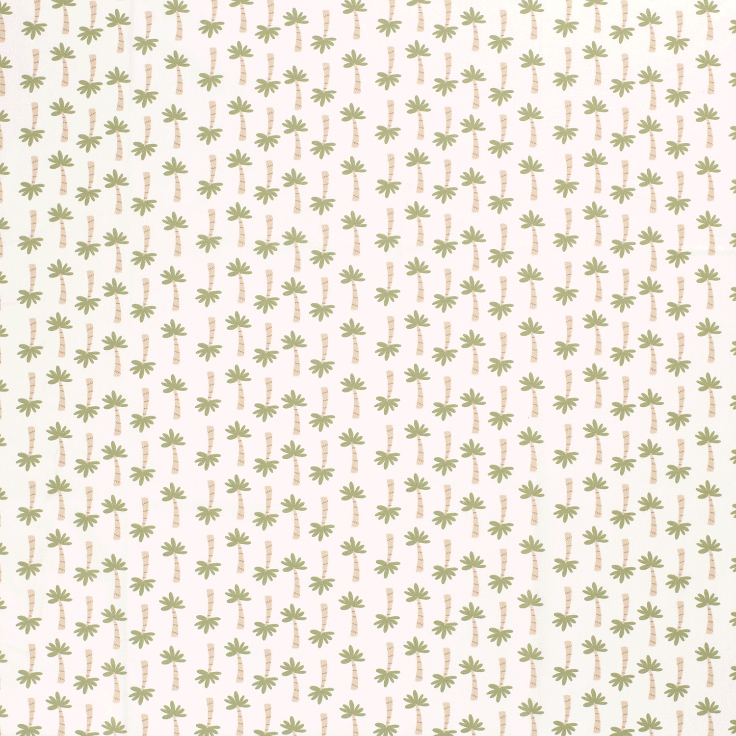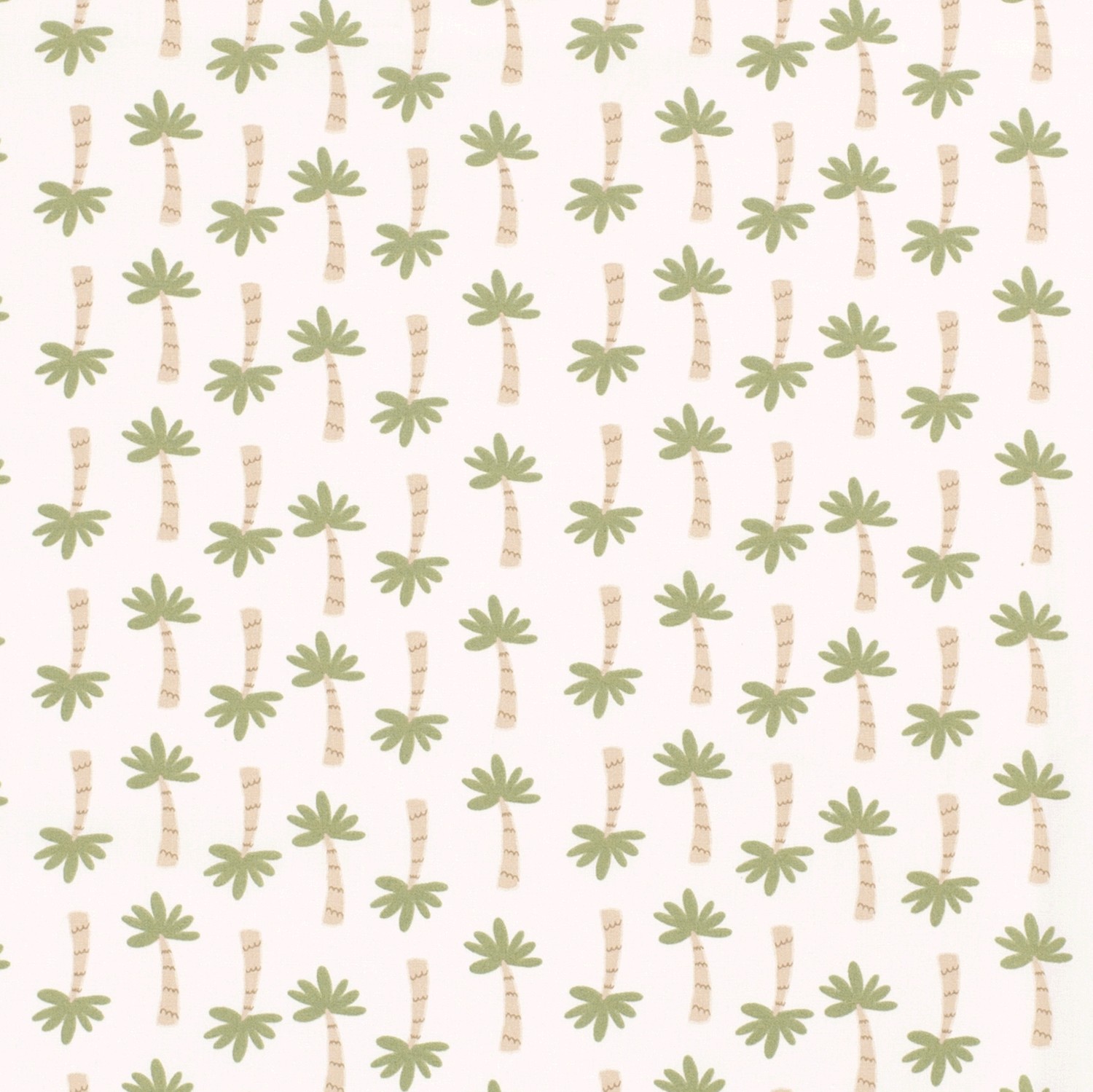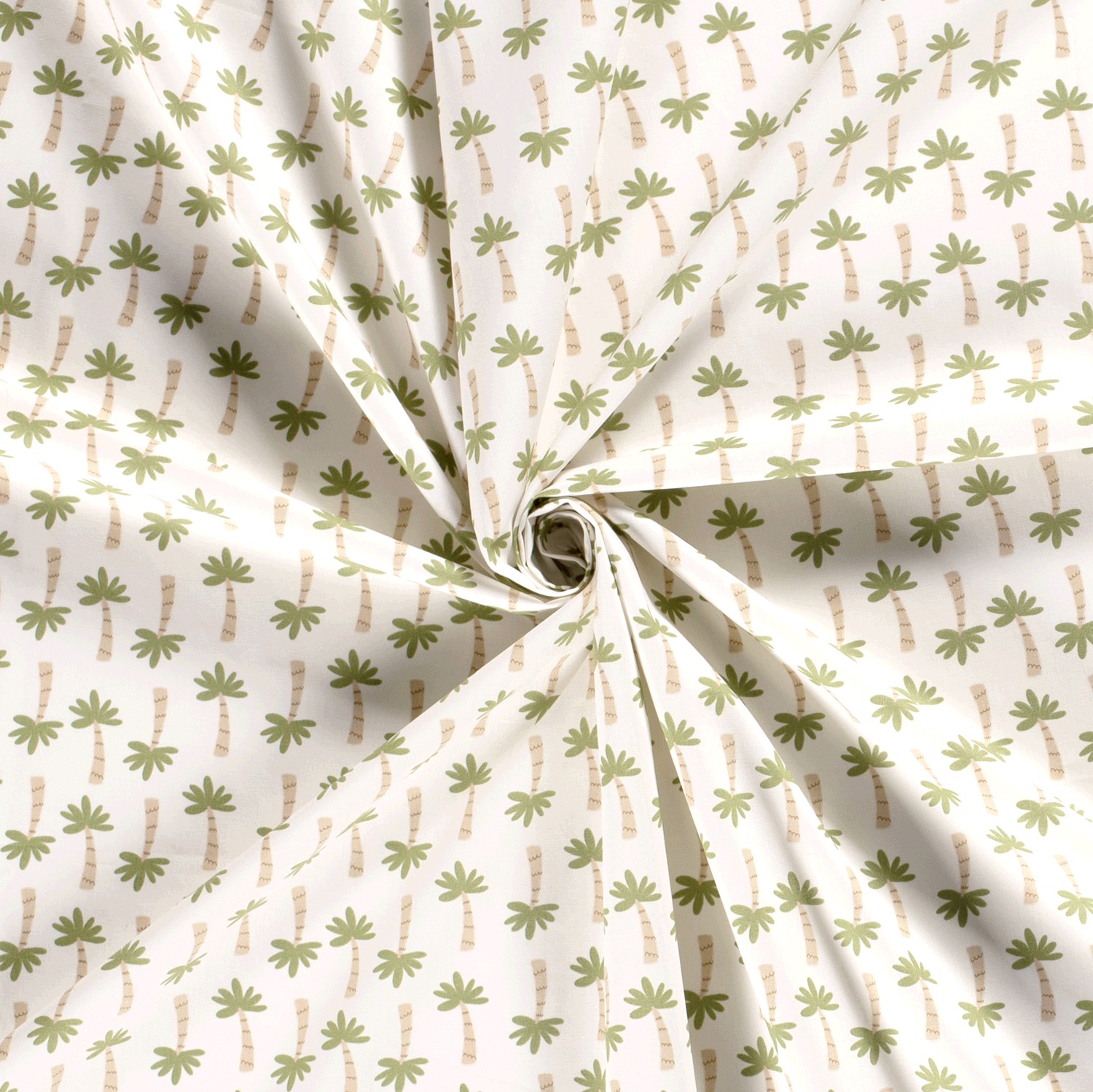 Een vleugje vakantie voor jouw naai-projecten: Op de zacht glanzende offwhite achtergrond spelen gestileerde palmbomen in zachte groentinten, subtiel geaccentueerd met fijne, donkerdere details. Het ontwerp oogt modern en tegelijk natuurlijk – als een zonnige wandeling langs een met palmbomen omzoomde boulevard.