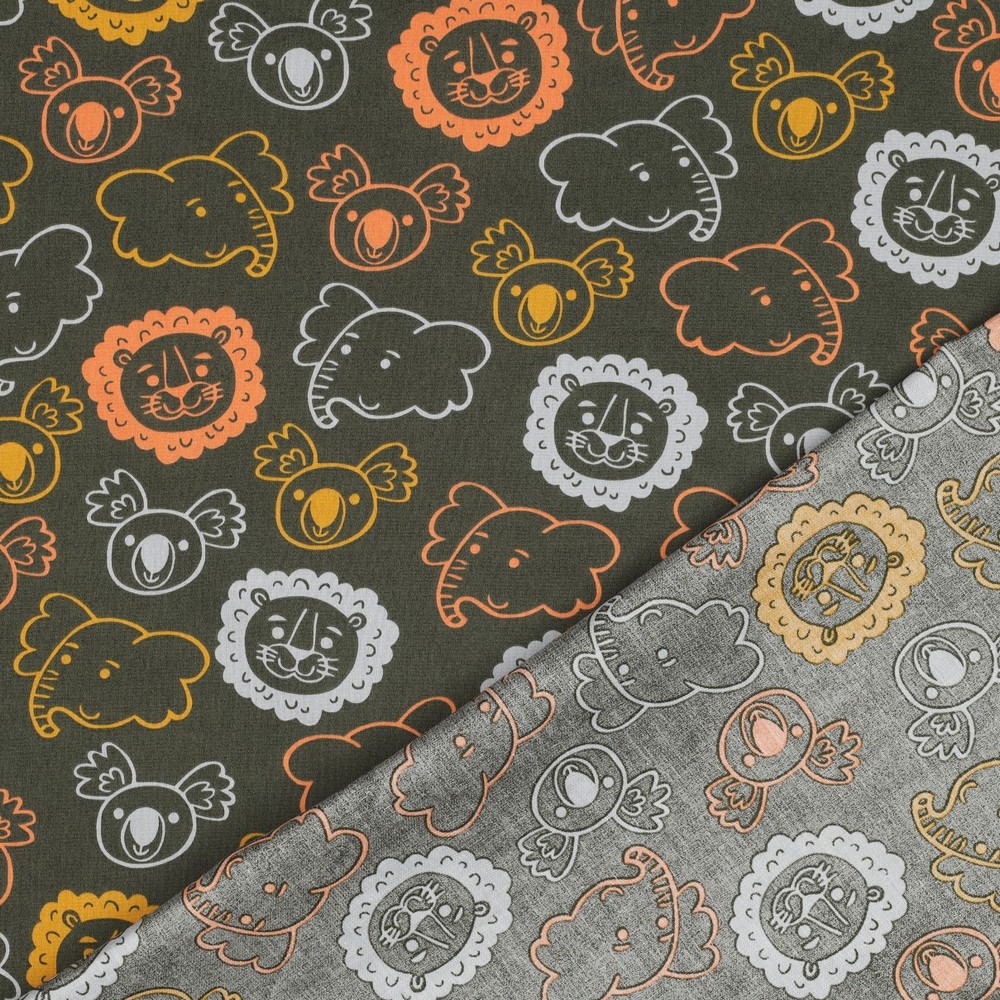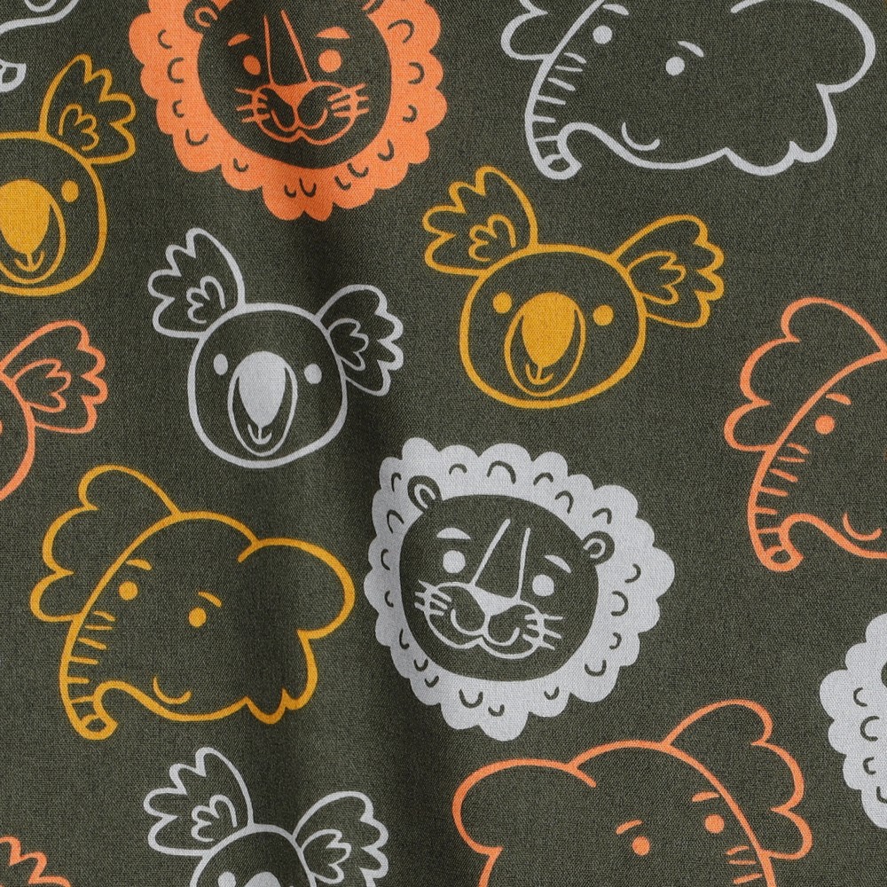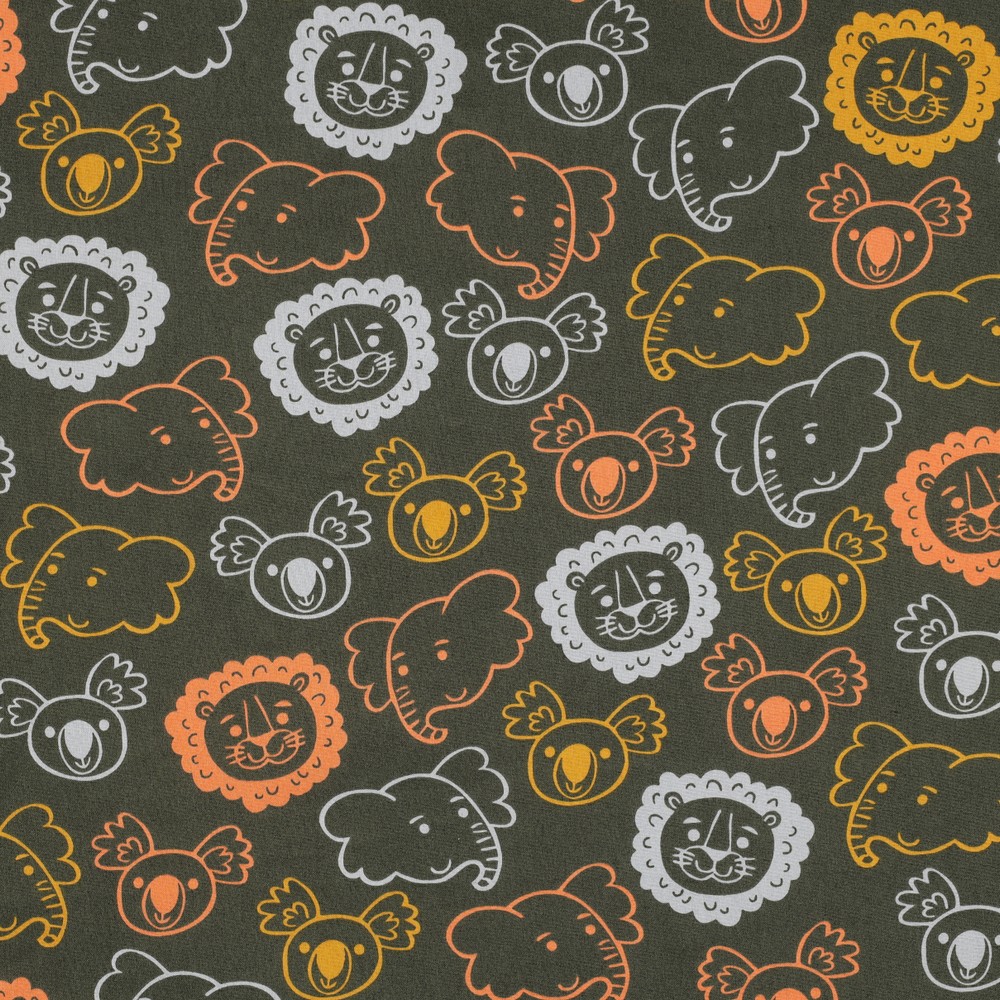 Met deze stof breng je het safariavontuur naar je naaikamer! Liefdevol geïllustreerde safaridieren dartelen op een diepe, legergroene achtergrond: majestueuze leeuwen, vrolijke zebra's, nieuwsgierige giraffen en olifanten, plus kleine vogels en fijne details die het ontwerp tot leven brengen.