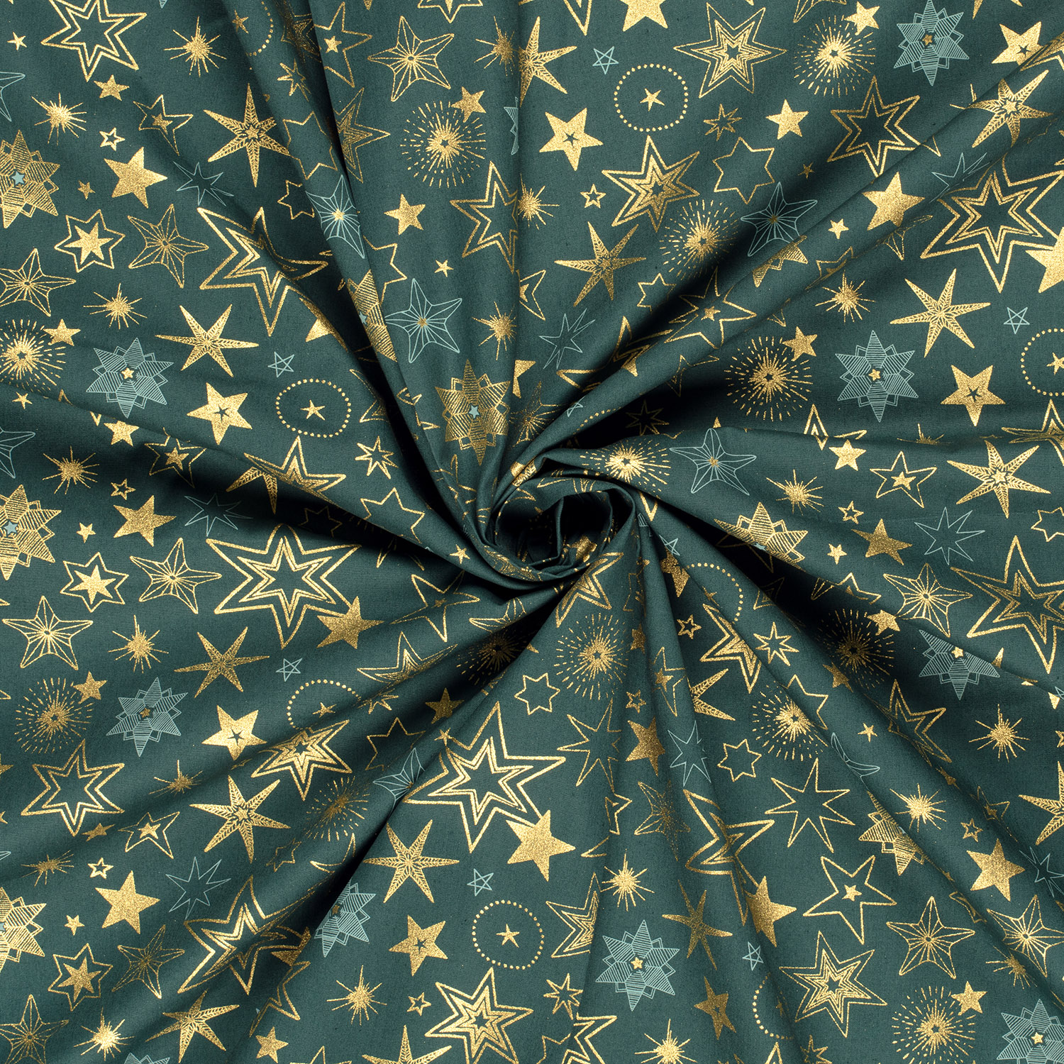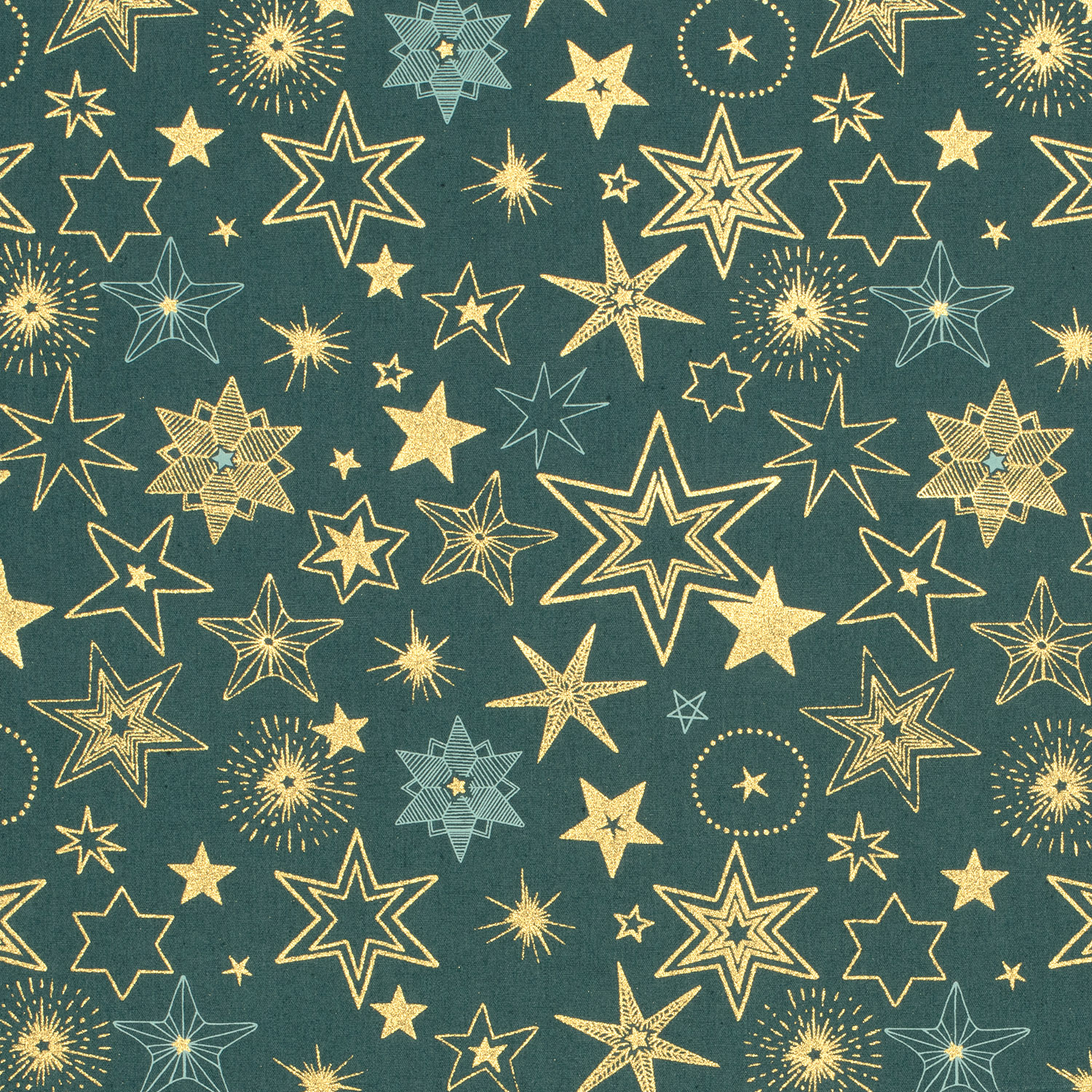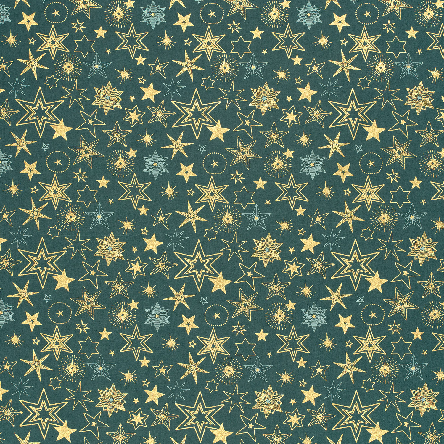 Een vleugje sterrenmagie voor je naaiprojecten: Ontelbare sterren in warm goud en delicaat wit schitteren op diep petrol - soms groot en opvallend, soms klein en speels. Het harmonieuze kleurenspel is zowel elegant als modern en maakt deze stof tot een echte blikvanger.