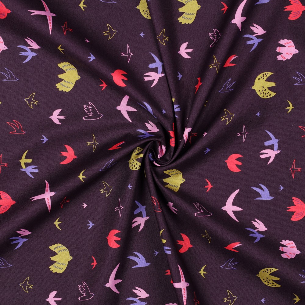 Een stof als een wandeling in de schemering: op een diep bordeauxrode achtergrond dartelen tere, gestileerde vogels in warme natuurtinten. Fijne lijnen, kleine stipjes en liefdevolle details geven het ontwerp een speelse en tegelijk elegante uitstraling.