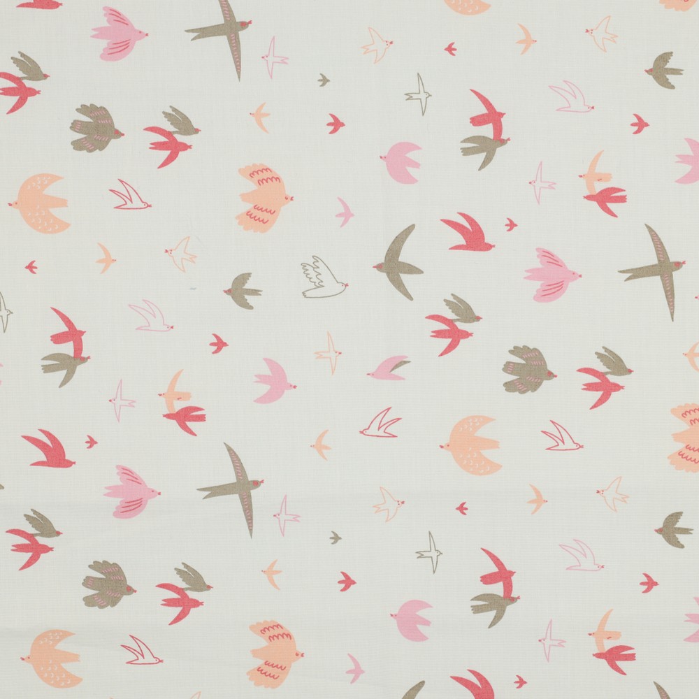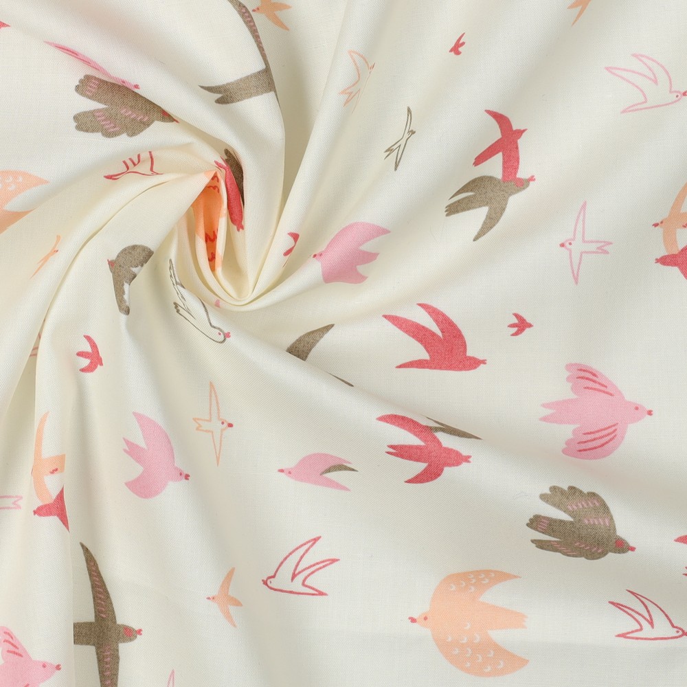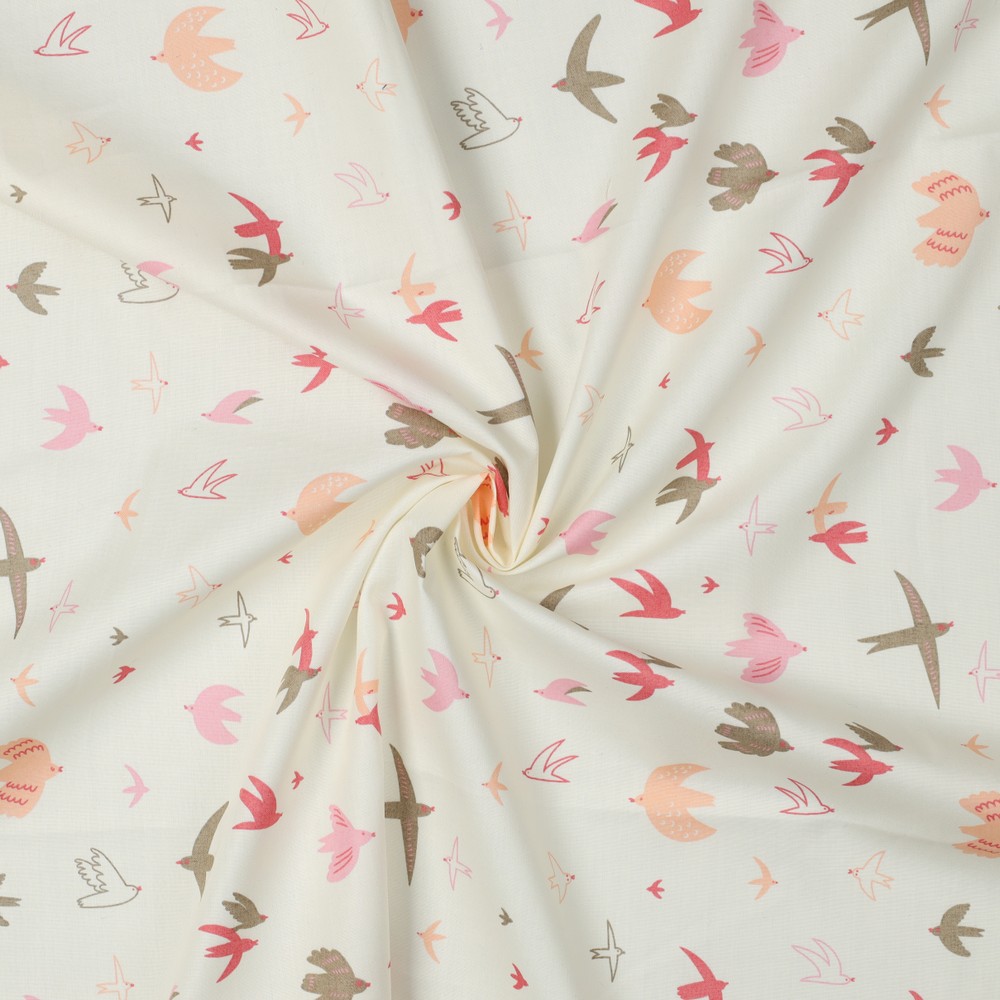 Een zachte stofdroom in natuurtinten: Op de warme ecru achtergrond dartelen liefdevol geïllustreerde vogels in zachte blauw-, bruin- en beigetinten, subtiel geaccentueerd met fijne details. Het ontwerp is tegelijk speels en stijlvol – als een kleine, rustige vogelwereld die zich over de hele stof uitstrekt.