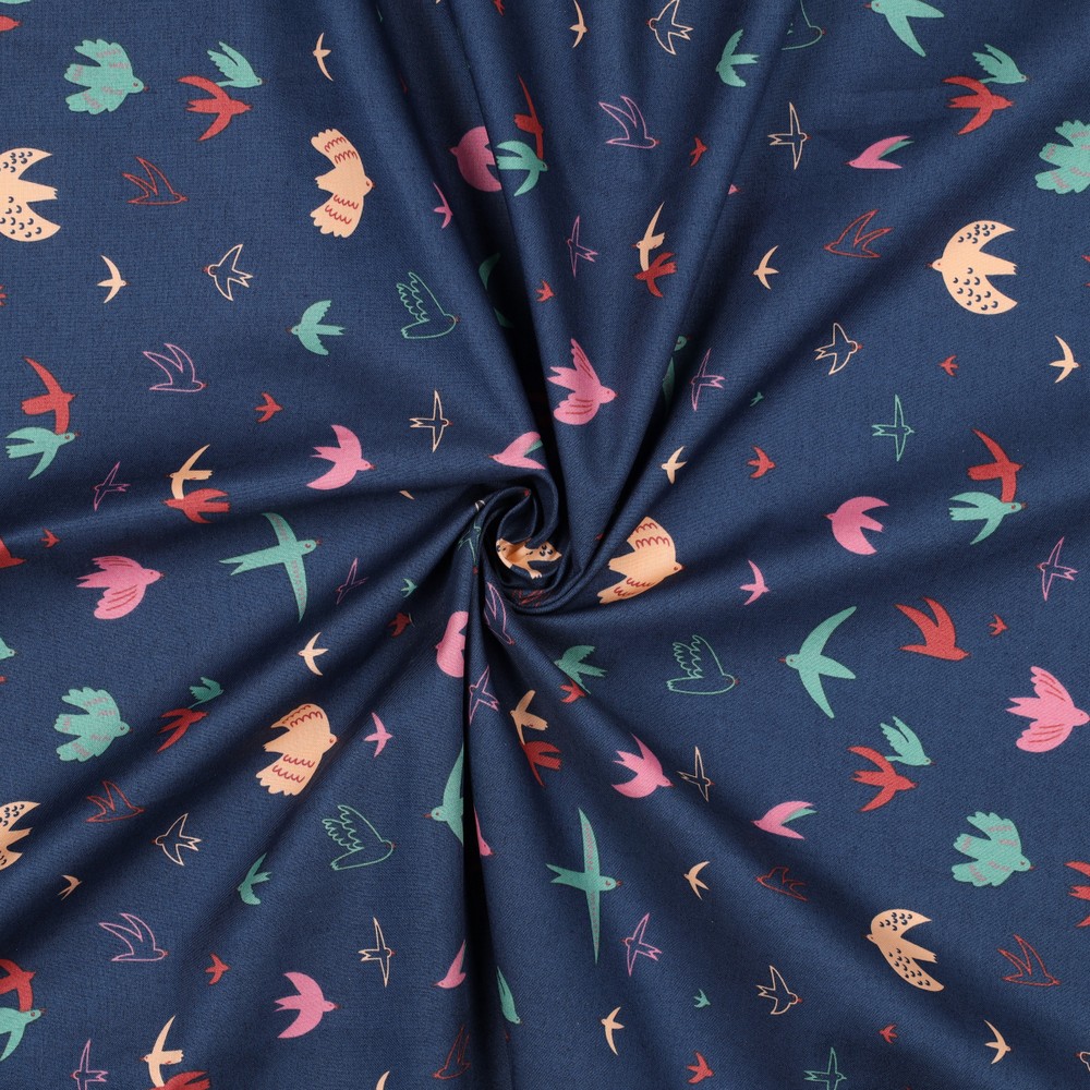 Of het nu gaat om luchtige blouses, betoverende kinderkleding, stijlvolle woontextiel zoals kussenhoezen of liefdevolle accessoires – dit vogelmotief zet een smaakvolle accent zonder opdringerig te zijn. De stof laat zich uitstekend combineren, bijvoorbeeld met effen stoffen in crème, zand, navy of gedempte natuurtinten, en past zowel in moderne als in Scandinavisch geïnspireerde looks.