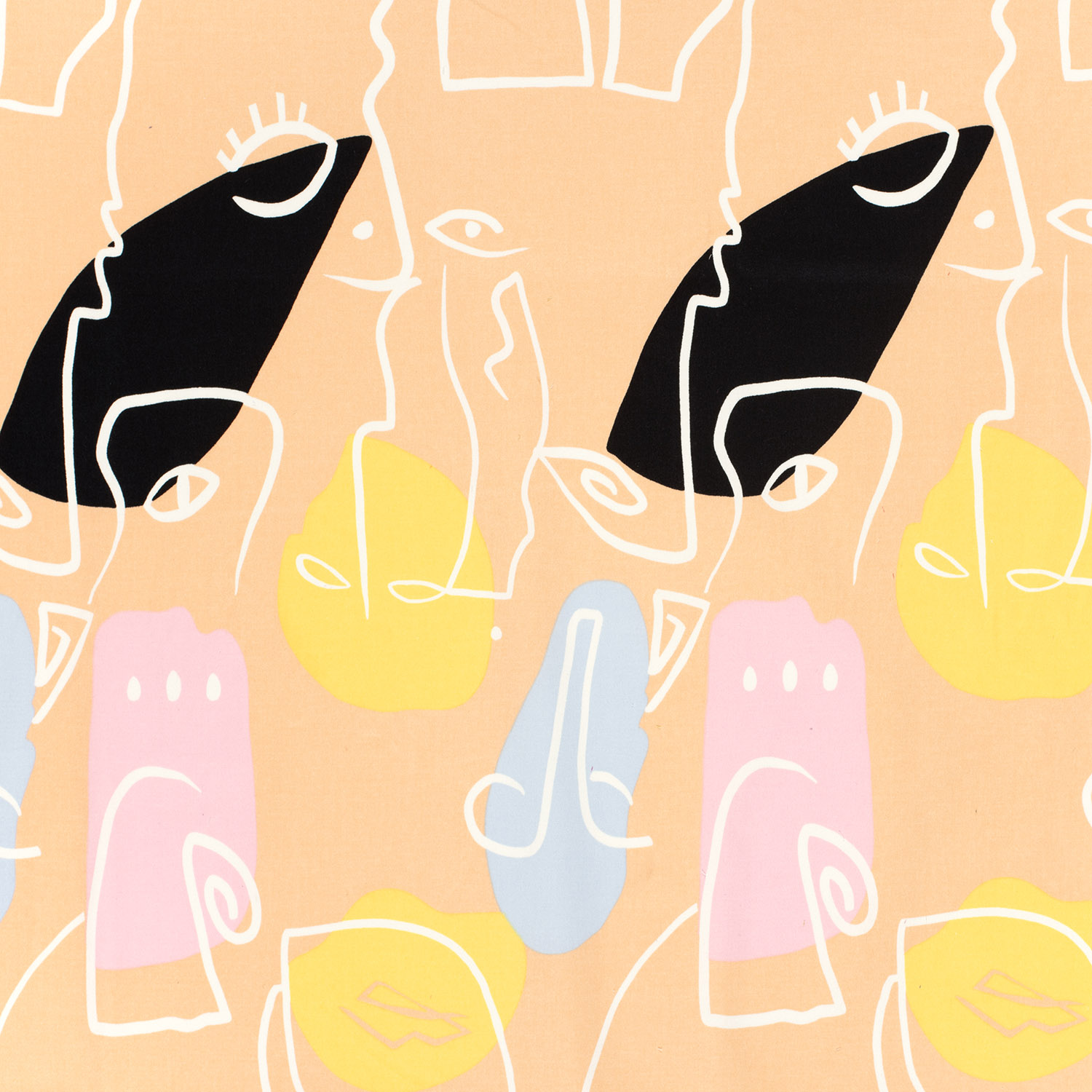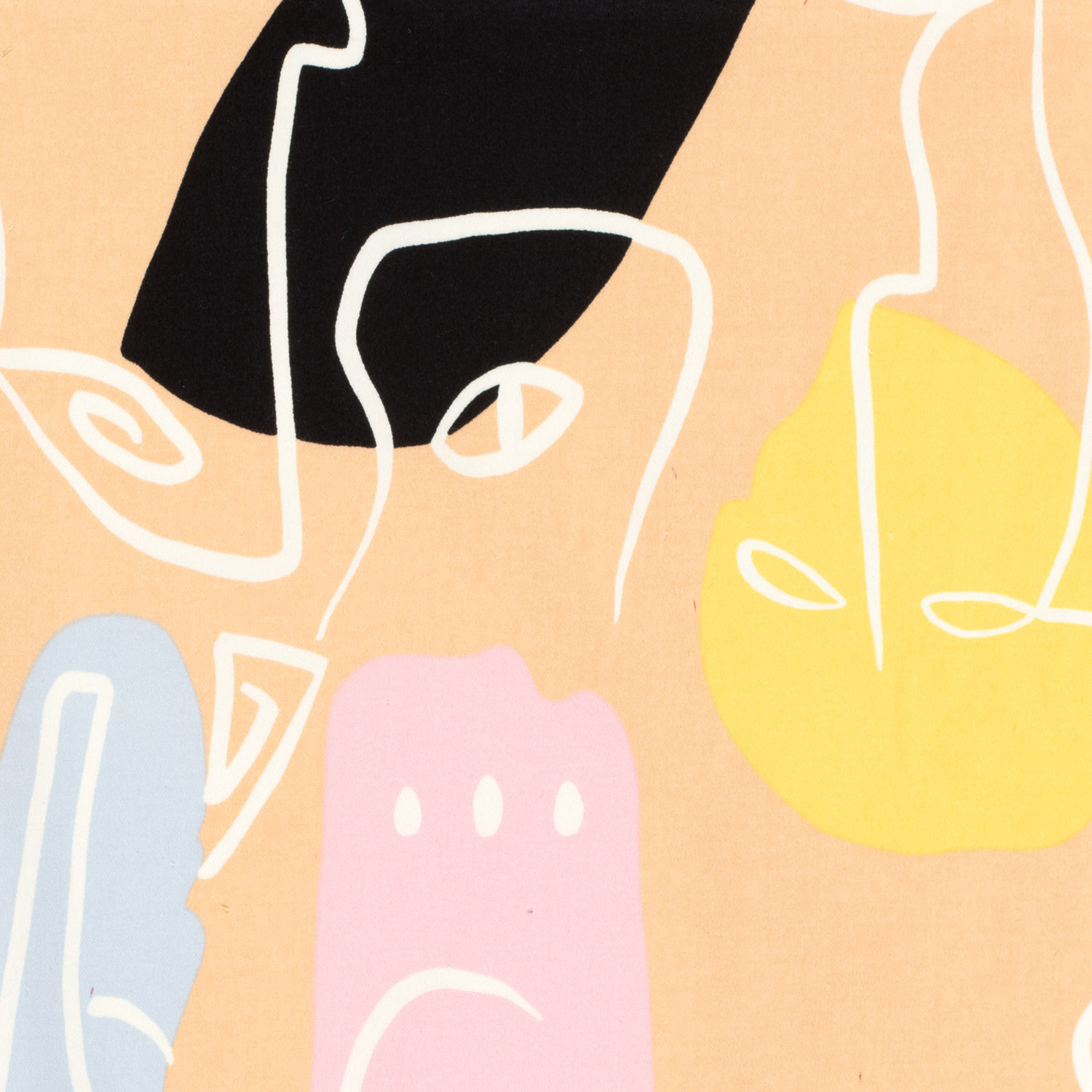 Een stof als een klein kunstwerk: op een zacht zalmkleurige achtergrond staan gestileerde gezichten op een rij – soms alleen met fijne contouren, soms getekend met expressieve, donkere lijnen. De illustraties lijken spontane schetsen uit een kunstenaars schetsboek en geven het ontwerp een moderne, licht speelse uitstraling.