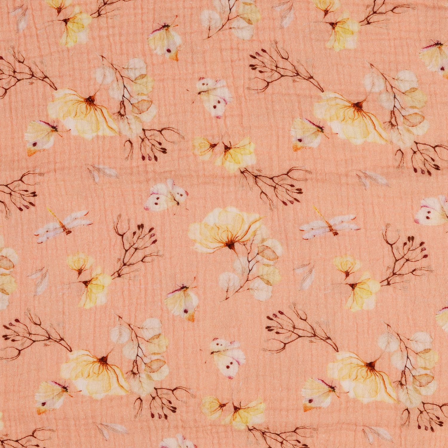 Zachte lentemagie op musselin: Op een warme abrikooskleur slingeren fijne kersenbloesemtakken over de stof, liefdevol getekend met kleine bloemetjes in roze- en crèmetinten. Tussen de takken dartelen gedetailleerde vlinders en fijne libellen, die het ontwerp een speels en levendig accent geven. Zachte groentinten van de bladeren zorgen voor frisse accenten en laten het geheel harmonieus en natuurlijk overkomen.