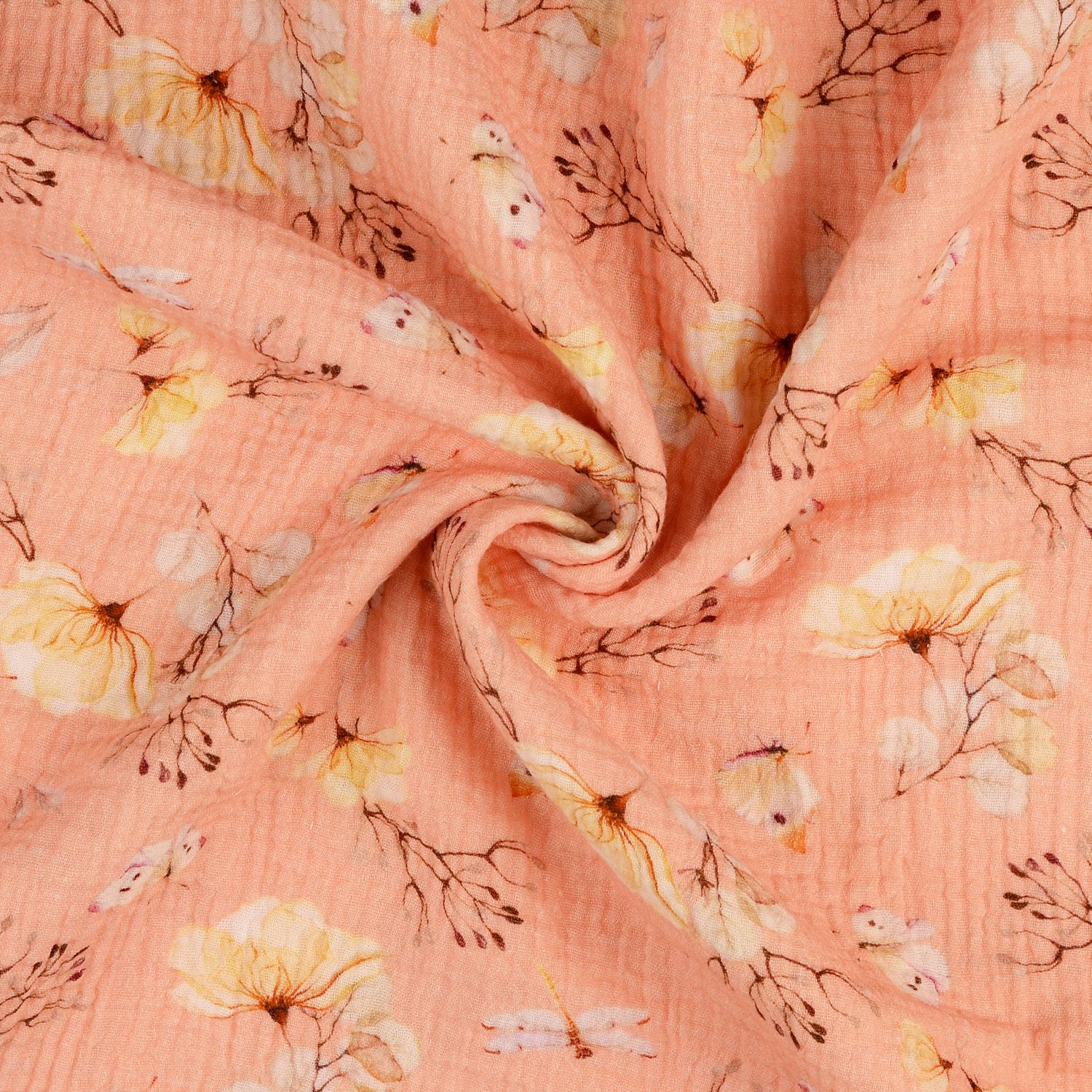Of het nu is voor kleine dagdromers of grote romantici – deze musselin met kersenbloesemtakken en vlinders in abrikooskleur wordt snel de favoriete stof voor zachte, vrouwelijke en comfortabele kledingstukken.