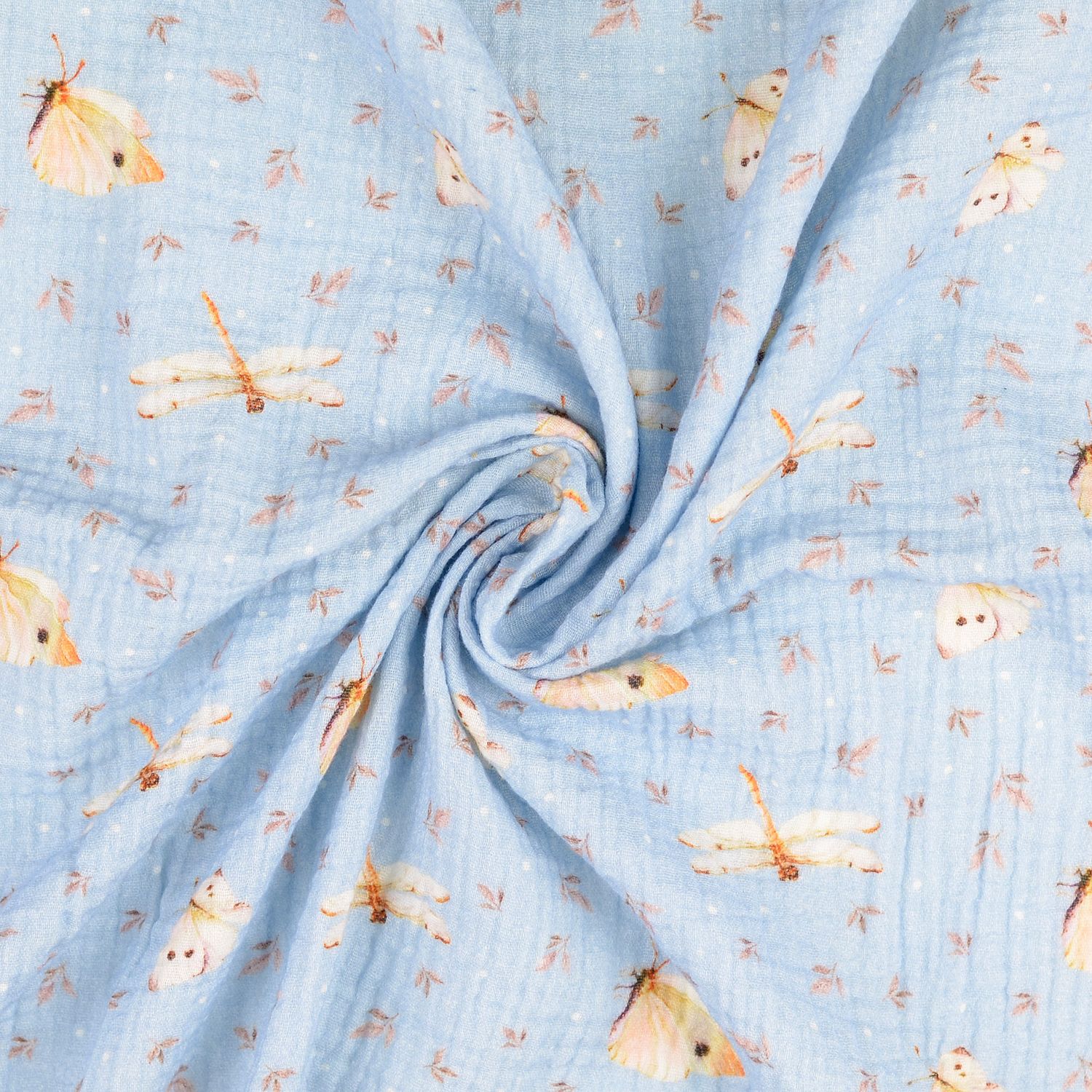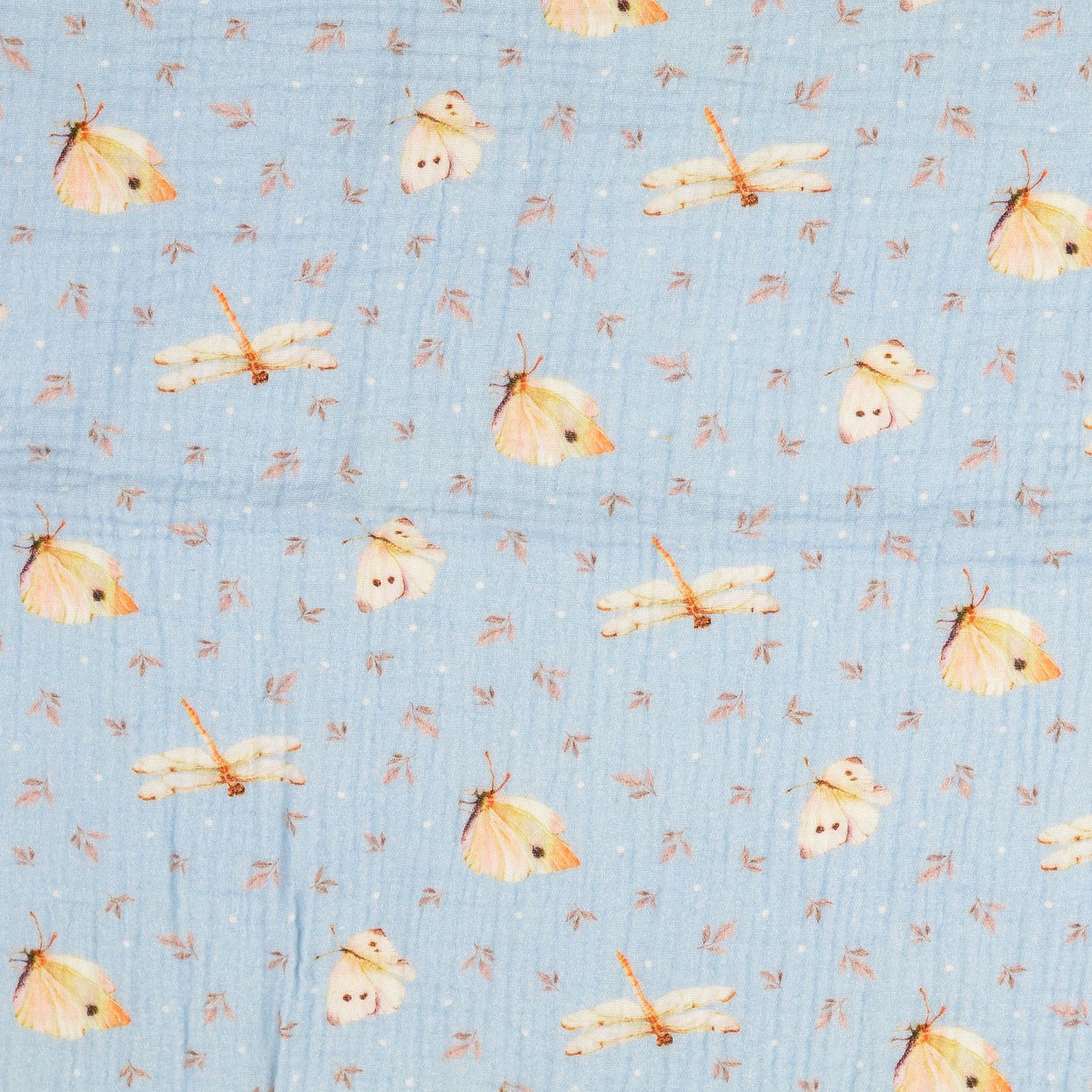 Zachte hemelsblauwe tint ontmoet een fijn natuurmotief: Op deze musselin dansen gedetailleerd getekende libellen en vlinders tussen fijne bladeren. De insecten zijn liefdevol vormgegeven in zachte kleuren – van zacht beige en bruin tot gedempte blauw- en groentinten – en lijken lichtjes over de stof te zweven.