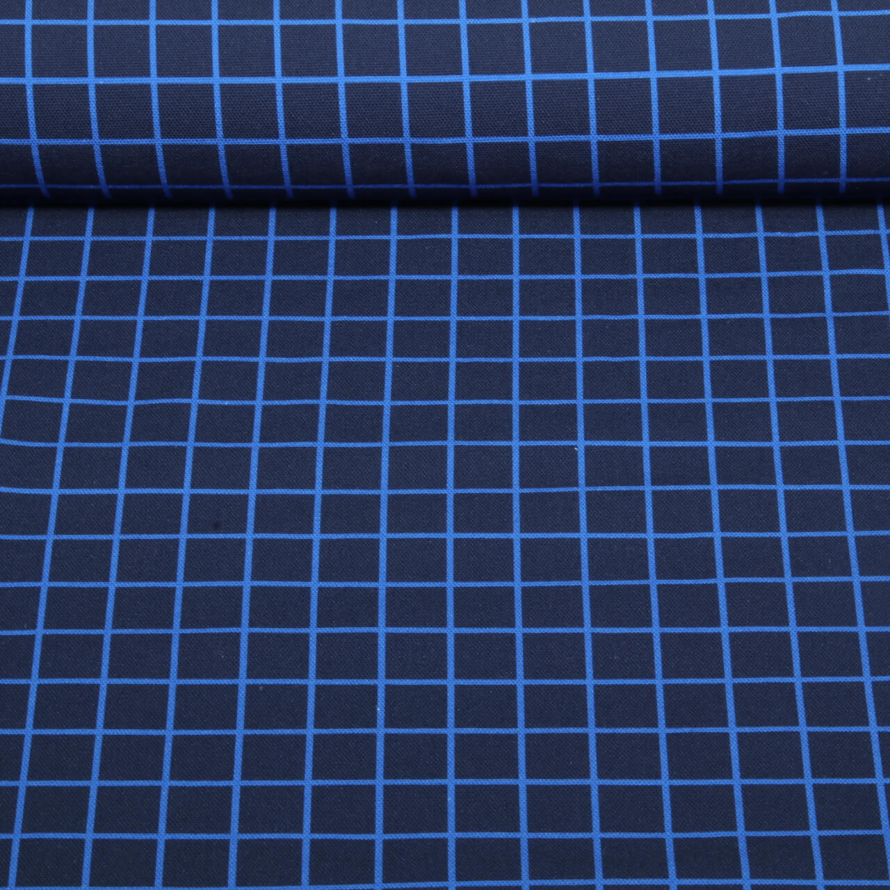 Een stof als een kleine avonturentuin: liefdevol geïllustreerde insecten en insecten in vrolijke kleuren dartelen op een diep donkerblauwe achtergrond. Fijne, lichtgekleurde rasterlijnen geven het ontwerp een moderne, grafische structuur, terwijl de gedetailleerde griezelige beestjes in rood, geel, groen en blauw levendig opvallen.