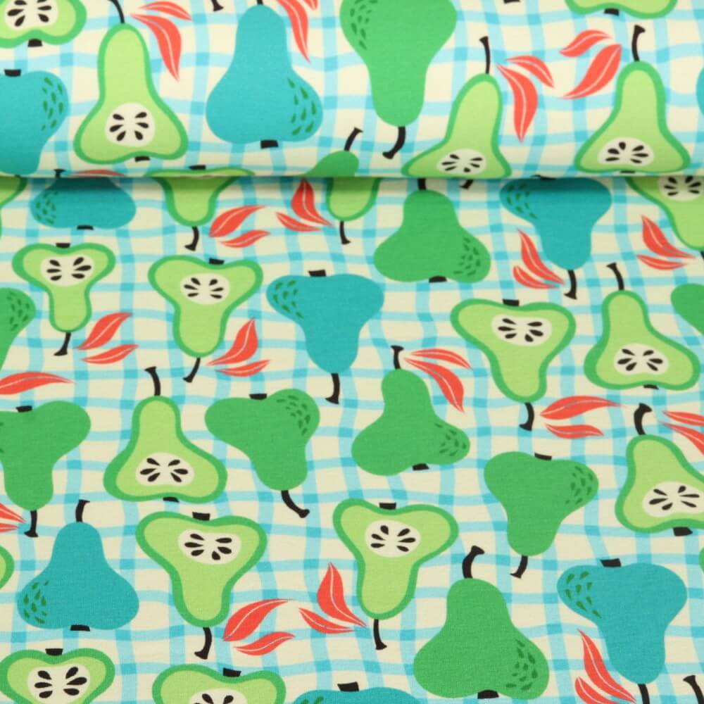 Fris, fruitig en gewoon heerlijk: deze prachtige tricot brengt een zomerse picknickstemming rechtstreeks naar je naaikamer. Gestileerde peren in delicate geel- en crèmetinten dartelen op de levendige, weelderig groene achtergrond, liefdevol geaccentueerd met kleine blaadjes en fijne details. Het moderne, grafische ontwerp heeft een speelse maar heldere en overzichtelijke uitstraling - perfect voor iedereen die van vrolijk maar niet kitscherig houdt.
