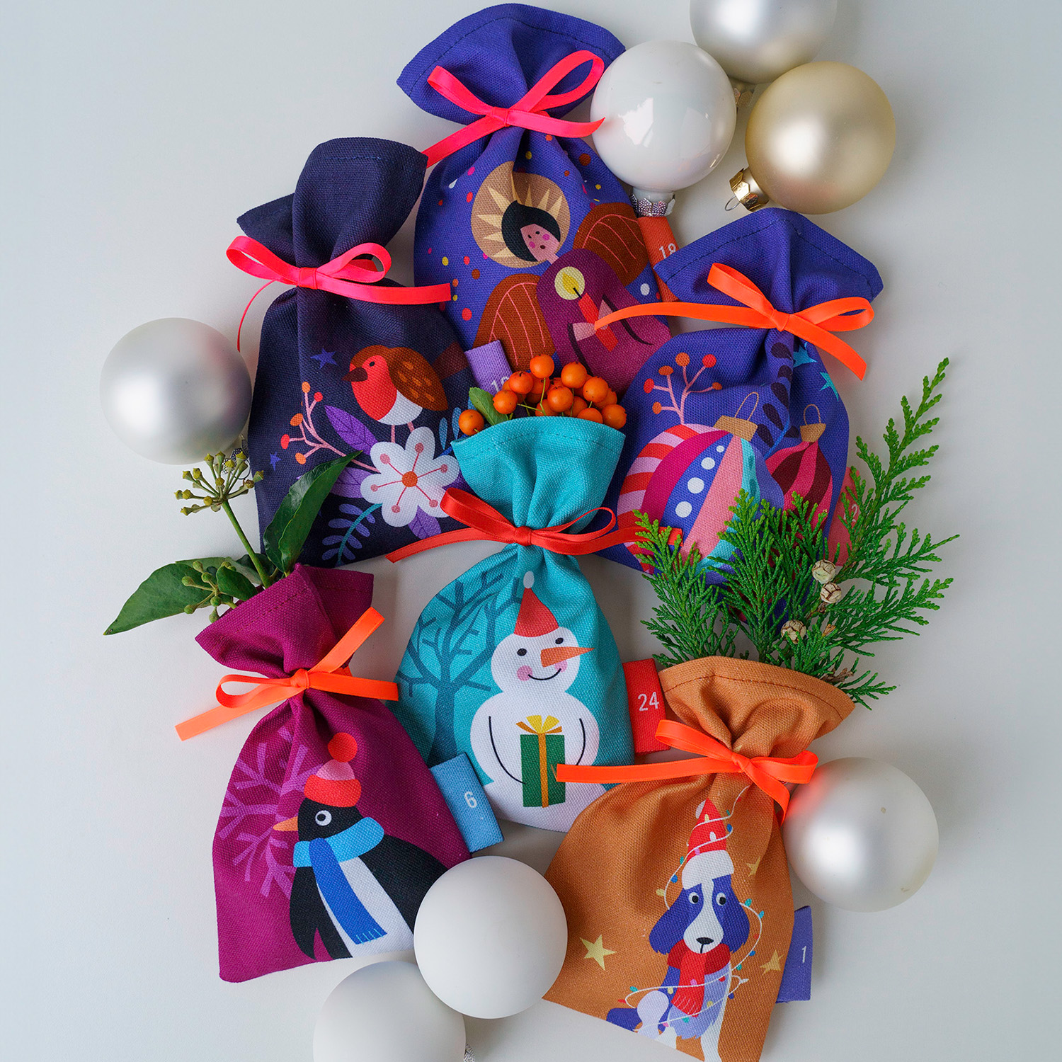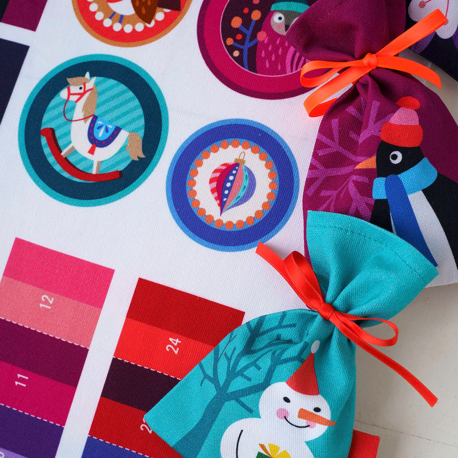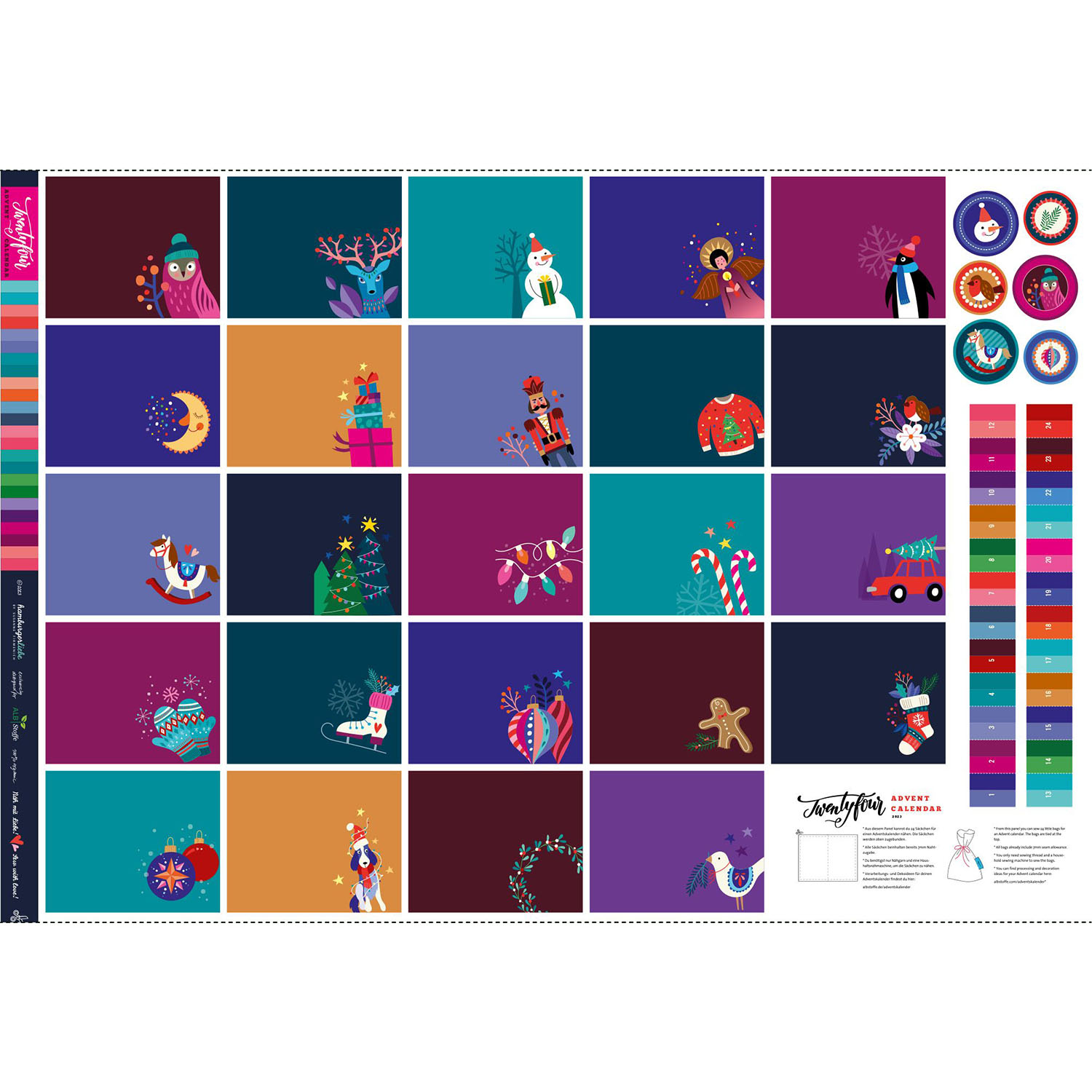 Je kunt 24 adventskalenderzakjes uit het paneel naaien, die je naar hartenlust kunt vullen en elk jaar opnieuw kunt gebruiken. Aan een lichtsnoer, op een tak of decoratief aan de muur - de kleurrijke zakjes zijn gegarandeerd een blikvanger in je kerstdecoratie.
