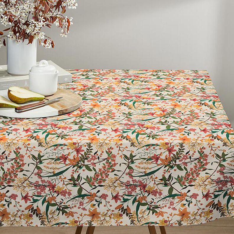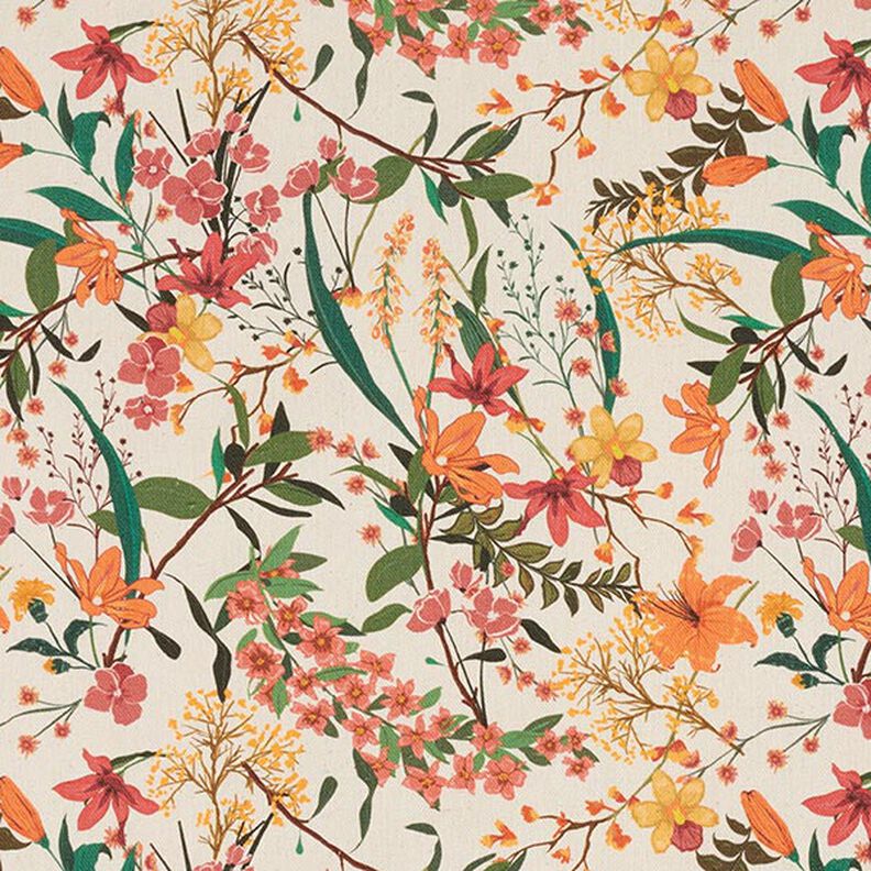 Deze prachtig bedrukte half panama voelt aangenaam glad aan. Het weefsel met linnenbinding is heel sterk en door zijn materiaal heel onderhoudsarm.