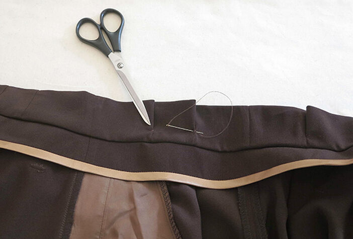 Ten slotte worden de plooien vastgenaaid met een handsteek op een afstand van 3,5 cm van de bovenrand aan de binnenzijde op de naadtoeslag. Zo blijven ze beter in model en voorkom je dat ze verschuiven. Zorg ervoor dat de handsteek aan de buitenkant van de broek niet zichtbaar is!