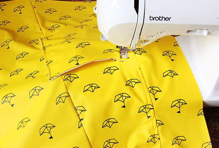 Naai de zijkanten van de capuchon aan het middenstuk. Vouw de naadtoeslagen naar binnen en stik de naad op voetjesbreedte. Doe hetzelfde voor de capuchondelen uit de voeringstof, maar strijk hier de naadtoeslagen uit elkaar. Naai de capuchons aan elkaar en plaats een ringetje.