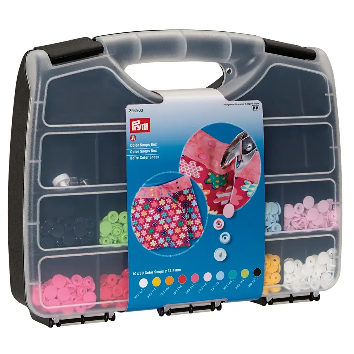 Deze praktische Prym Snaps Box is je kleurrijke alleskunner voor alle naai- en doe-het-zelfprojecten met drukknopen. In de stevige opbergdoos zitten talloze kleurrijke "Color Snaps" om tassen, kleding, accessoires, baby- en kinderkleding of decoratieve ideeën mee te versieren.