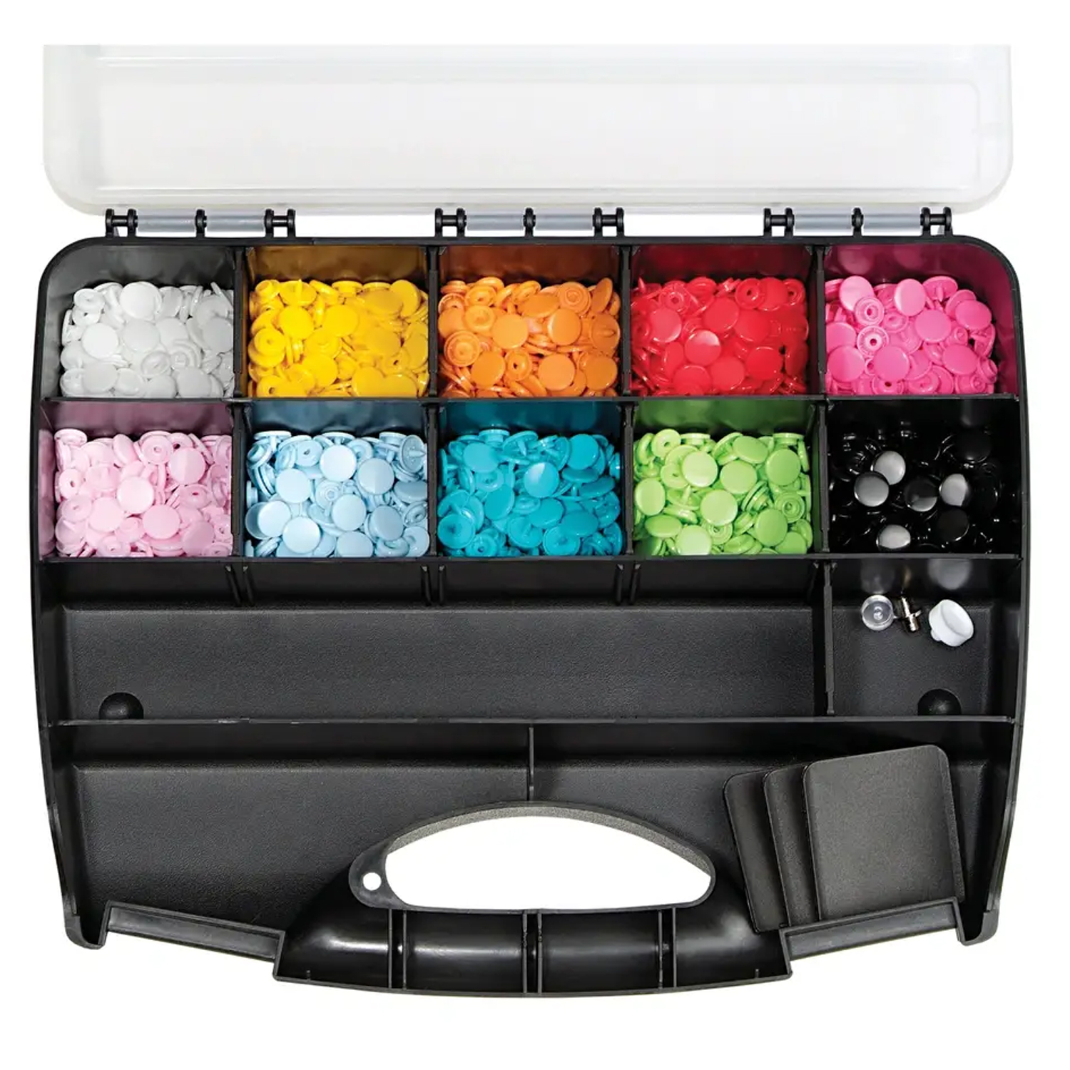 De doos is duidelijk verdeeld in vakken: Je ontvangt een veelzijdige reeks Color Snaps in verschillende, felle kleuren - elk gesorteerd en klaar voor gebruik. Er wordt ook een bijpassende gereedschapsset meegeleverd, zodat je je drukknopen gemakkelijk kunt bevestigen.