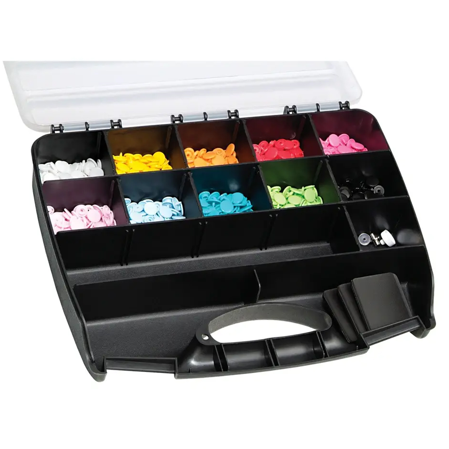 Bijzonder praktisch: sommige vakken zijn vrij en bieden ruimte voor je Prym VARIO tang en andere accessoires. Zo heb je alles wat je nodig hebt voor je drukknopenprojecten netjes opgeborgen op één plek en altijd snel bij de hand.