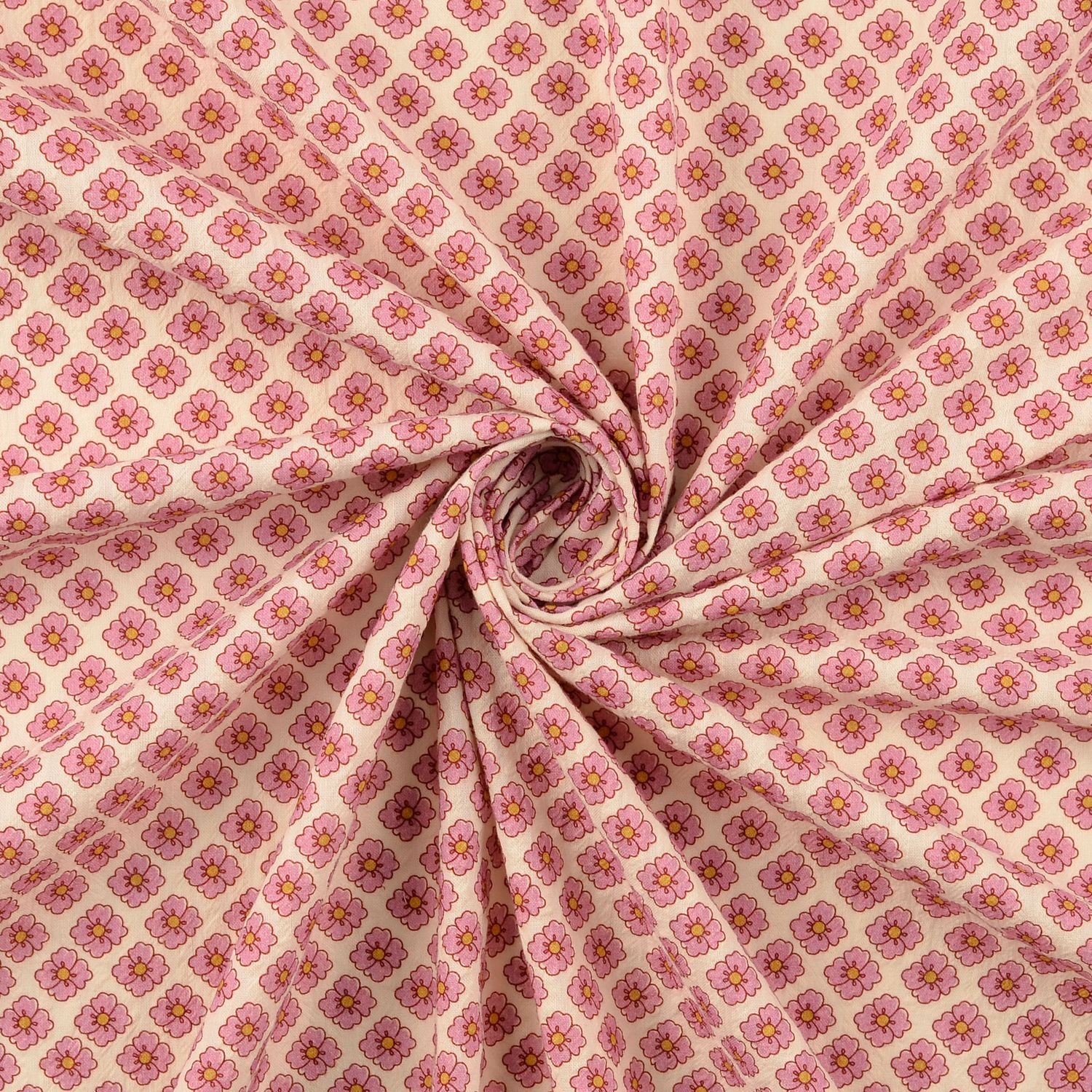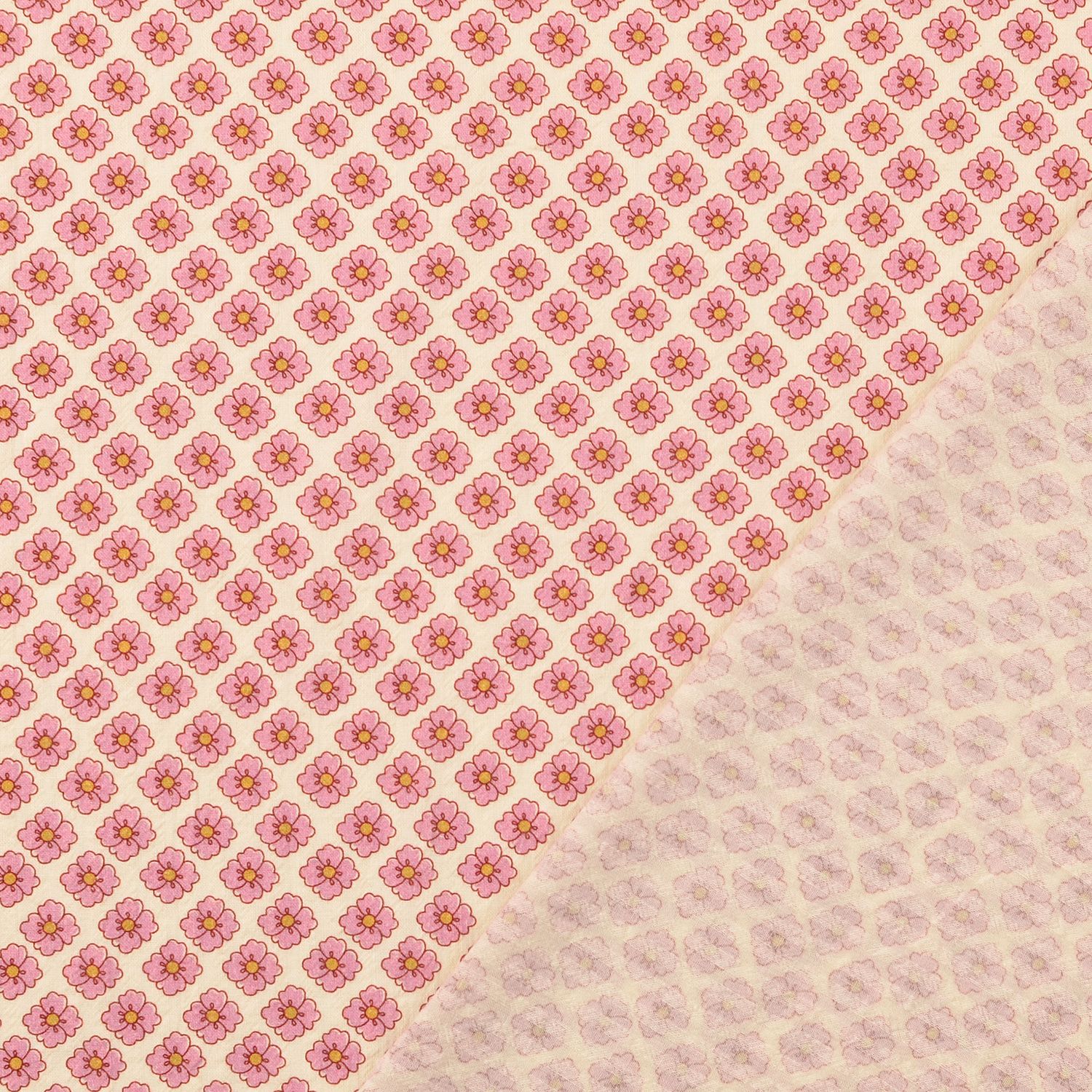 Een vleugje nostalgie voor je naai-projecten: Deze seersucker met een fijn vintage bloemmotief betovert bij de eerste blik. Speelse bloemen in zachte roze- en bessentinten ontmoeten fijne groene bladeren en ranken die zich harmonieus over de lichte, vriendelijke achtergrond verspreiden.