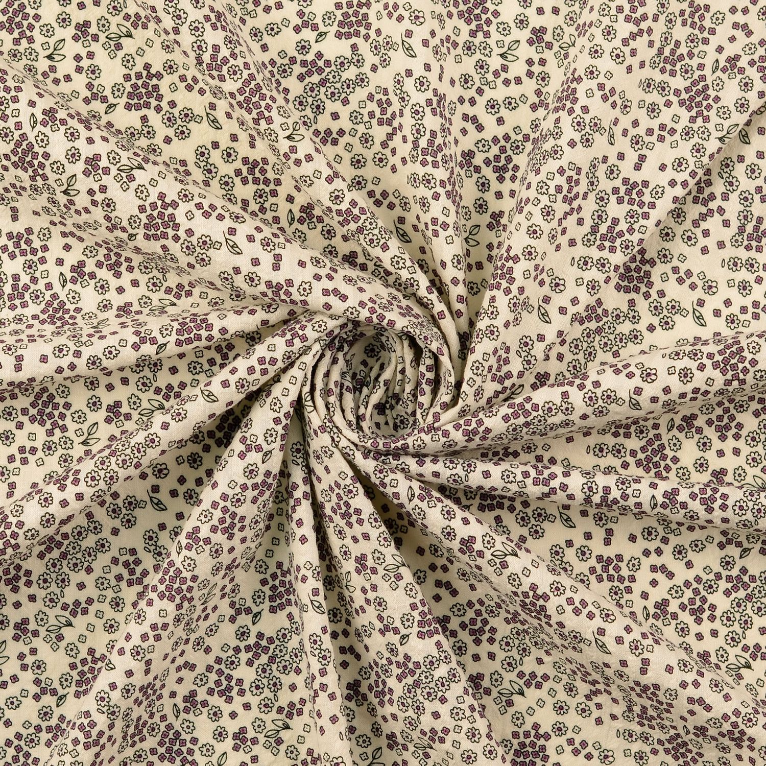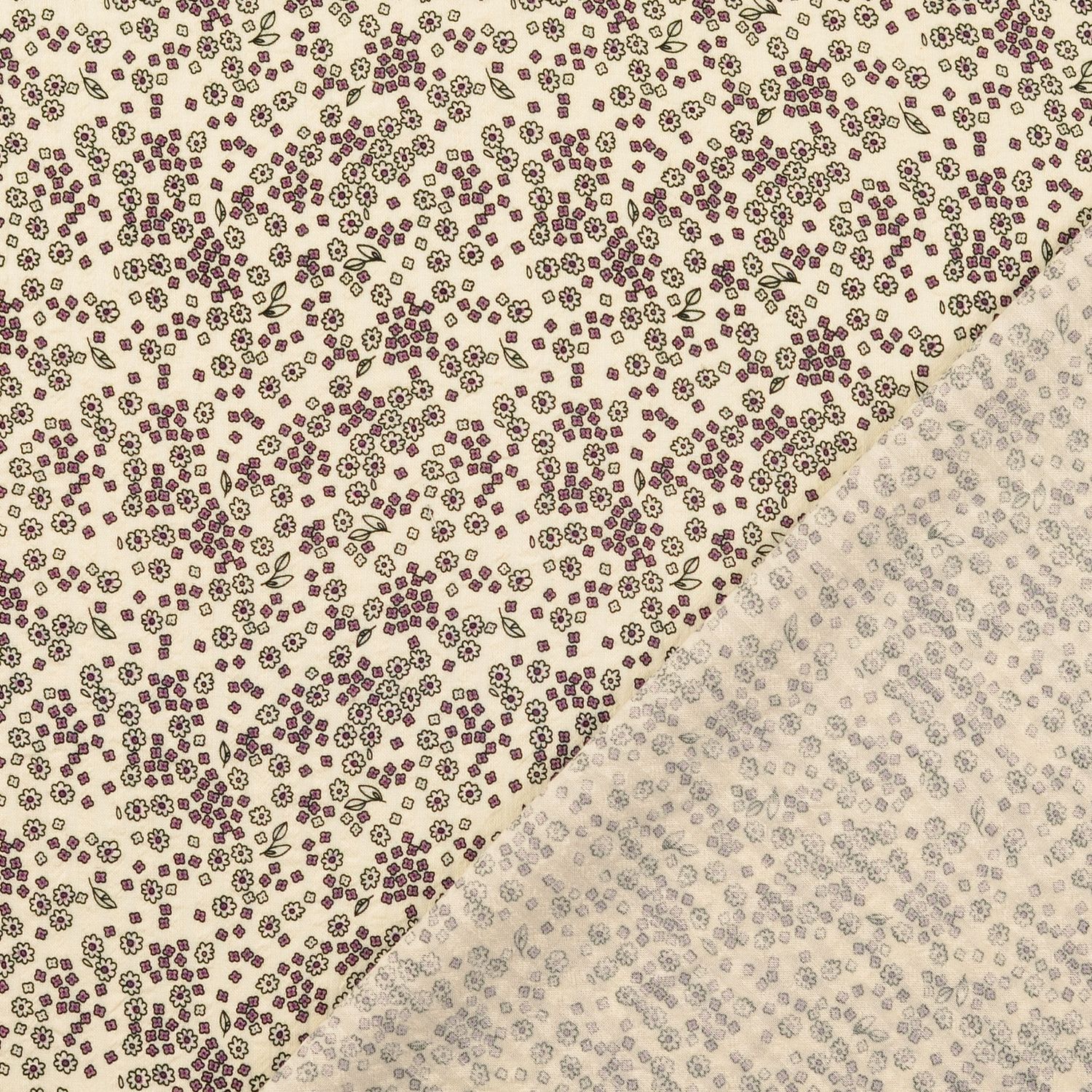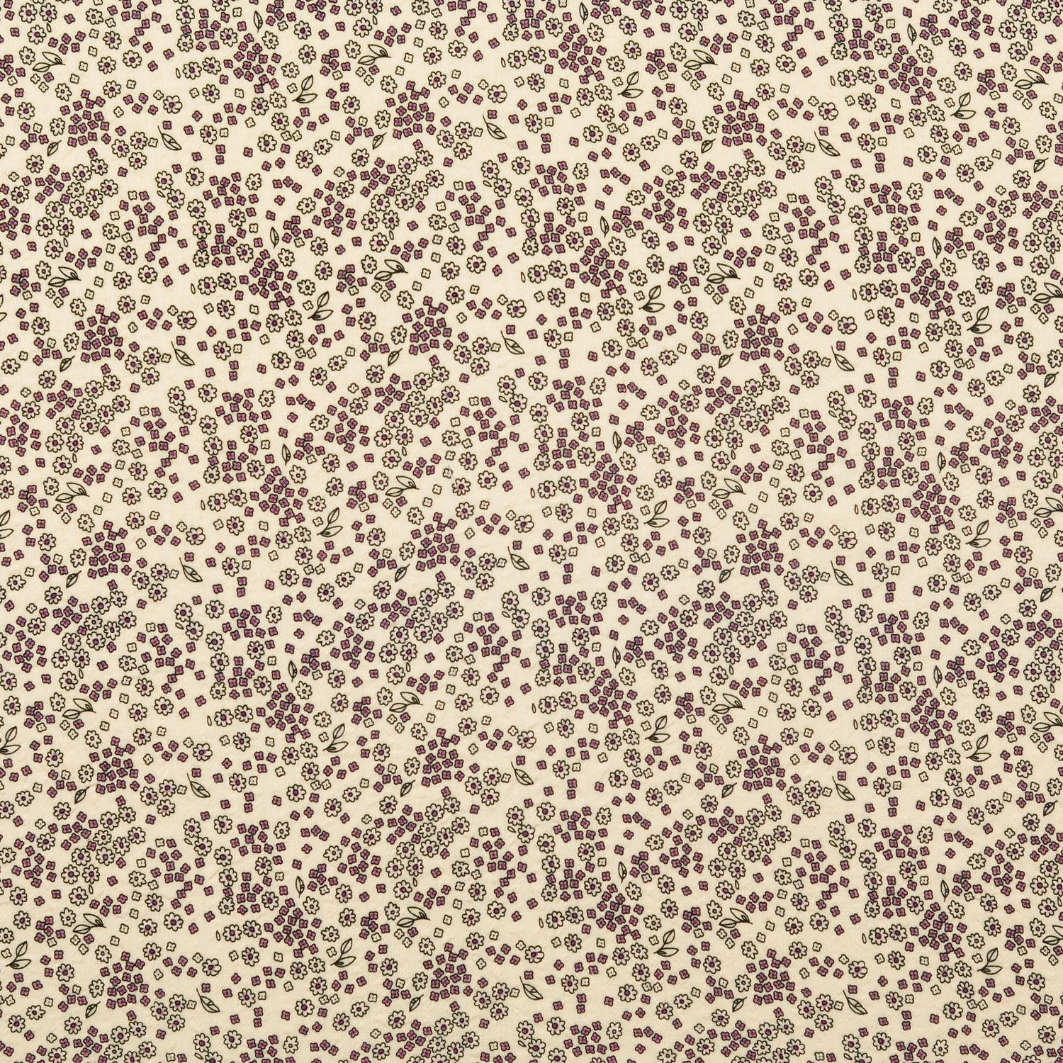 Een stof als uit een nostalgische zomerdag: Op een diepe auberginetint bloeien tere, kleine bloemetjes in fijne crème- en oudroze nuances, zacht geaccentueerd met subtiel groen. Het fijne allover-patroon werkt romantisch, speels en tegelijk heerlijk tijdloos – perfect voor iedereen die van de vintage look houdt.