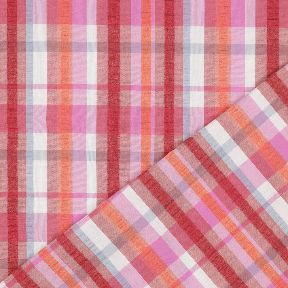 Deze fijn geruite roze seersucker geeft elk naai-project een frisse, zomerse uitstraling. Het fijne ruitpatroon in zachte rozetinten wordt door witte lijnen onderbroken en oogt speels en tijdloos elegant. Het typische licht gekreukte oppervlak zorgt voor een levendige structuur die de stof een bijzondere charme en lichtheid geeft.