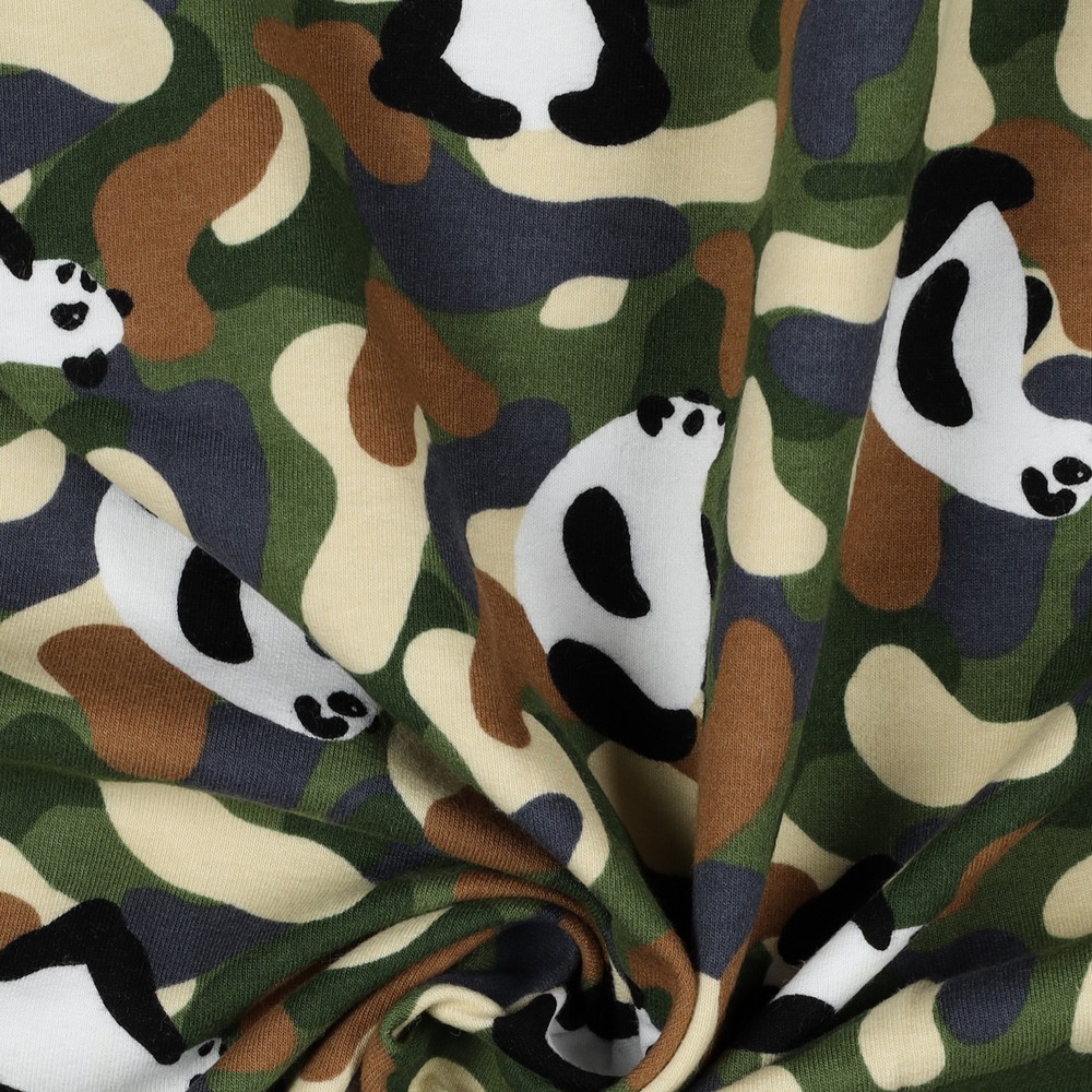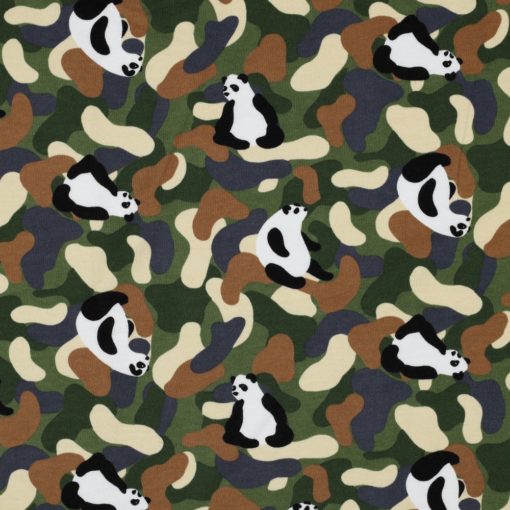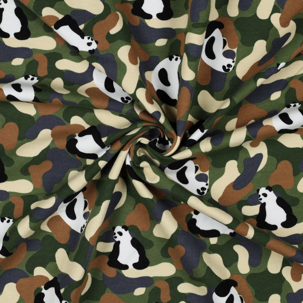 Een stof om verliefd op te worden: Op deze zachte sweat spelen schattige panda’s in een coole camouflage-look. Verschillende groentinten – van zacht lichtgroen tot diep donkergroen – versmelten met zachte beige nuances tot een modern camouflagepatroon, waaruit nieuwsgierige panda-gezichtjes tevoorschijn gluren.
