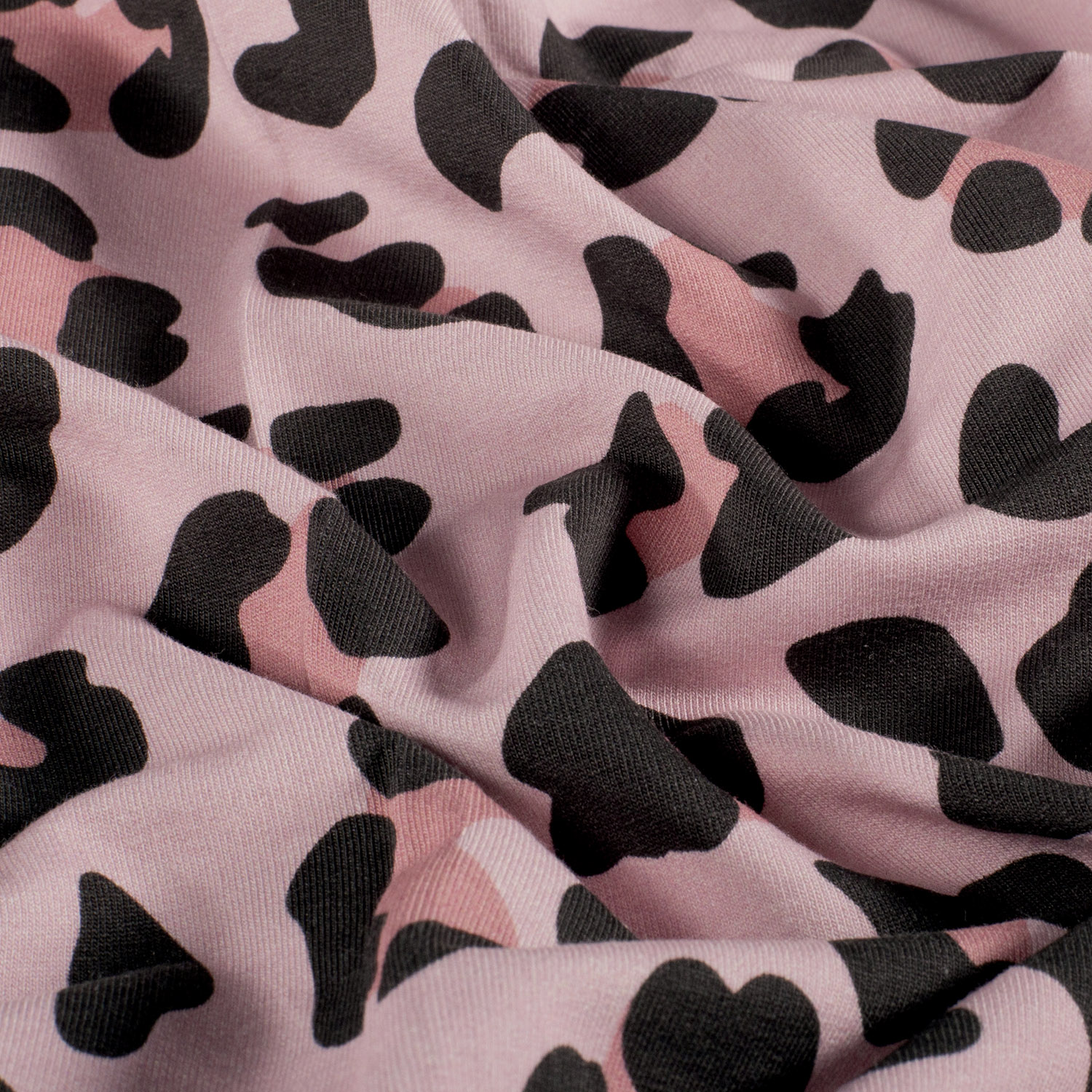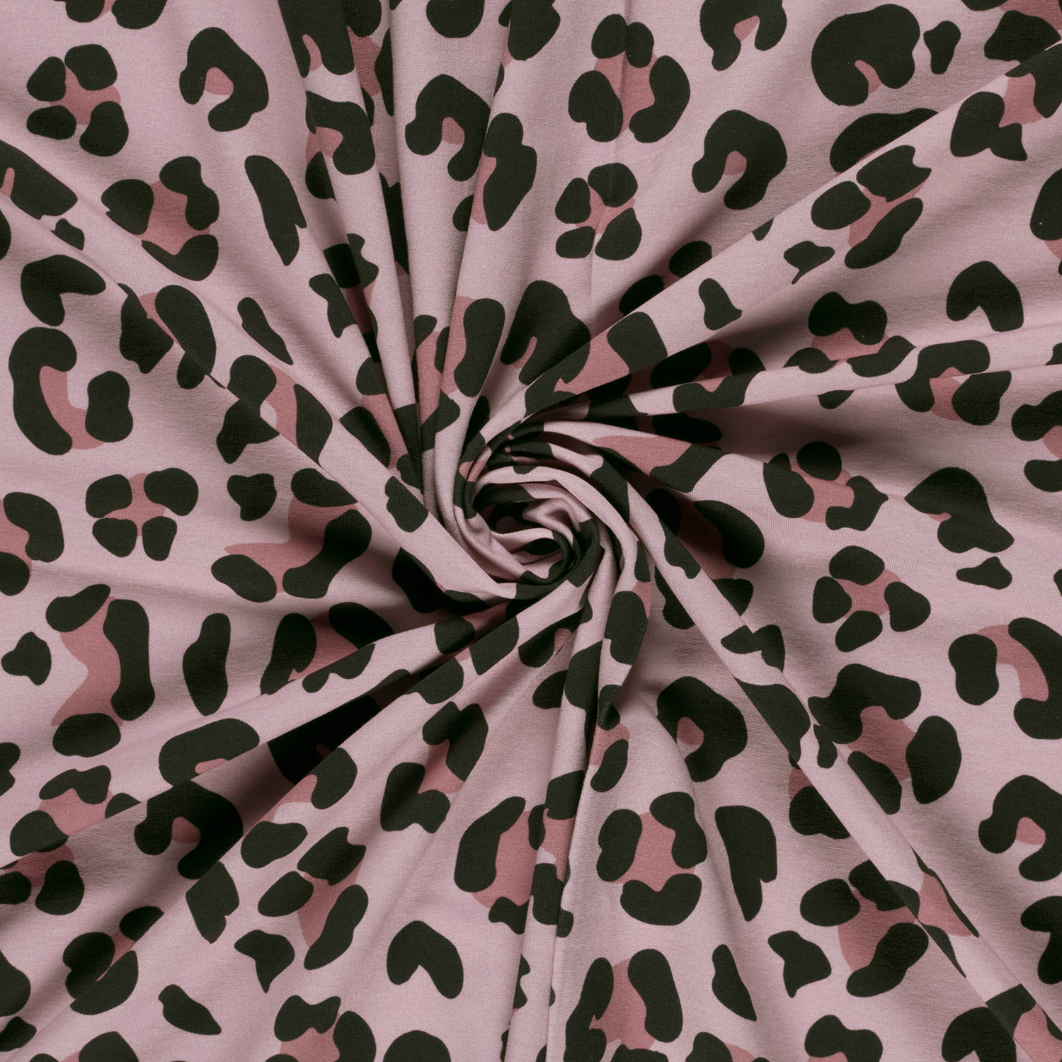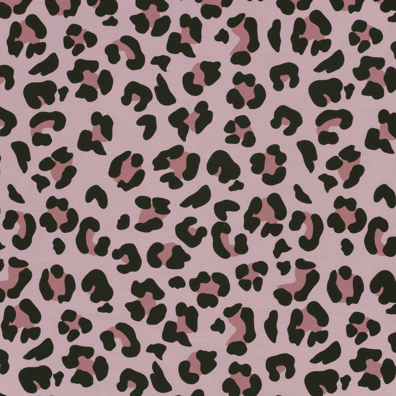 Een vleugje wildheid ontmoet zachte romantiek: deze French Terry met luipaardprint in roze is perfect voor wie het graag casual maar toch vrouwelijk heeft. Op de stof dartelen gestileerde luipaarden in zachte beige- en bruintinten, tot leven gebracht door fijne zwarte contouren en stippen. De achtergrond in zacht roze maakt het ontwerp modern, speels en tegelijk elegant.