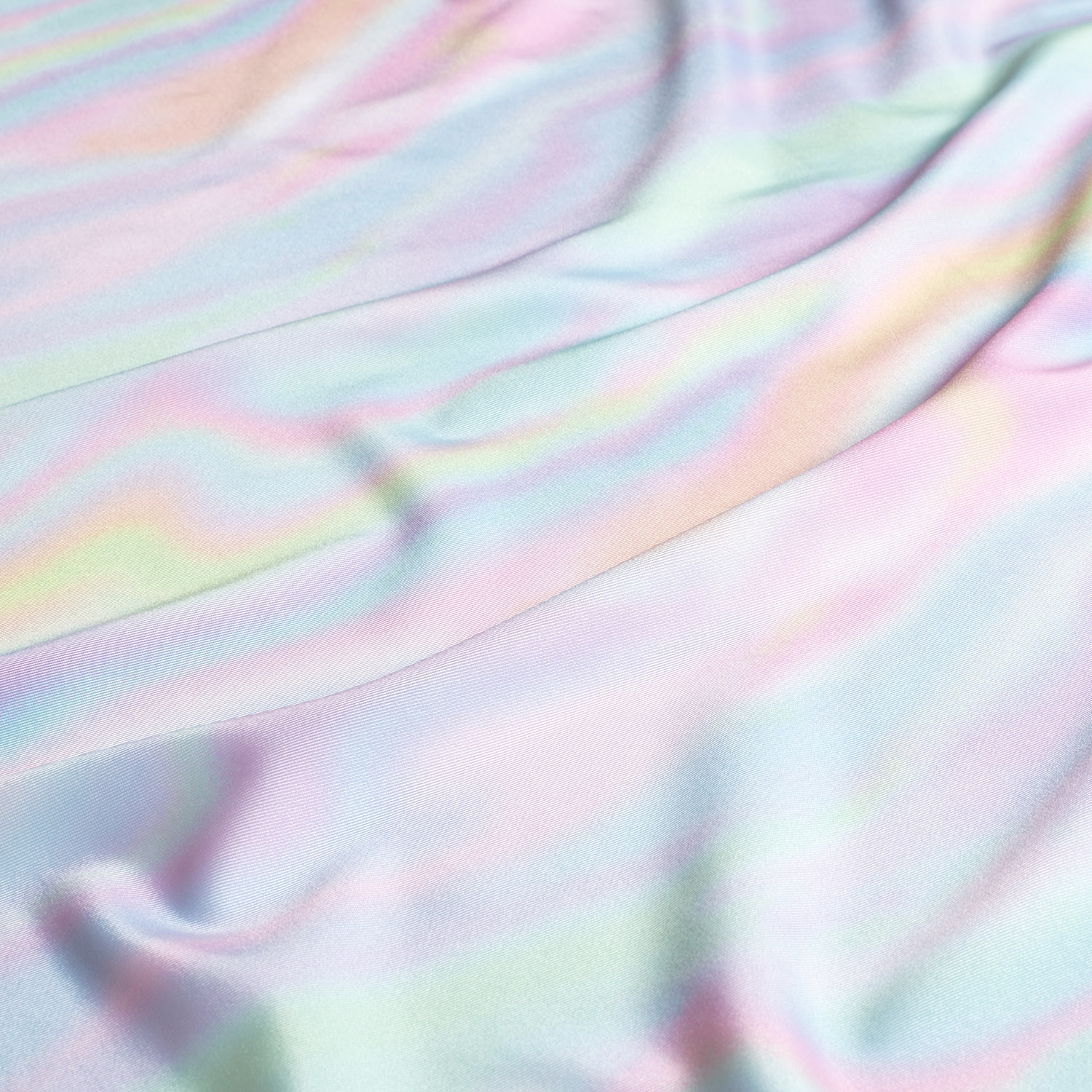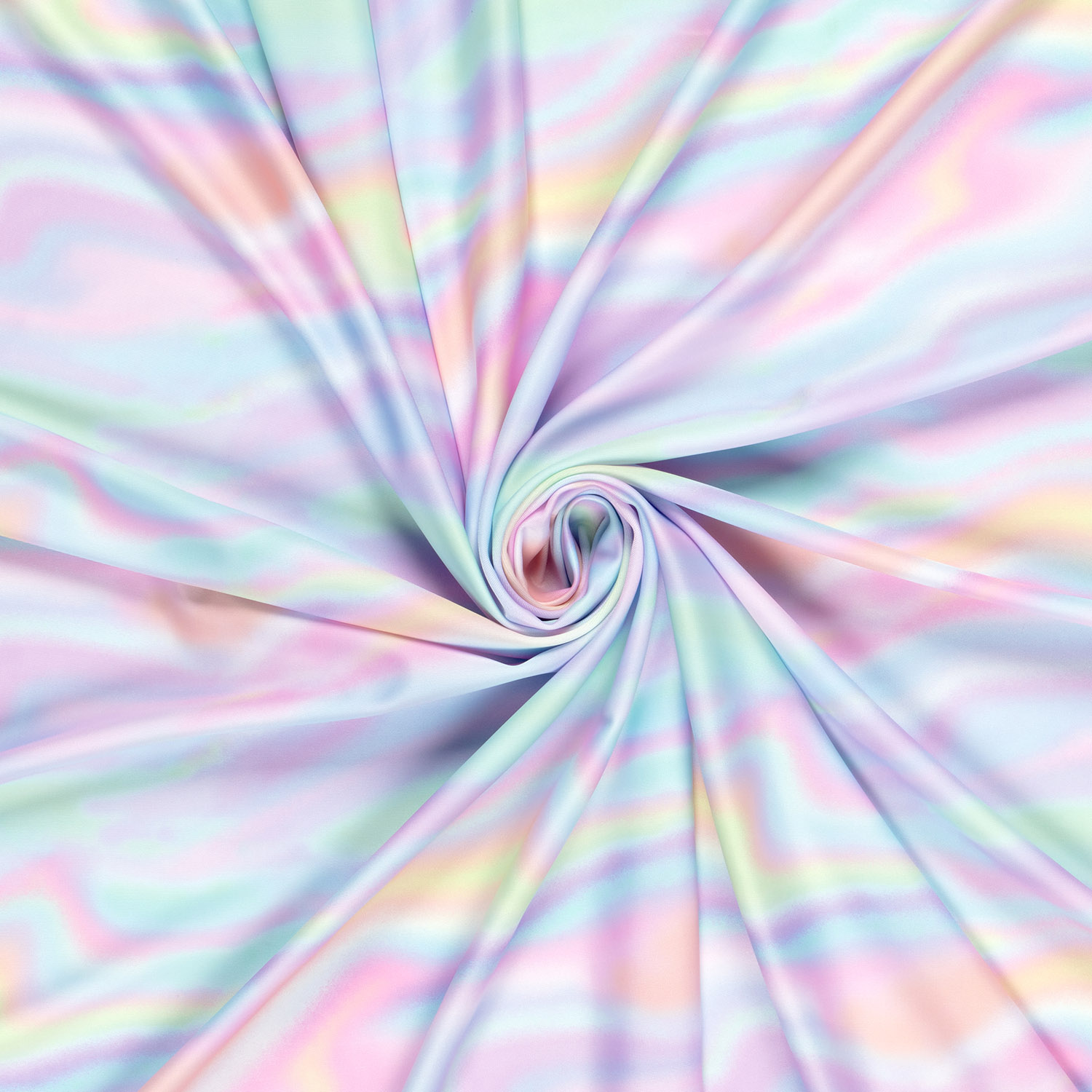 Deze sport- en badstof brengt een frisse designboost in je garderobe: zachte pasteltinten in lila, roze, lichtblauw en mint vloeien als aquarelkleuren in elkaar over en vormen een modern, abstract patroon. Fijne lijnen en zachte kleurverlopen doen denken aan gemarmerde wateroppervlakken en maken de stof tot een stijlvolle blikvanger – of je nu op het strand, in het zwembad of tijdens het sporten bent.