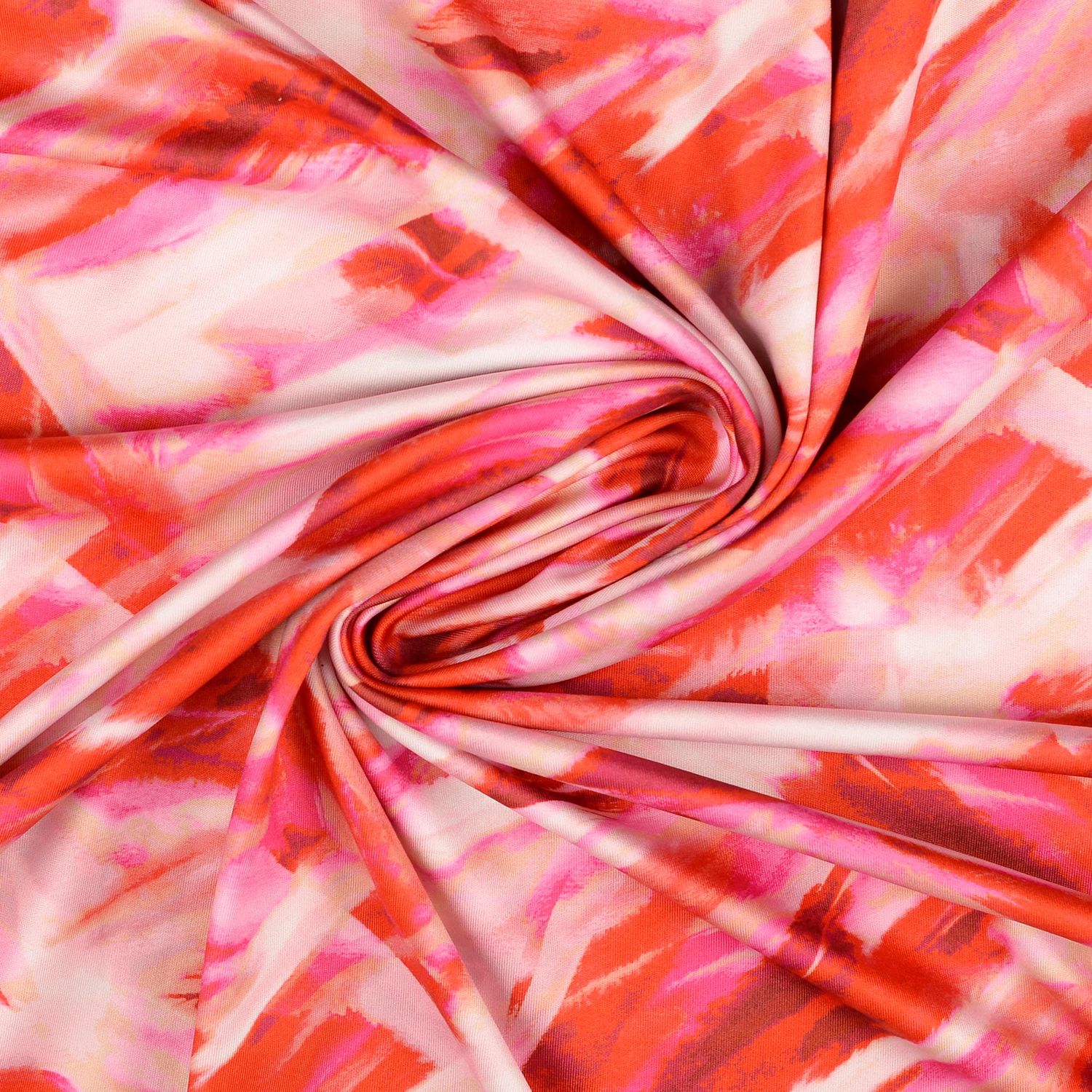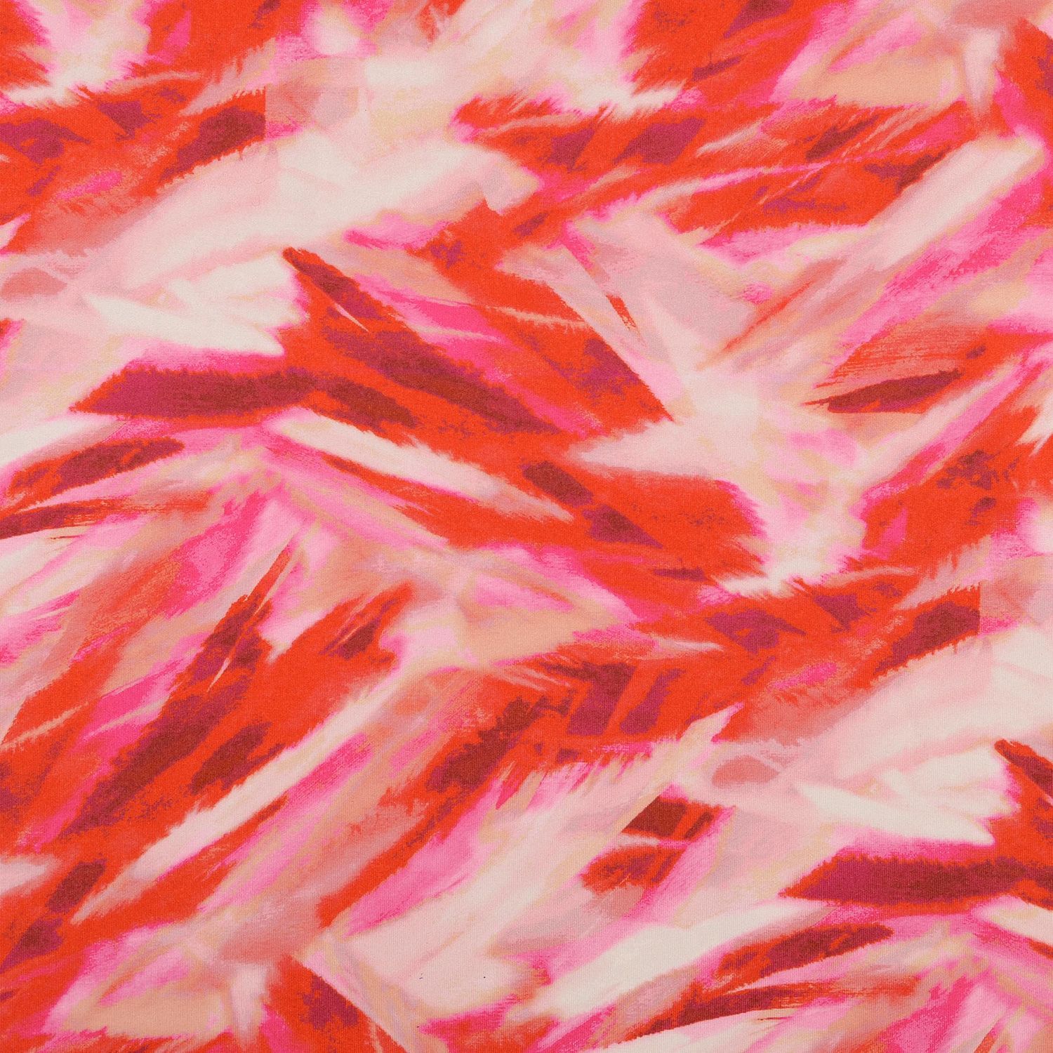 Deze sportjersey brengt dynamiek in elk naai-project: het abstracte ontwerp in krachtige rood- en oranje tinten is doorweven met donkere accenten en doet denken aan energieke kleur-explosies. Perfect voor iedereen die tijdens sport of vrije tijd niet alleen functioneel maar ook stijlvol wil zijn.