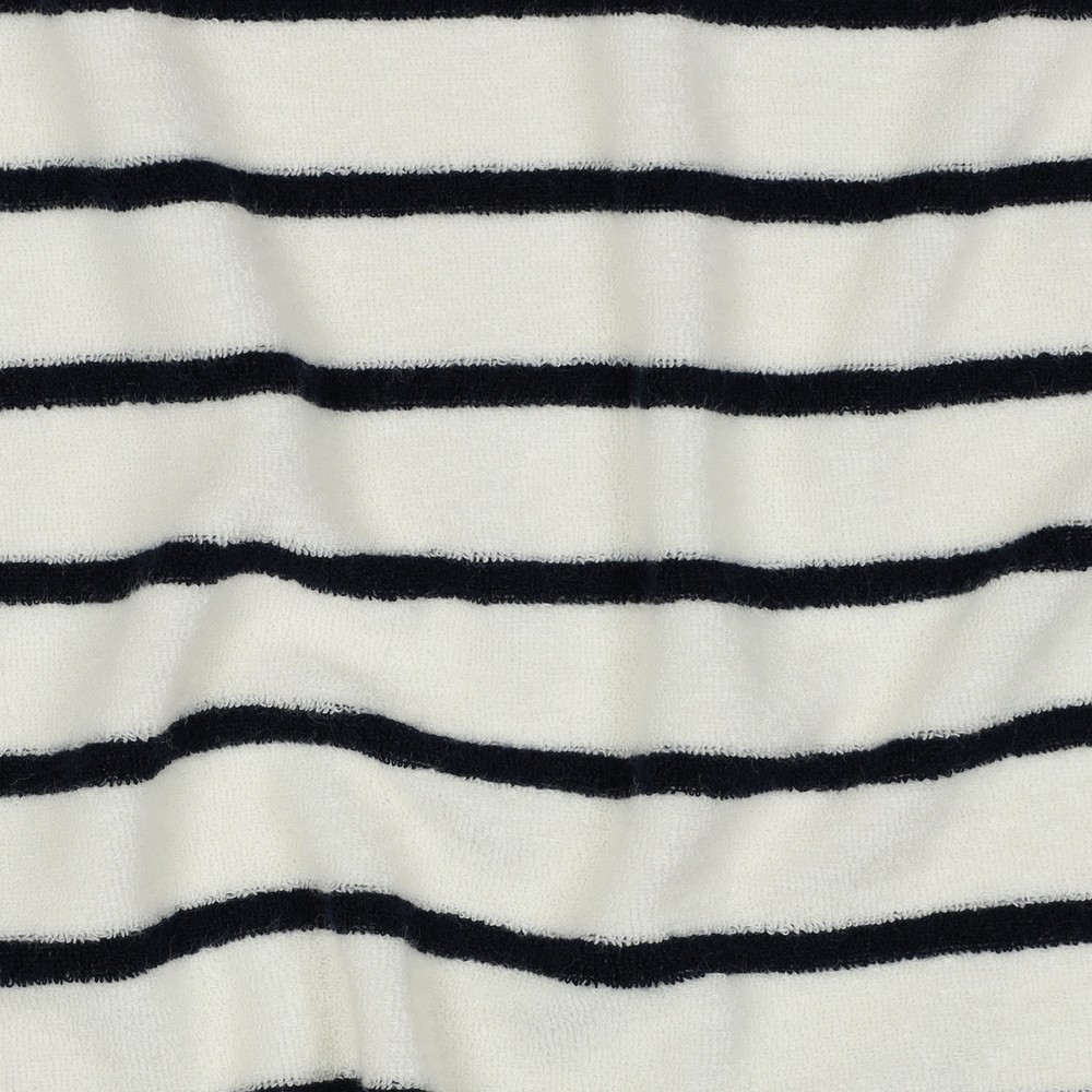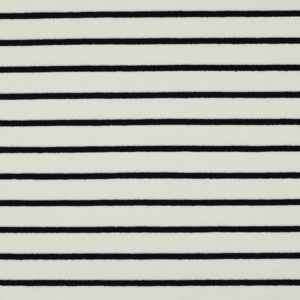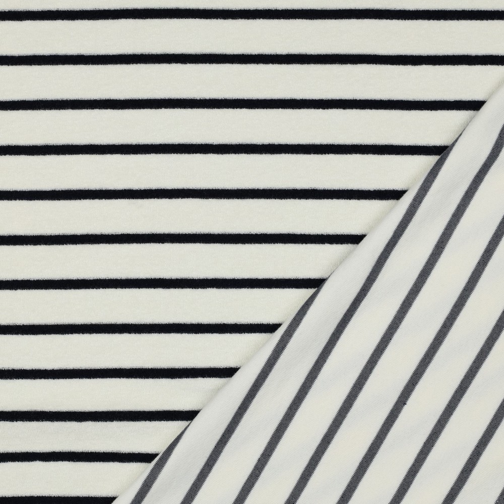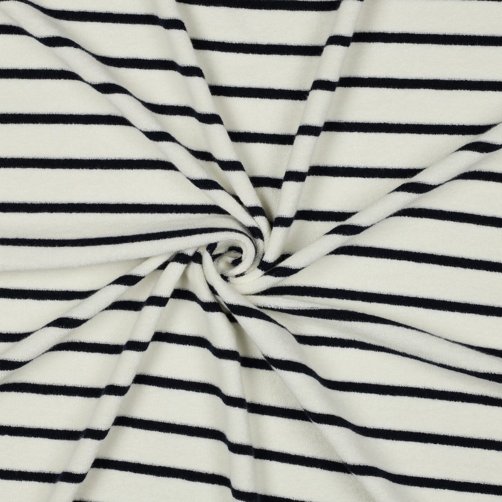 Maritieme flair om lekker in weg te kruipen: deze stretch badstof zal je verrukken met zijn klassieke marinestrepen op een warme ecru achtergrond. De fijne lussenstructuur voelt aangenaam zacht aan en nodigt je uit om meteen knus te worden.