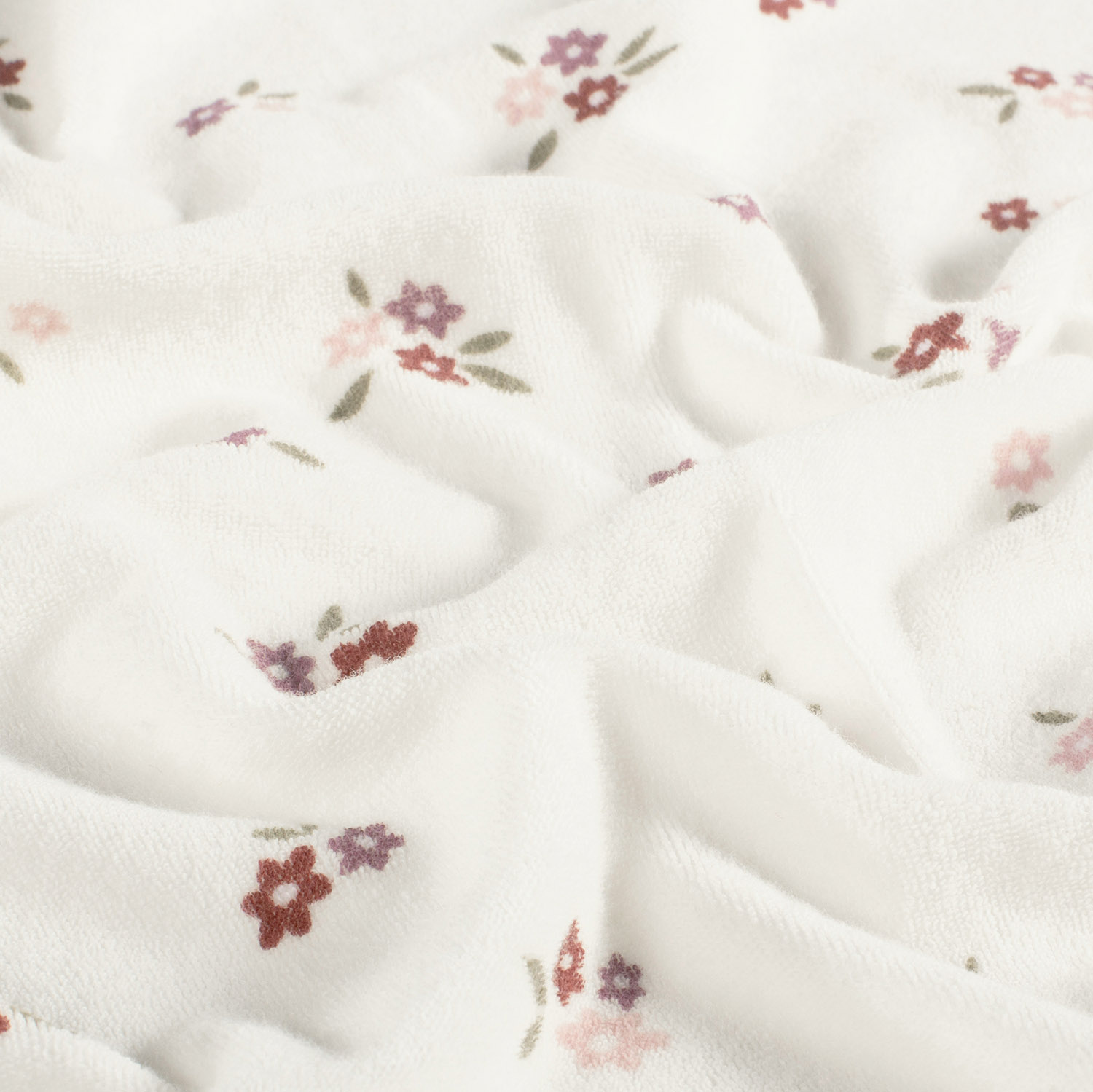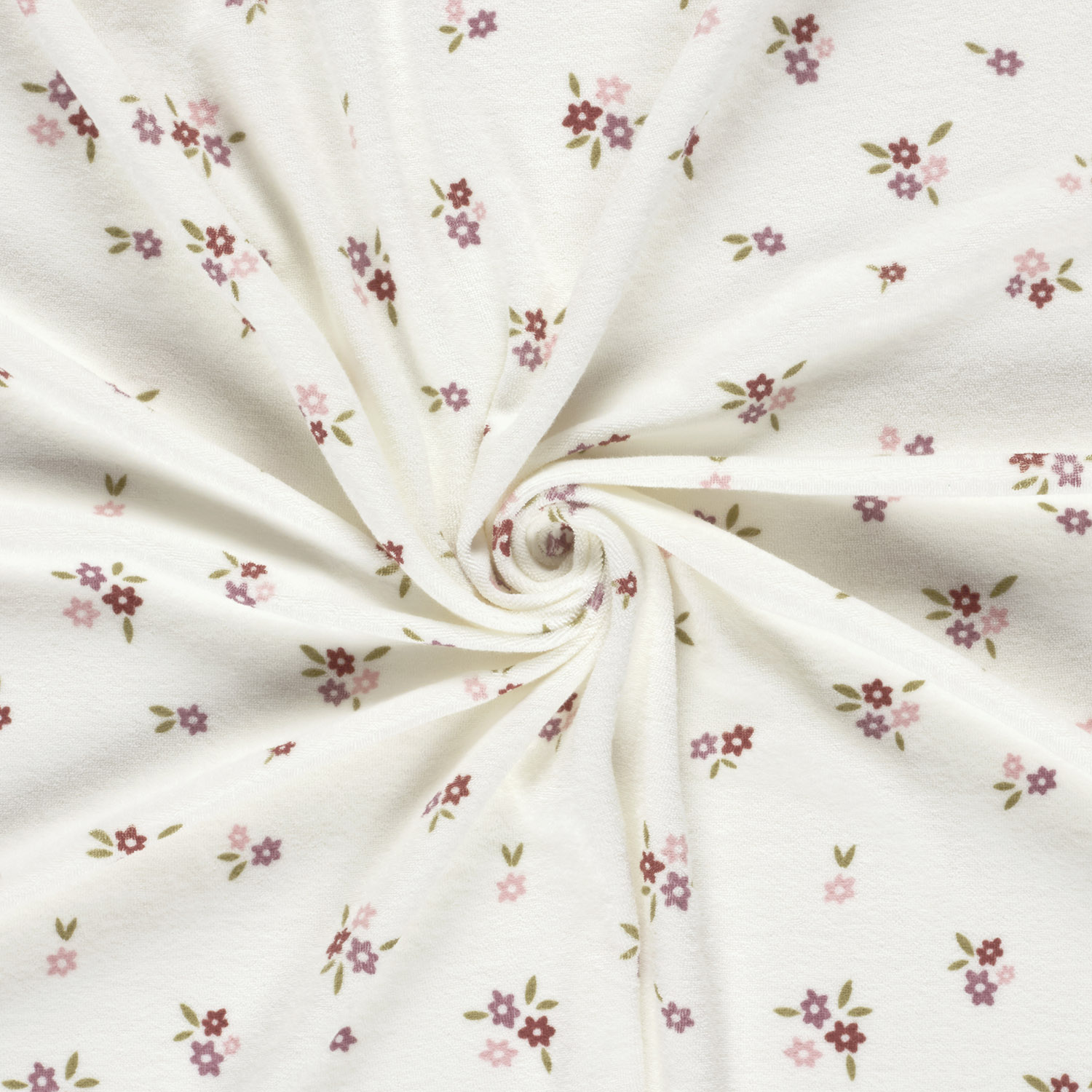 Zacht, speels en ongelooflijk knus: deze stretchfrottee in ecru betovert met een fijn bloemetjespatroon dat als een subtiel bloementapijt over de stof ligt. De kleine, gestileerde bloemen in zachte natuurlijke tinten zijn bescheiden en tegelijk levendig – perfect voor wie houdt van een romantische, maar niet te speelse stijl.