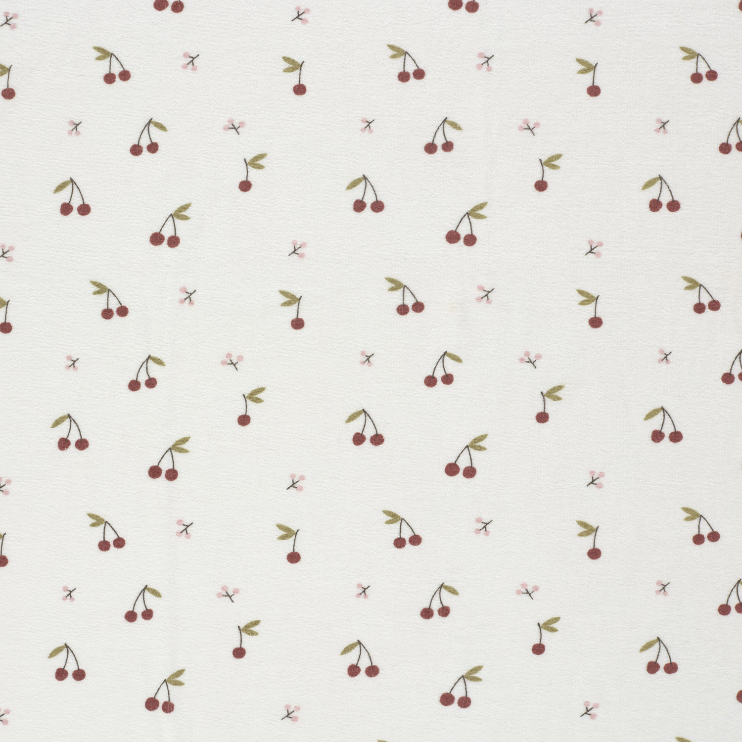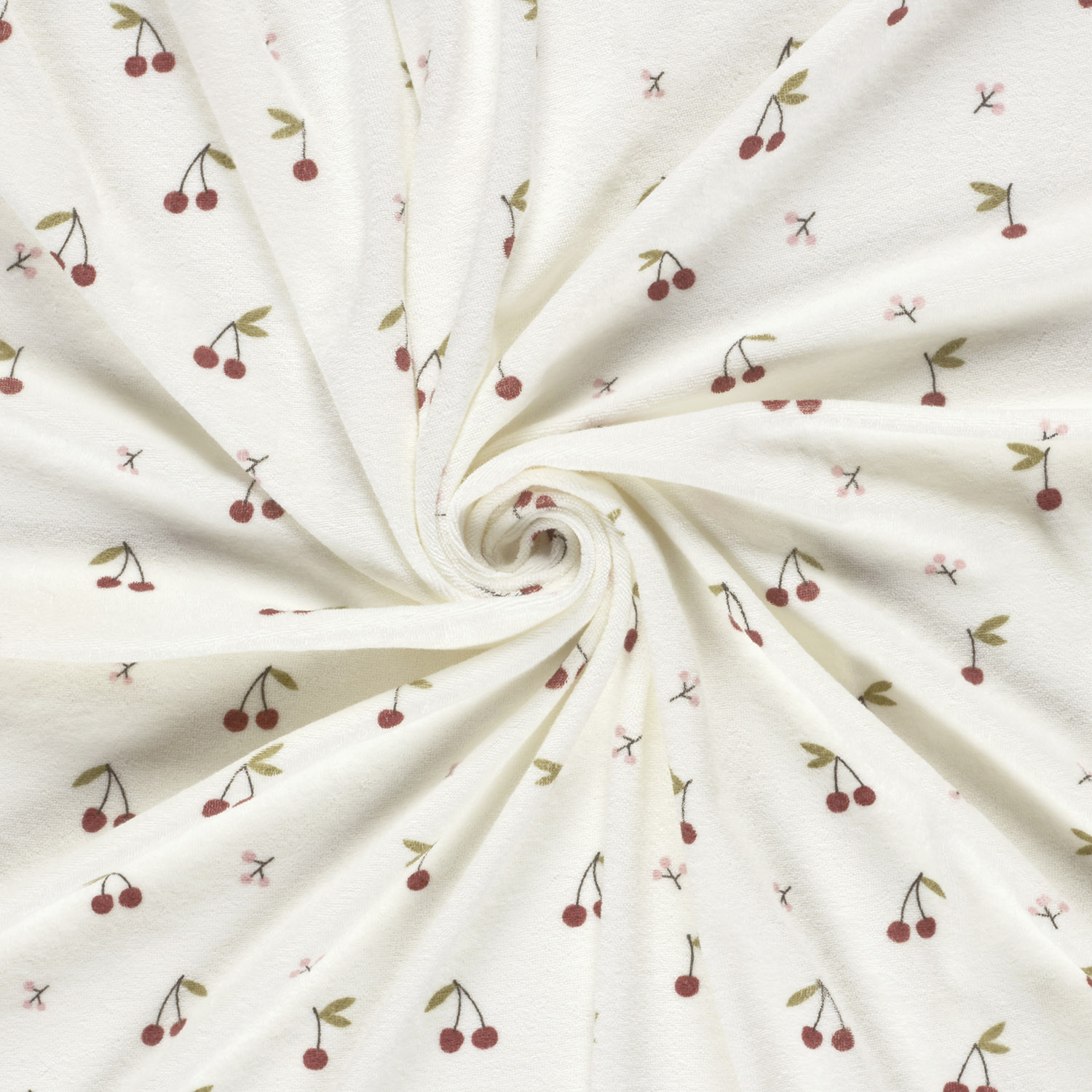 Zoet en heerlijk comfortabel: deze stretchfrottee betovert met een speels kersendesign op een zachte ecru achtergrond. De kleine, dieprode kersen met hun fijne groene steeltjes brengen direct vrolijkheid in elk naai-project en zorgen voor vrolijke kleuraccenten zonder opdringerig te zijn.