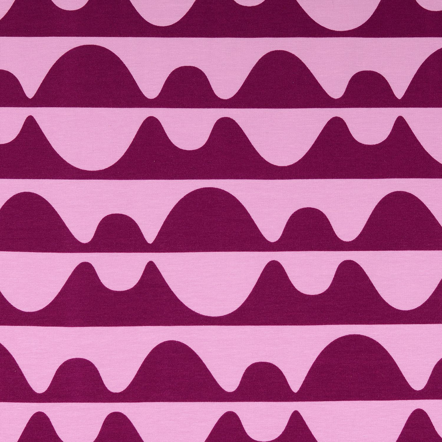 Zachte golven, delicate kleuren en een knusse binnenkant – deze French Terry nodigt uit tot comfort. Het ontwerp toont een harmonieus golfpatroon in verschillende paarstinten, gecombineerd met fijne nuances in roze, crème en subtiel grijs. Hierdoor oogt de stof speels, maar toch stijlvol en niet te opvallend.