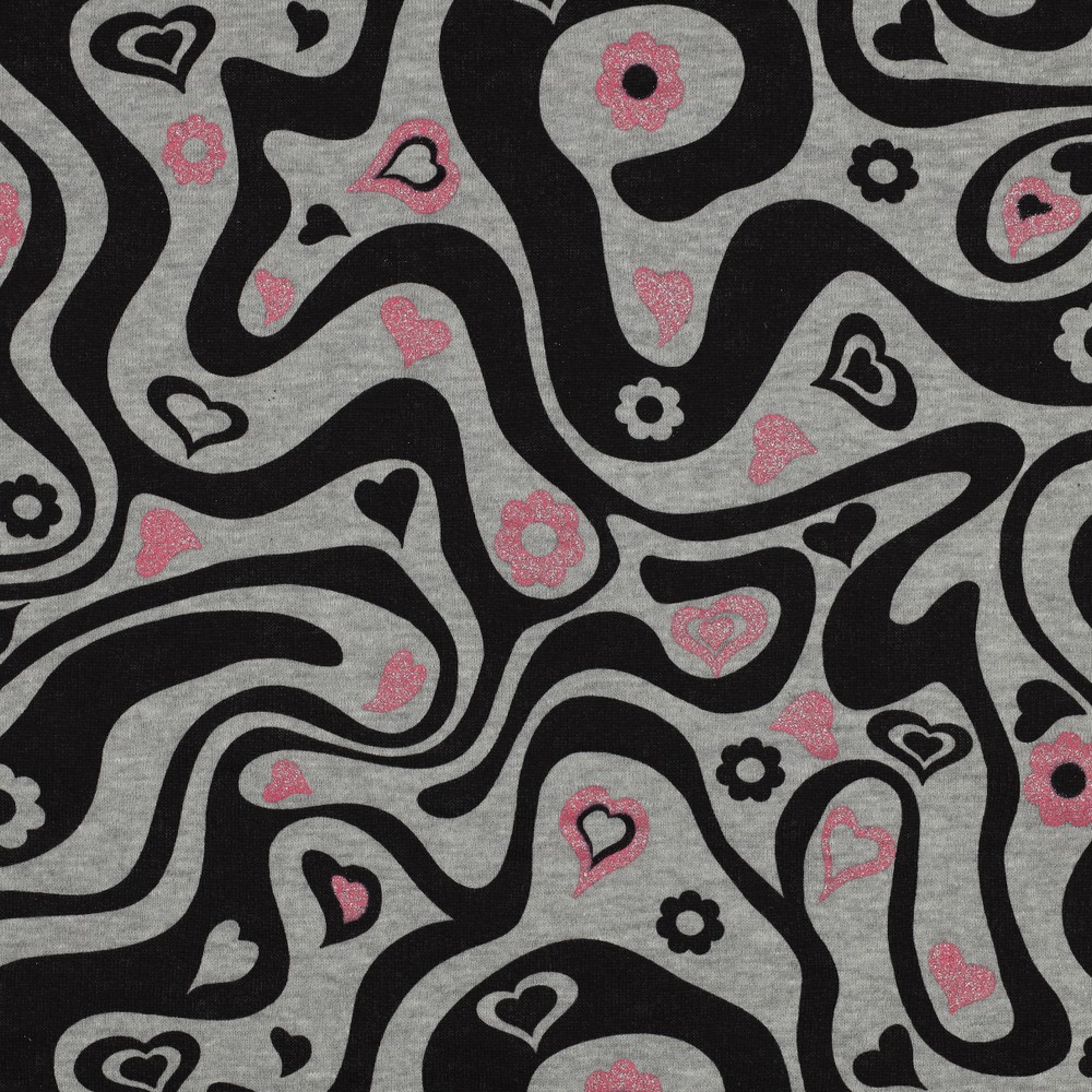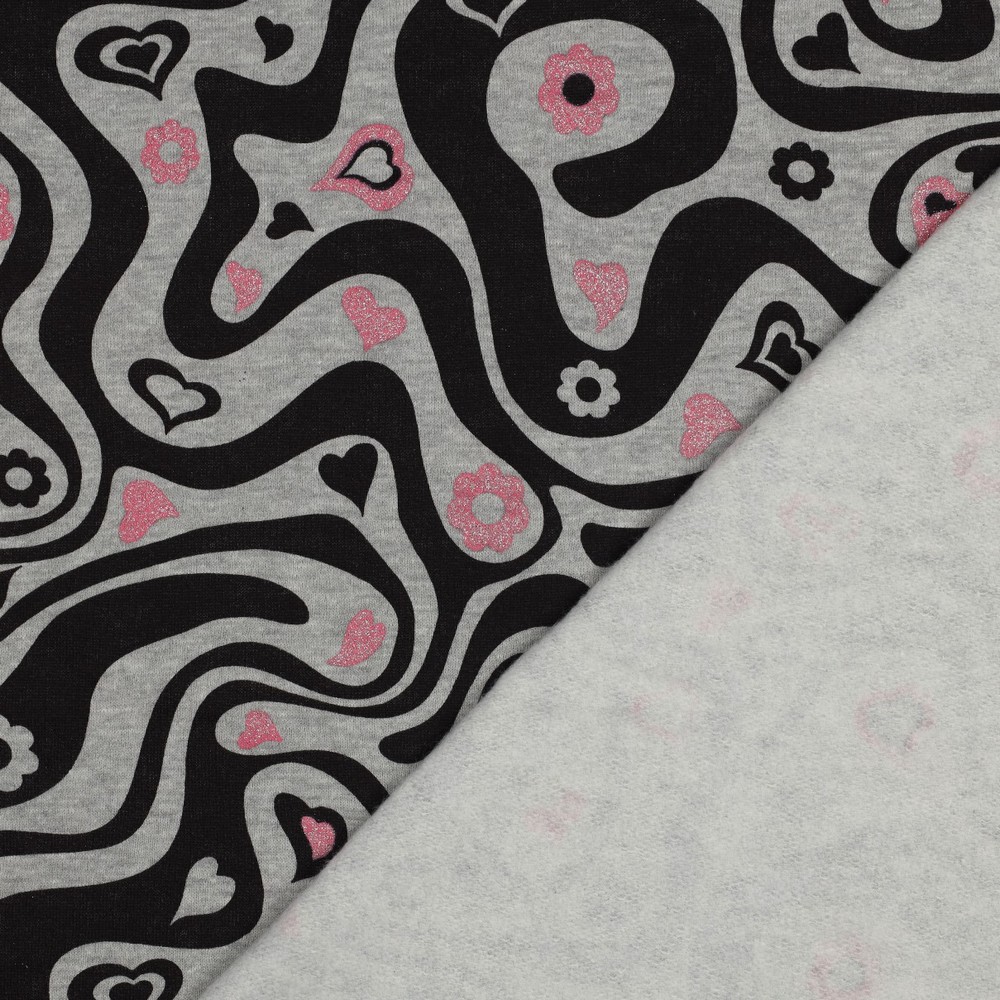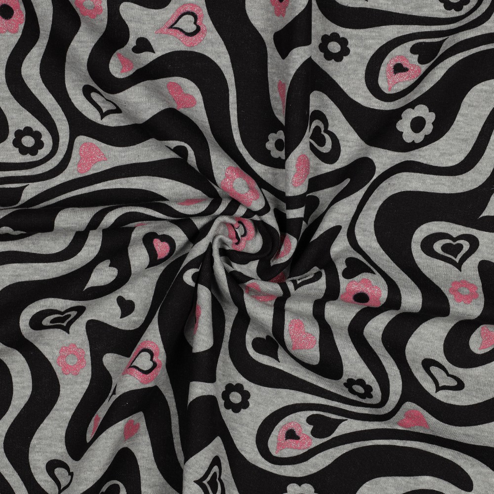 Een stof om verliefd op te worden: Op het donker gemêleerde zwart dansen talloze kleine hartjes, verfraaid met fijne glitters. Het subtiele fonkelen geeft de stof een elegante, speelse uitstraling zonder opdringerig te zijn.
