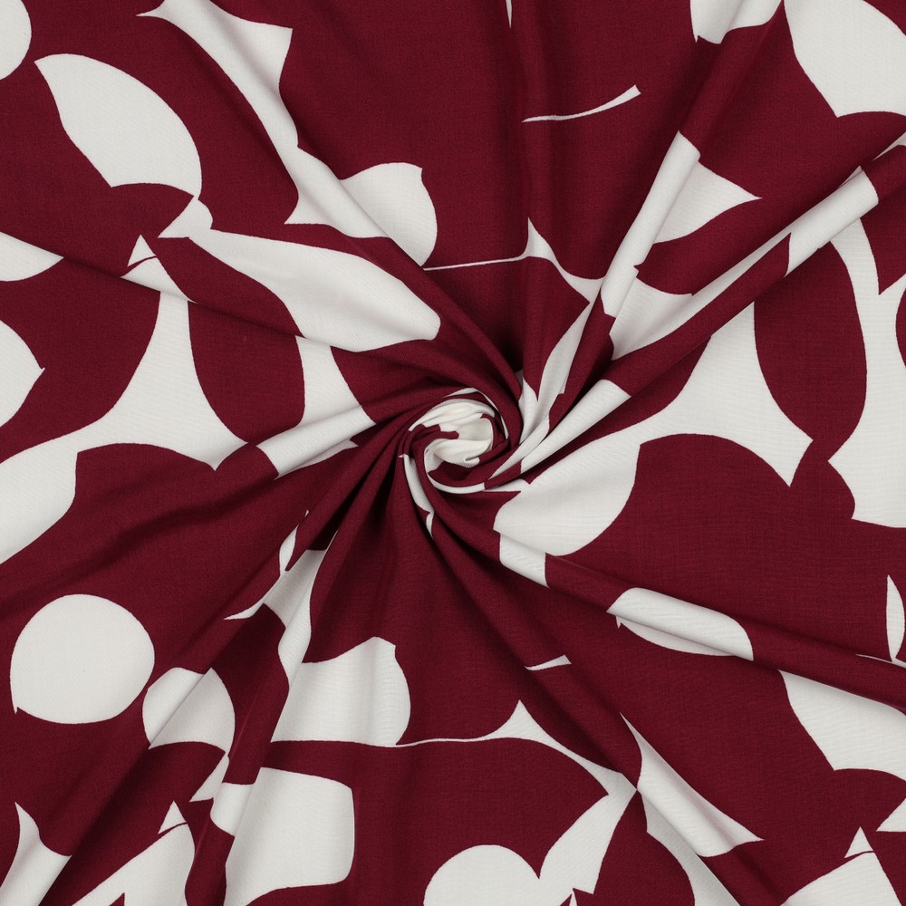 Een stof als een modern schilderij: op diep bourgondië ontvouwt zich een abstract spel van zachte lijnen, fijne spikkels en levendige accenten. Zachte roze- en crèmetinten ontmoeten donkerdere, bijna zwarte details en creëren een spannend contrast dat toch harmonieus en elegant is.