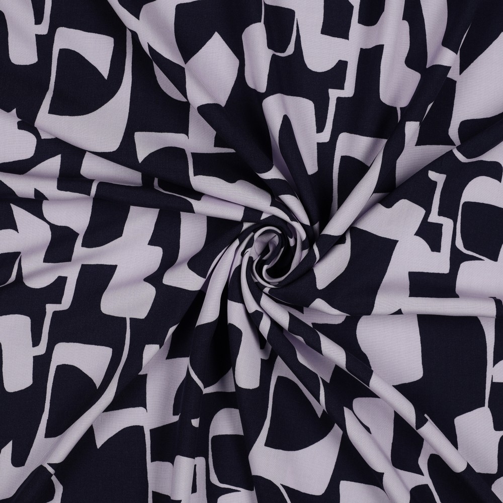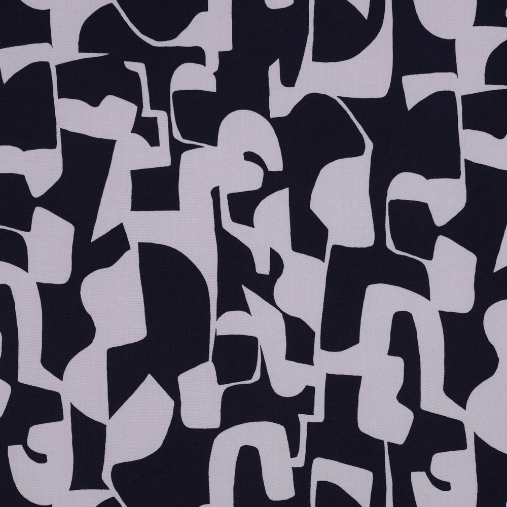 Een stof als een nachtelijke zeebries: Op diep marineblauw dansen fijne, abstracte lijnen en vormen in zacht crèmewit. Het moderne, artistieke patroon doet denken aan handgetekende schetsen en geeft elk naaiwerk een stijlvolle, licht grafische toets.