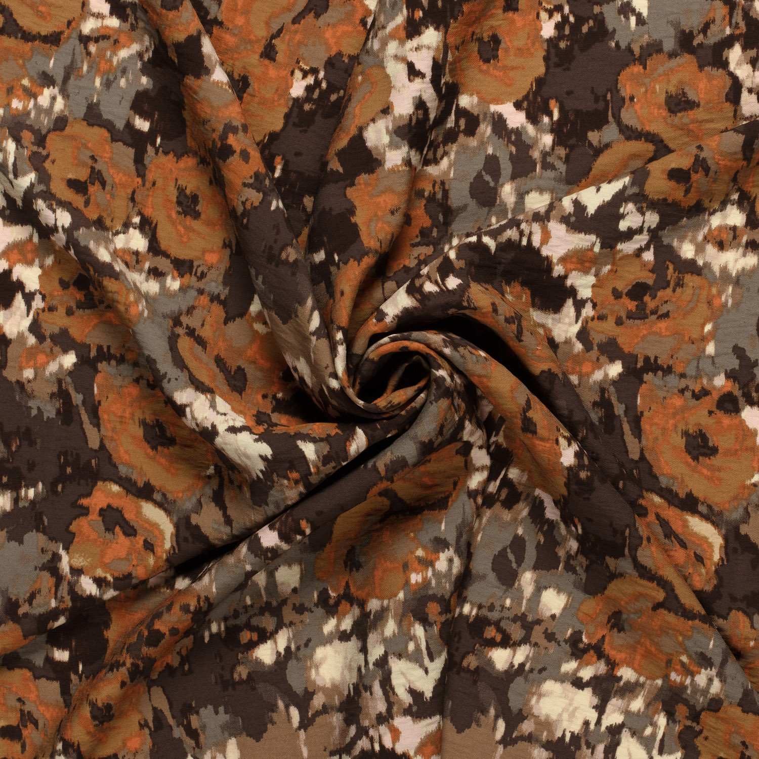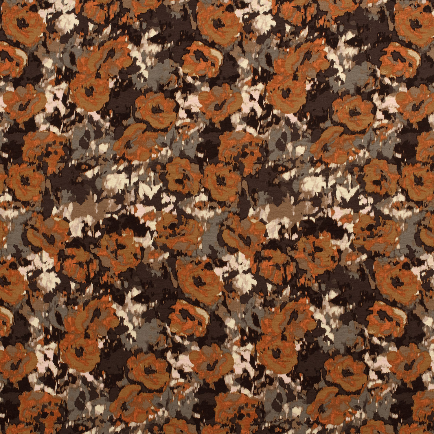 Een stof als een modern schilderij: op de zacht getinte taupekleurige ondergrond zweven abstracte bloemen in delicate natuurtinten. Zachte crème- en beigetinten ontmoeten gedempt bruin en fijne, donkerdere accenten die het ontwerp diepte en levendigheid geven. De bloemvormen lijken losse penseelstreken – speels maar toch elegant en prachtig tijdloos.