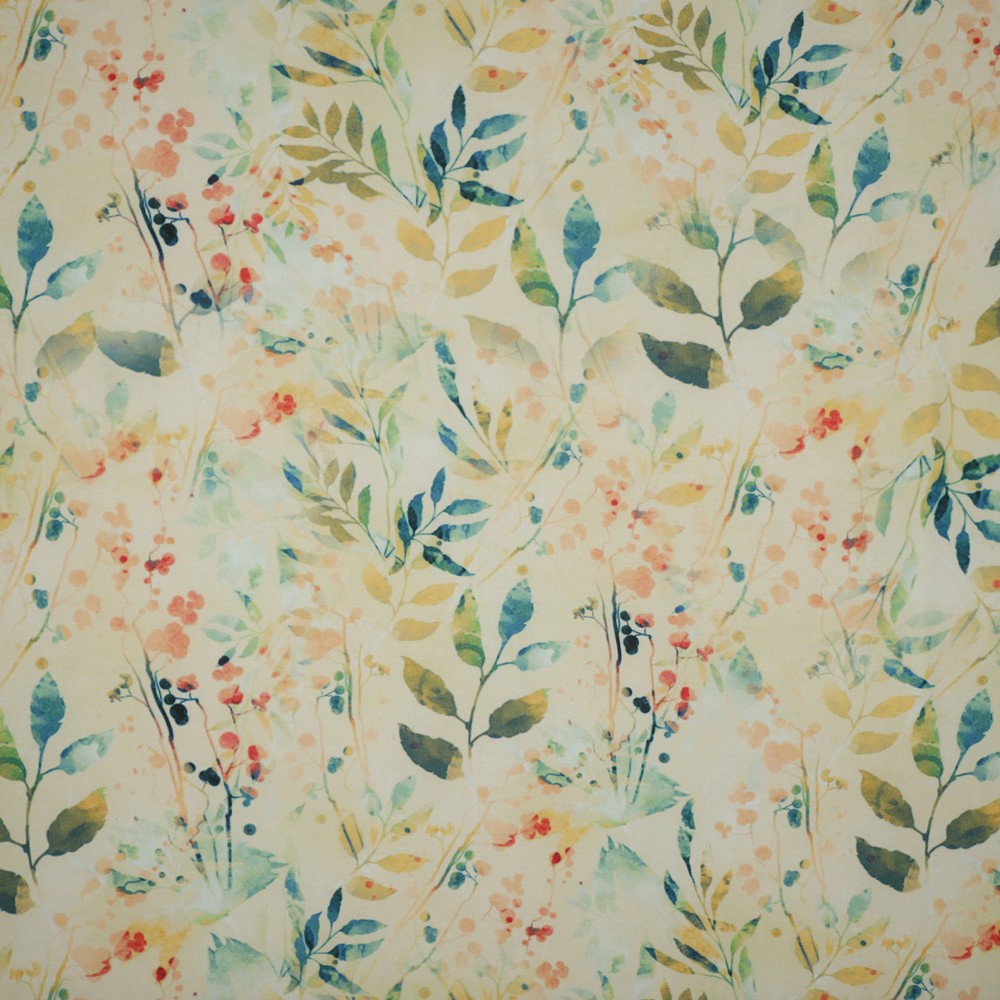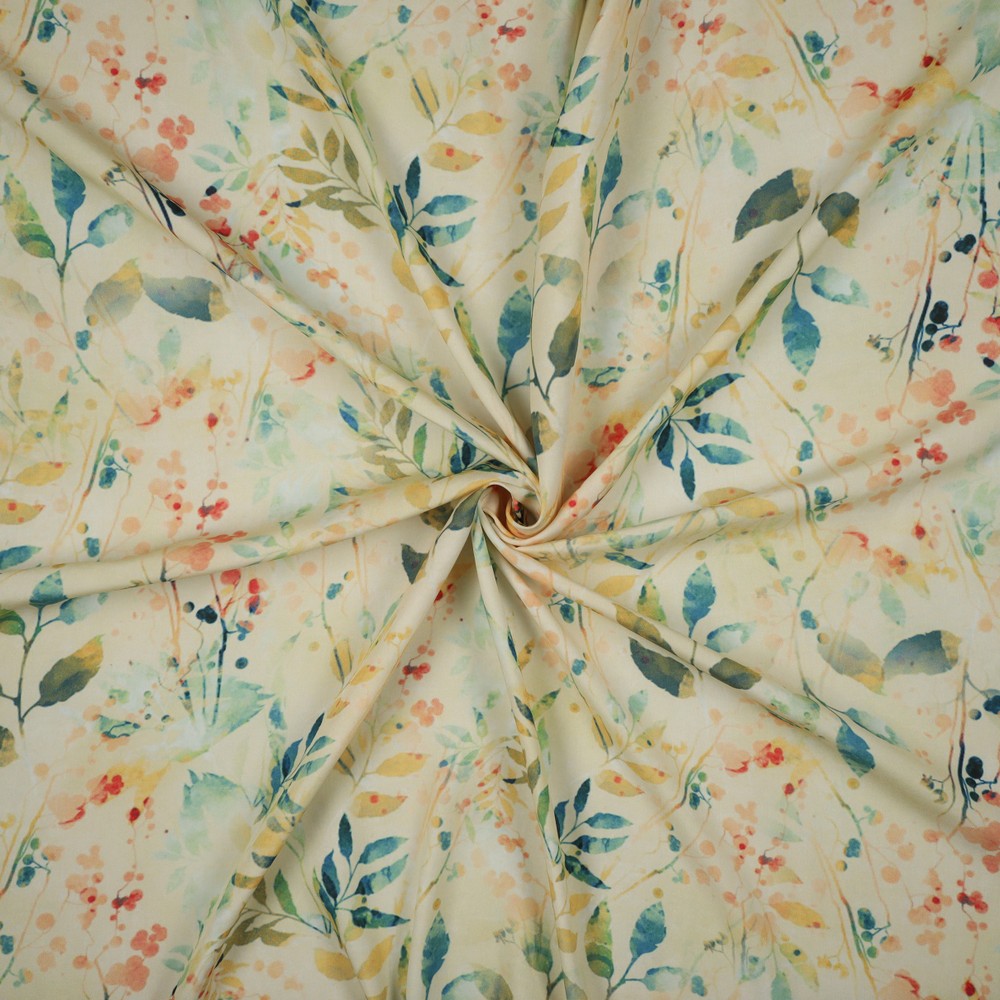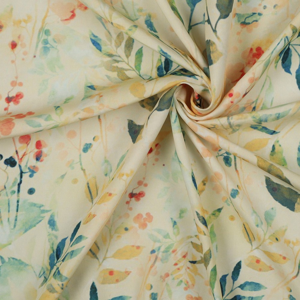 Een vleugje late zomer voor je naai-projecten: Deze prachtige viscose stof toont een levendig bladerenontwerp in warme geel- en okertinten, gecombineerd met zachte beige en bruine nuances. De fijne bladeren lijken getekend en verspreiden zich harmonieus over de stof – soms dichter, soms luchtiger, waardoor een natuurlijk, vloeiend totaalbeeld ontstaat.