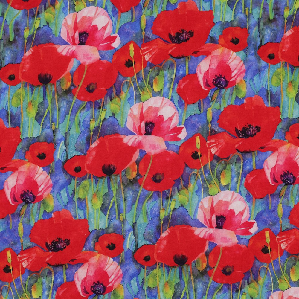 Een zee van stralende klaprozen op een diep kobaltblauwe achtergrond – deze stof is een echte blikvanger. De intens rode bloemen met hun fijne, donkere contouren lijken bijna te zweven en komen bijzonder mooi tot hun recht tegen het rijke blauw. Fijne knoppen, gestileerde bladeren en subtiele details geven het ontwerp een levendige en tegelijk elegante uitstraling.