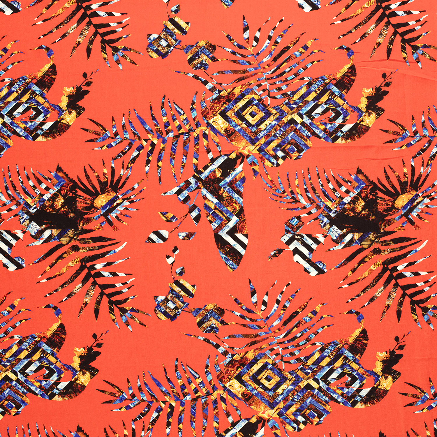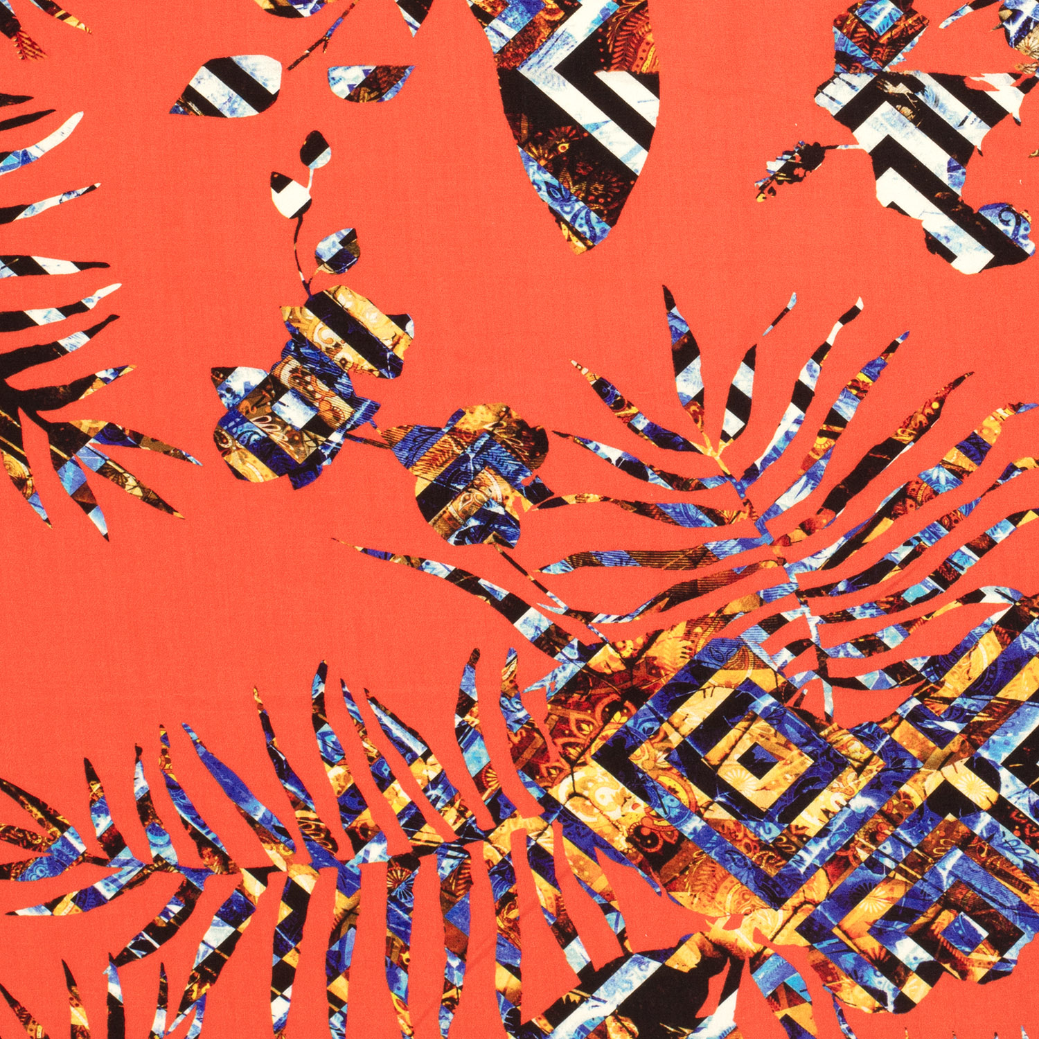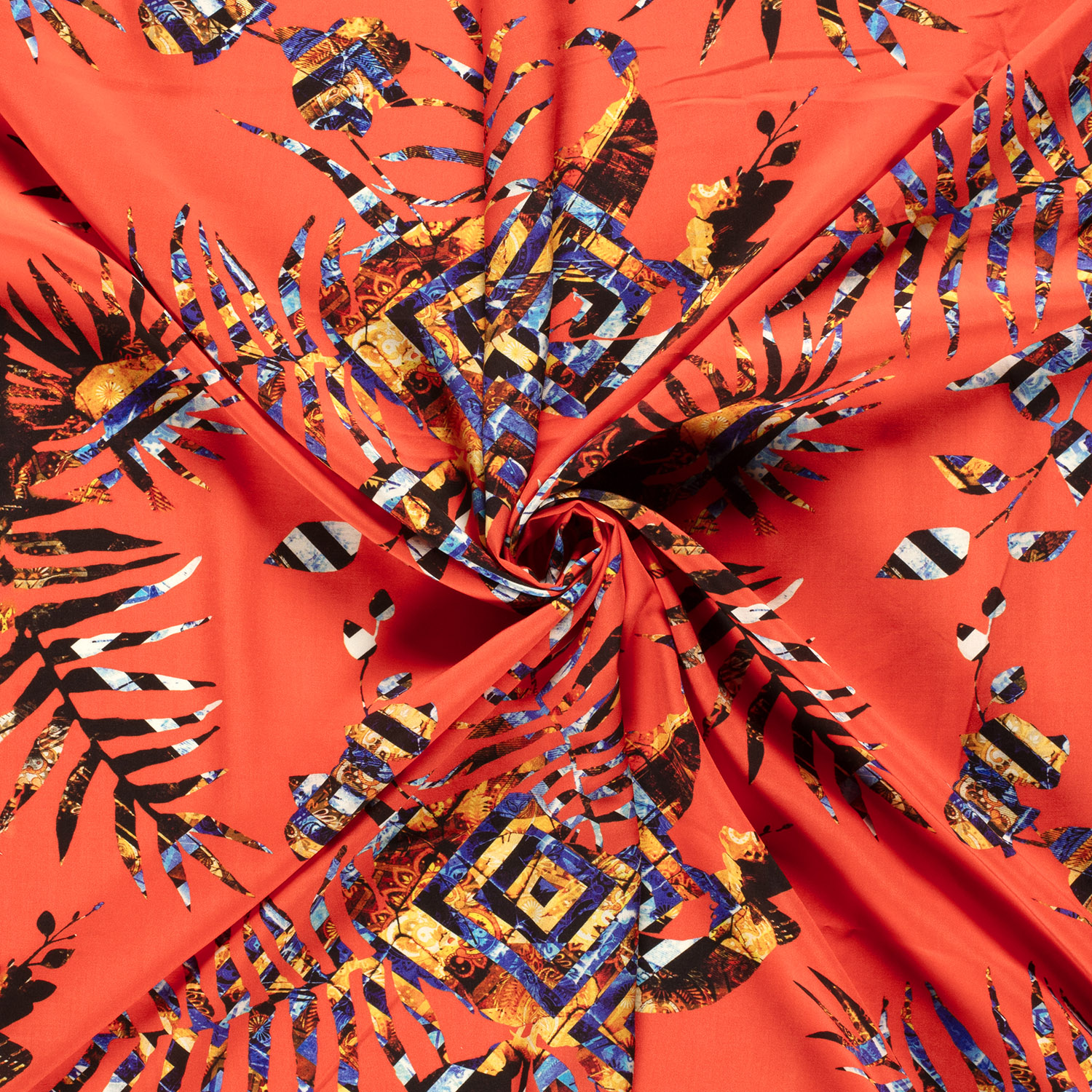 Een stof als een zonsondergang aan zee: tere palmbladeren kronkelen in levendig rood over een lichte, licht crèmekleurige achtergrond en geven dit ontwerp een prachtig exotische uitstraling. De fijne bladeren lijken bijna geschilderd en creëren een harmonieuze spel van licht en schaduw – perfect voor iedereen die de zomer het hele jaar wil dragen.