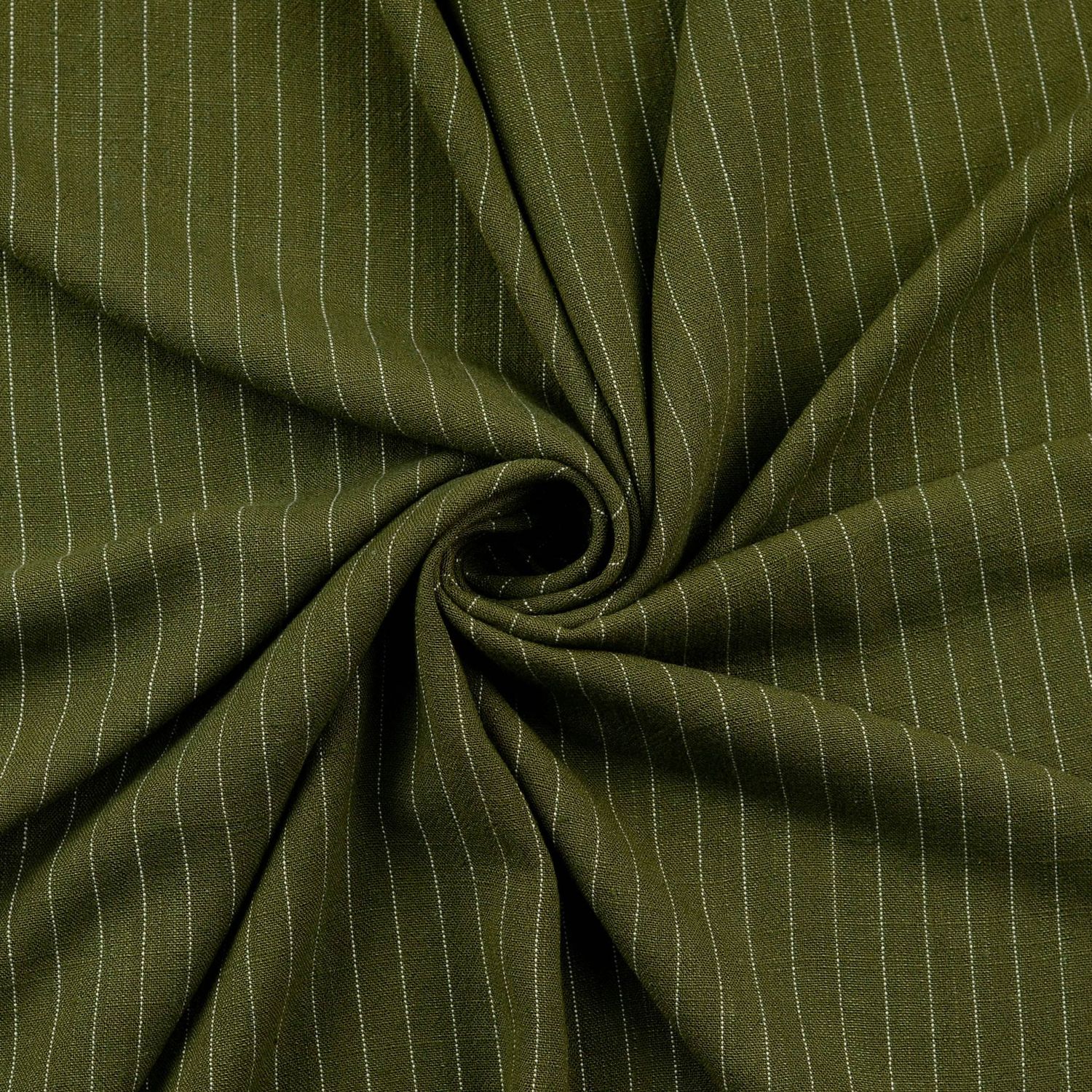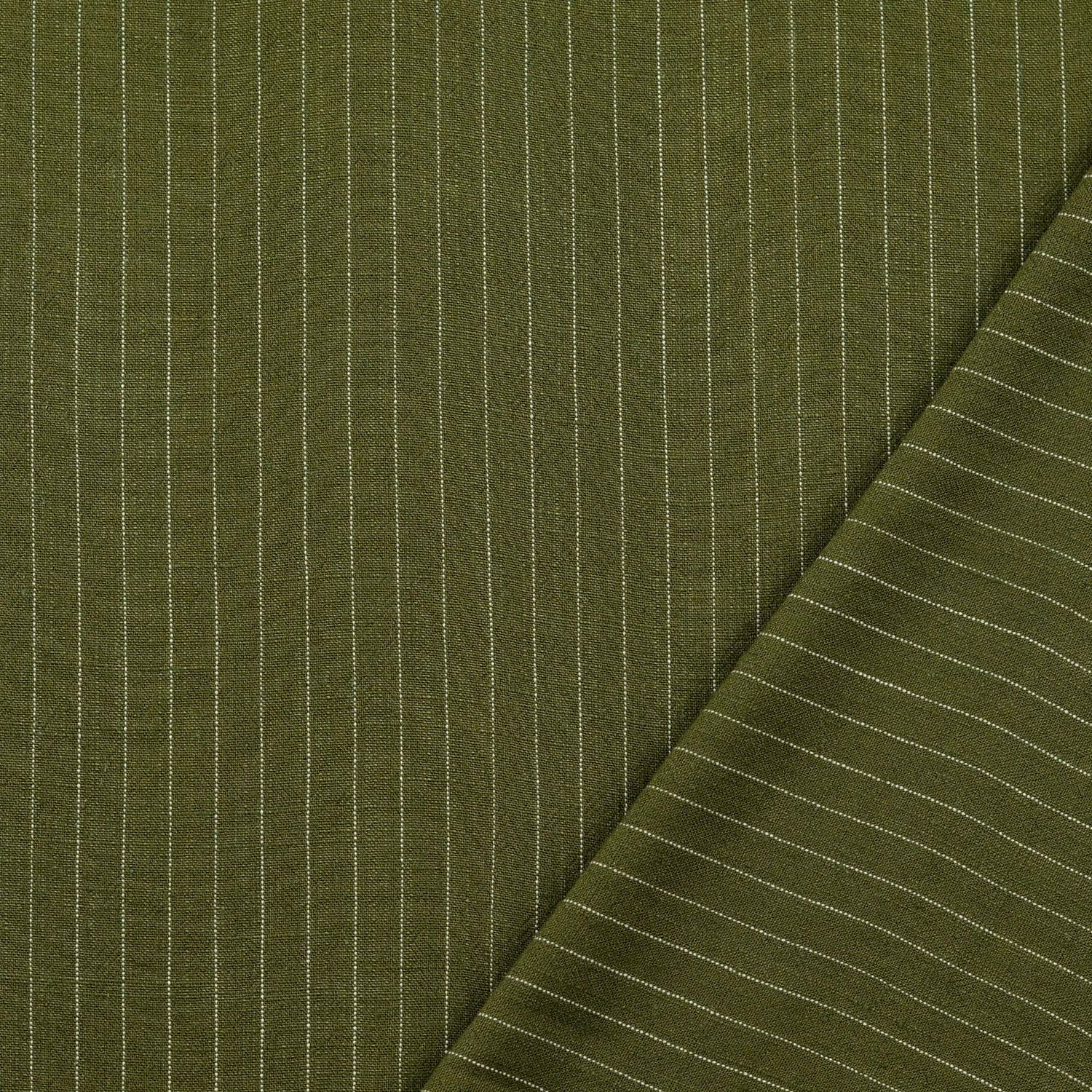 Een stof als een zomerse boswandeling: het diepe donkergroen wordt doorbroken door fijne, onregelmatige slub-strepen die het weefsel een elegante, natuurlijke structuur geven. Het licht levendige oppervlak zorgt voor een moderne, casual uitstraling en maakt elke meter van deze stof bijzonder.