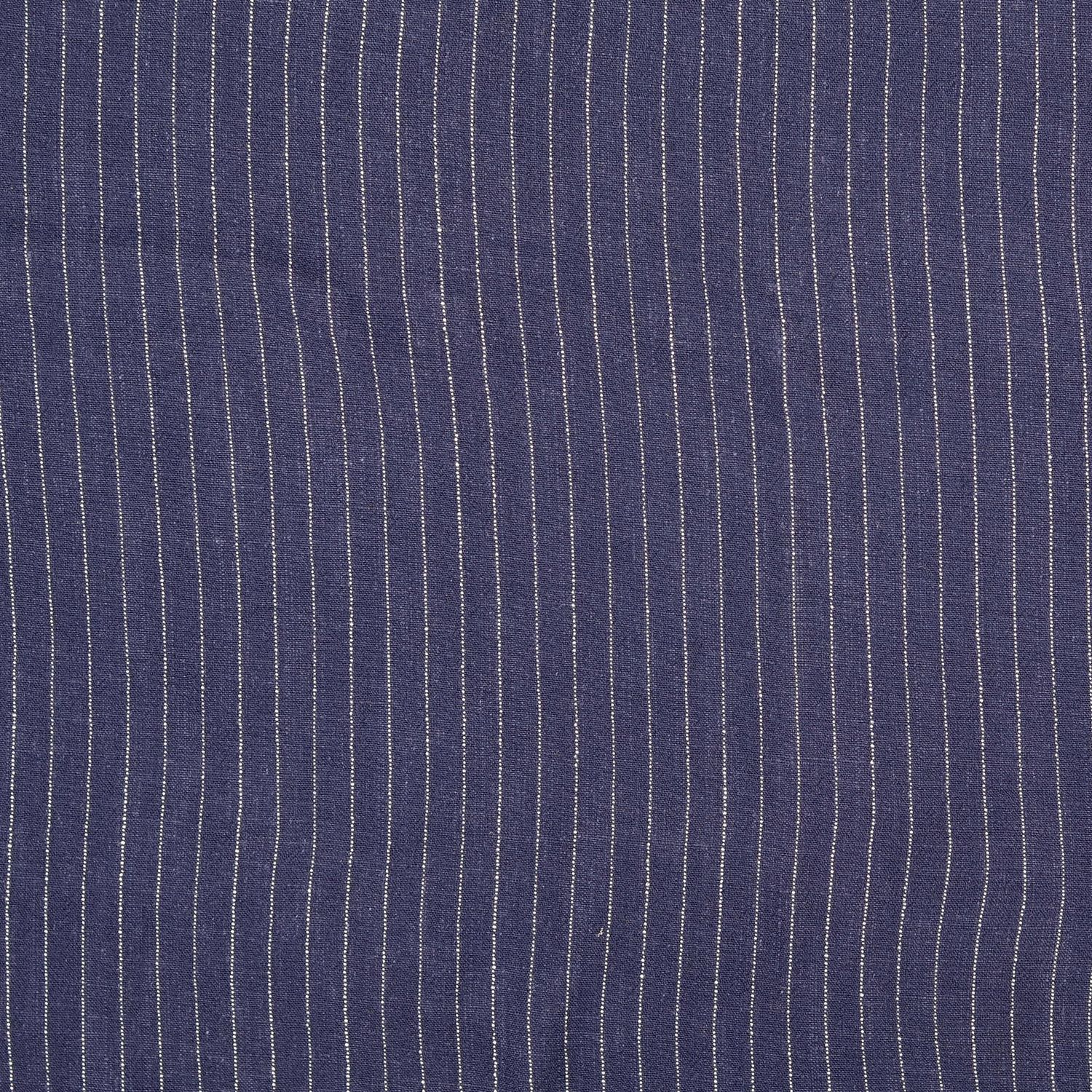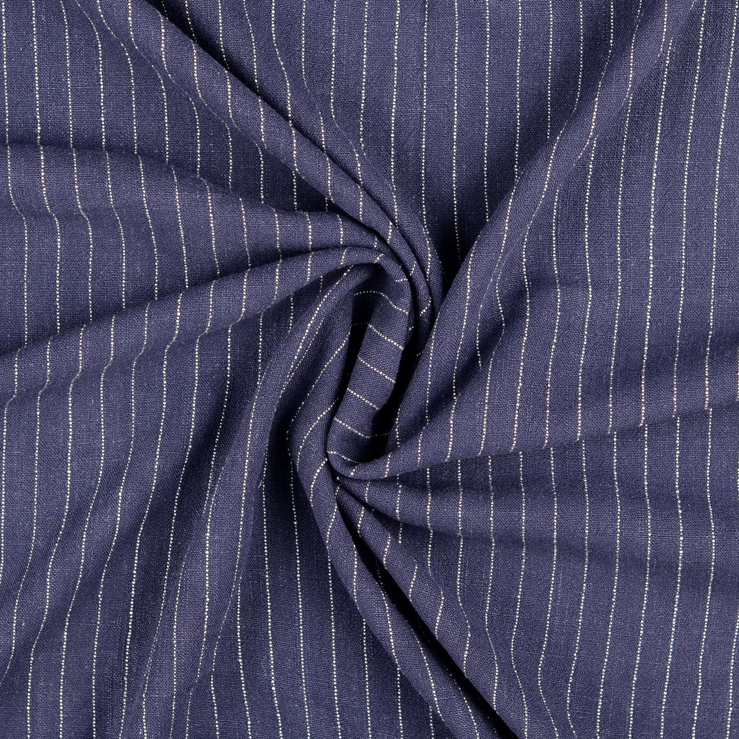 Deze stof combineert nonchalante elegantie met maritieme charme: fijne, onregelmatige slubstructuren geven het oppervlak een natuurlijke, licht levendige uitstraling, terwijl de smalle strepen in klassiek Navy en lichte natuurtint zorgen voor een tijdloos streeppatroon.