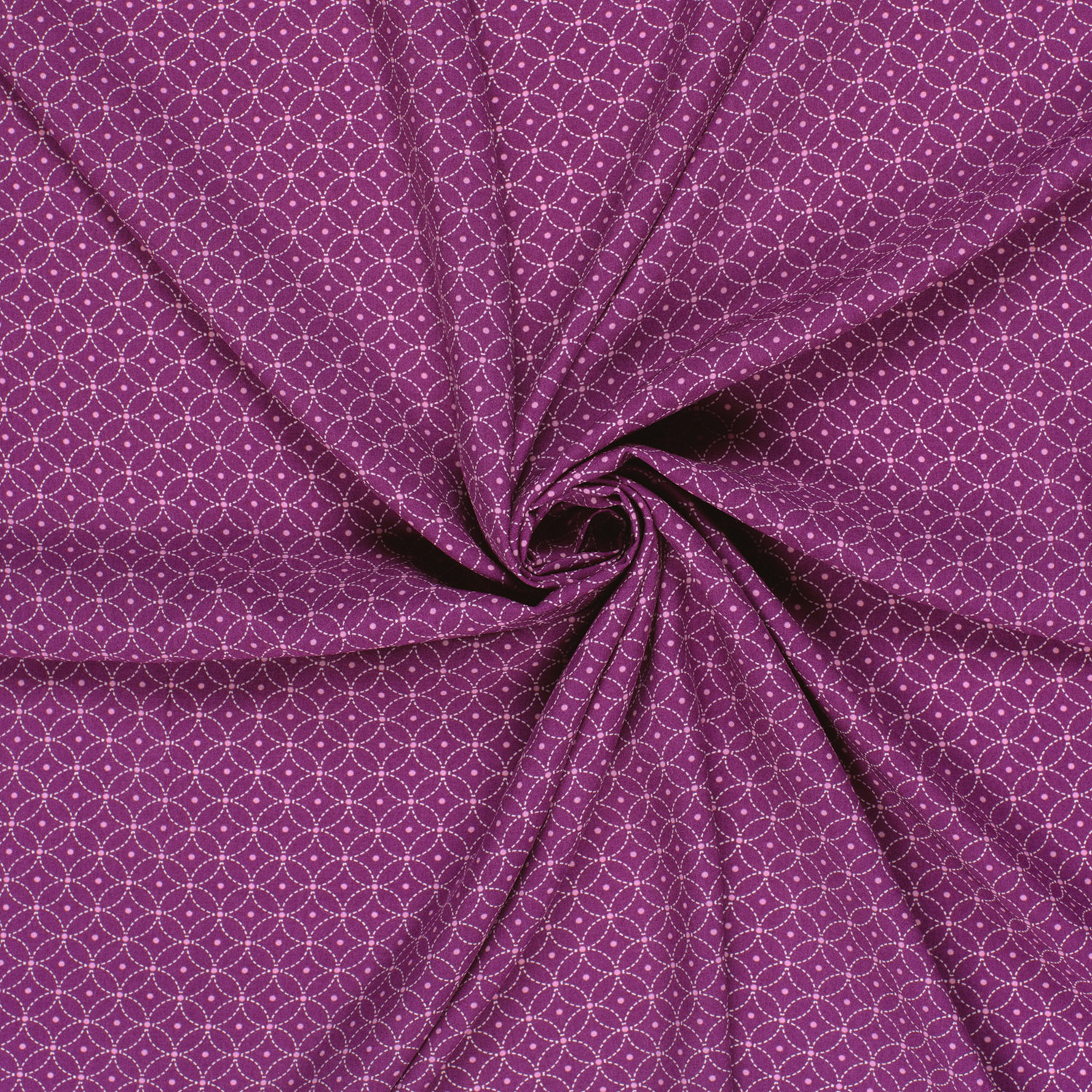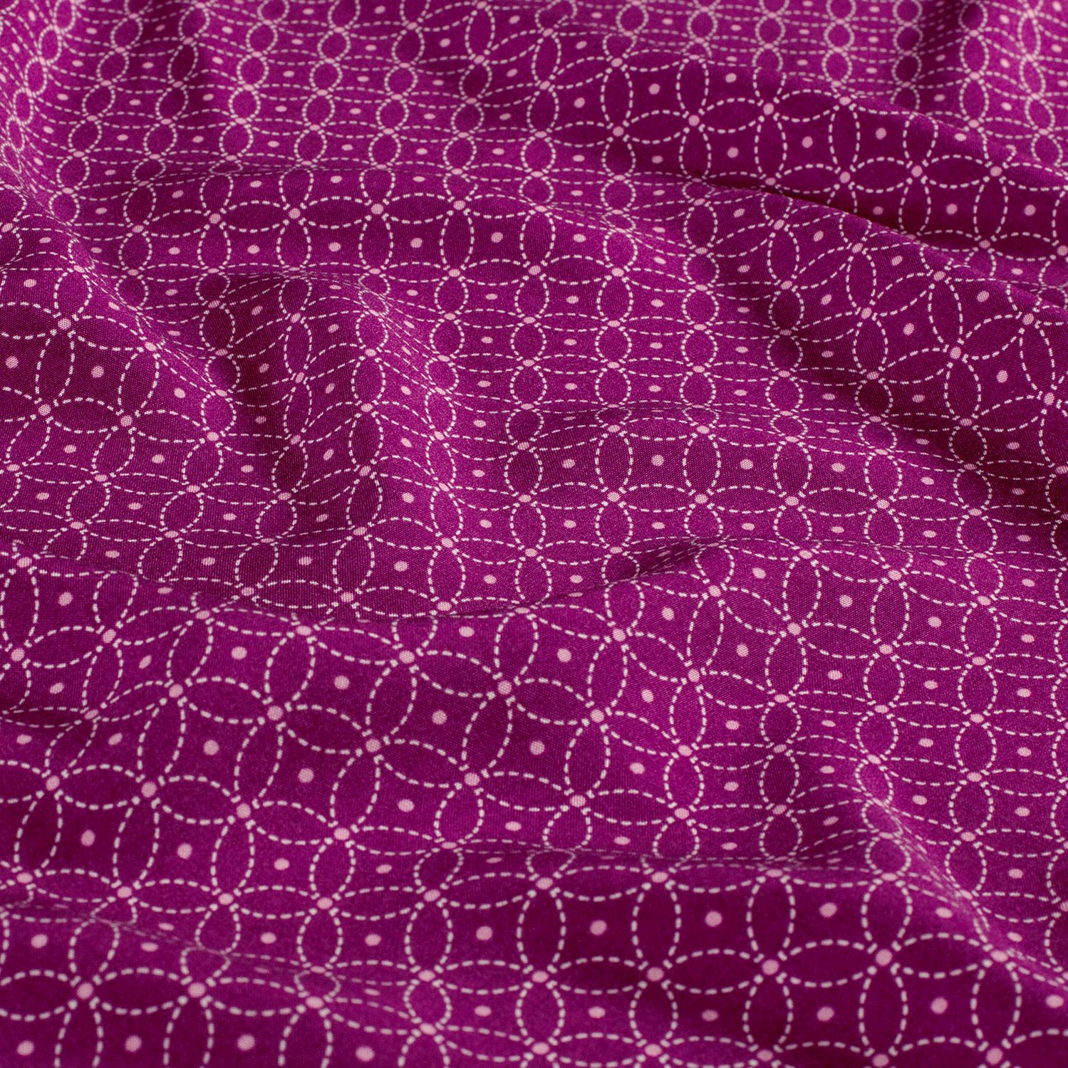 Een stof als confetti op de huid: op een intens magenta achtergrond dansen speelse cirkels en stippen in harmonieus afgestemde rozen-, roze- en bessentinten. Fijne, verschillend grote stippen mengen zich met duidelijk getekende cirkels en creëren een levendig, modern patroon dat meteen in het oog springt.