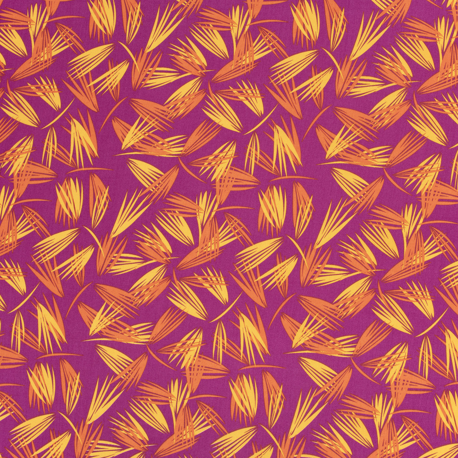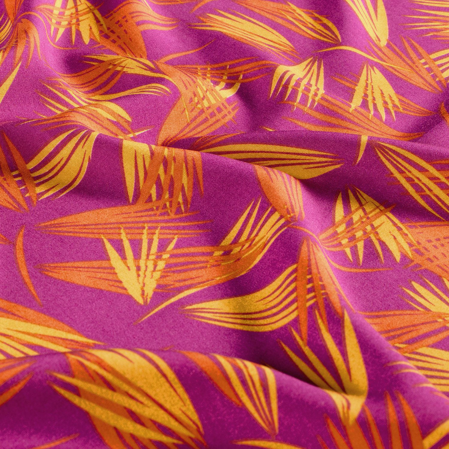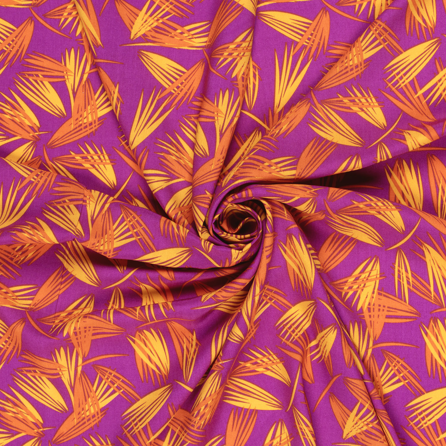 Een stof als een tropische vakantie: op een intens magenta achtergrond spreiden elegante palmblaadjes zich uit en creëren een levendig, exotisch patroon. De fijne blaadjes in zachte groen- en natuurtinten lijken bijna geschilderd en komen bijzonder mooi tot hun recht op het krachtige roze.