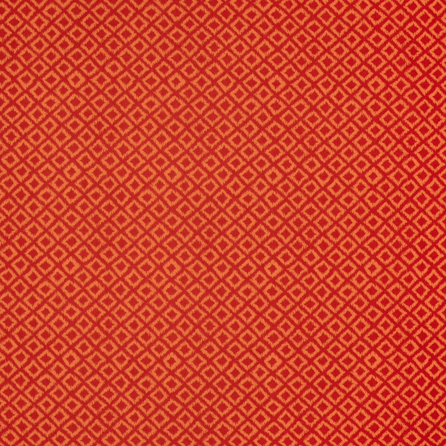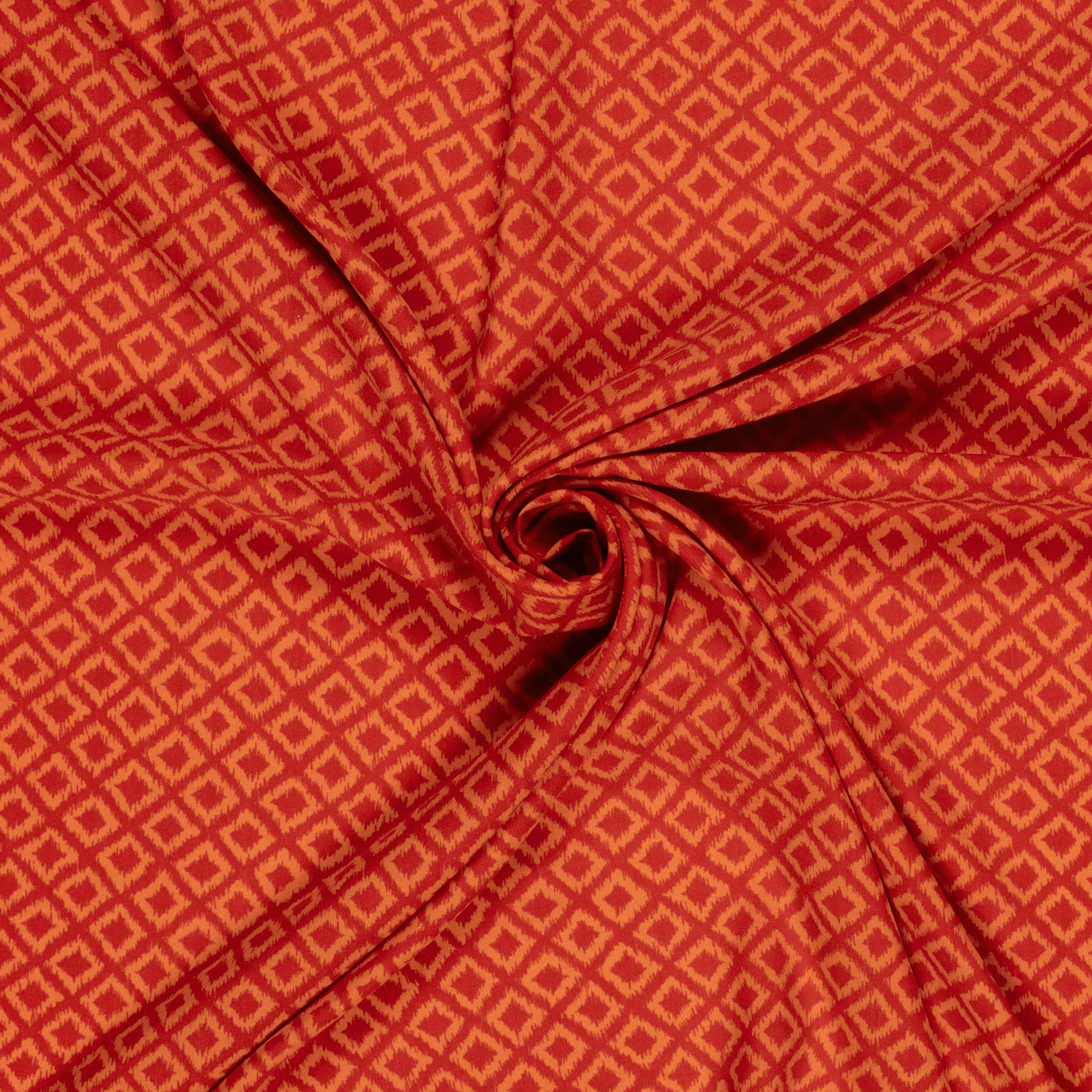 Een stof als een modern kunstwerk: Op een felrode achtergrond dansen kleine, gelijkmatige vierkanten in heldere lijnen over het oppervlak. Het grafische patroon doet denken aan tijdloze retrodesigns en geeft je naai-projecten een frisse, stijlvolle uitstraling.