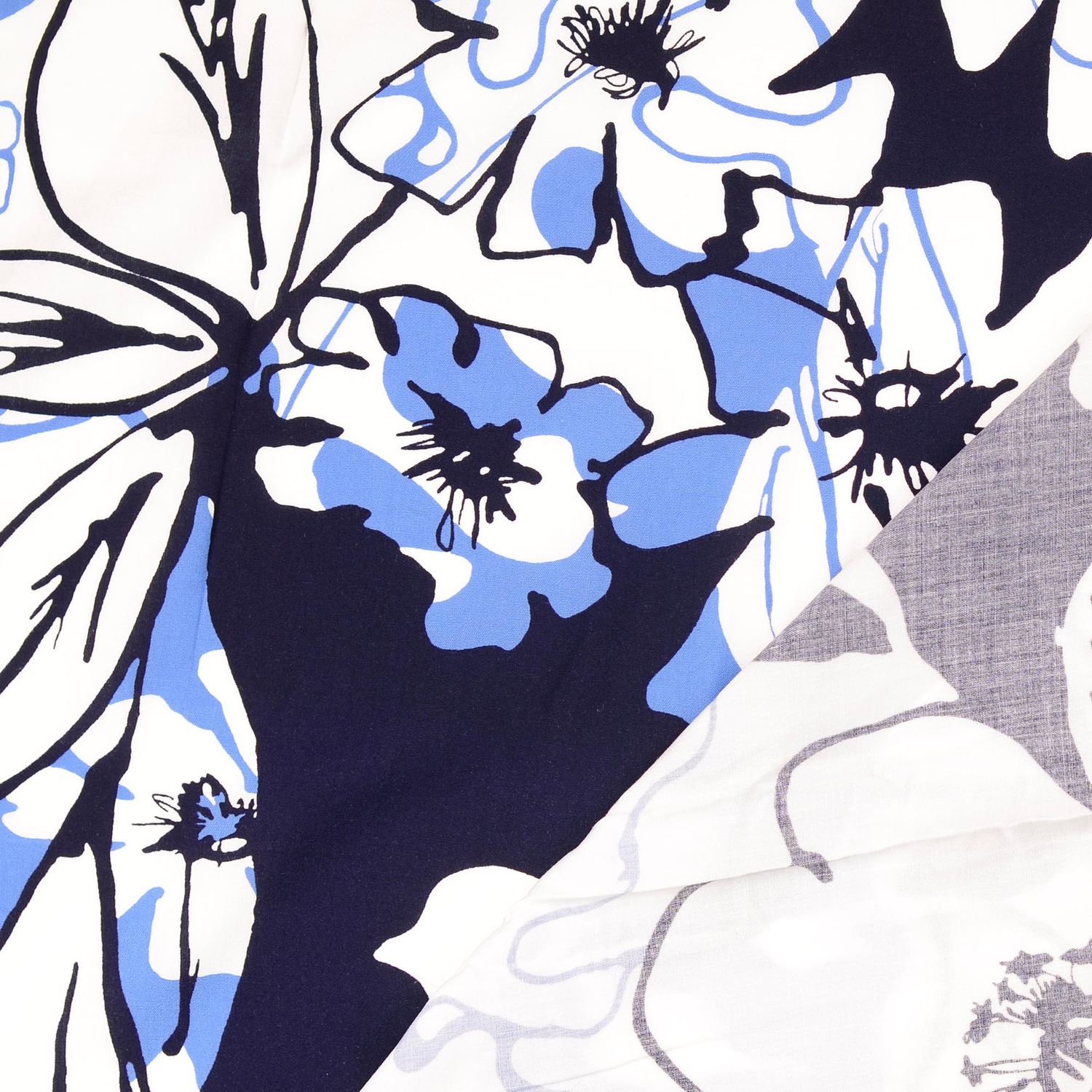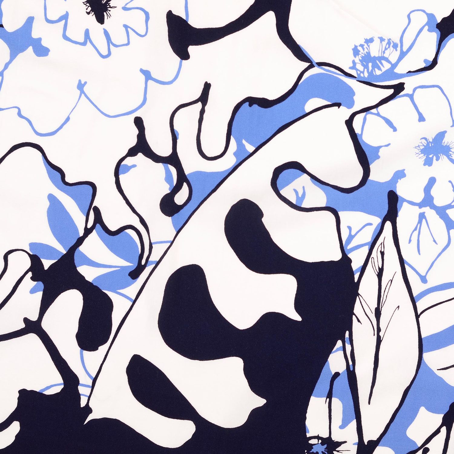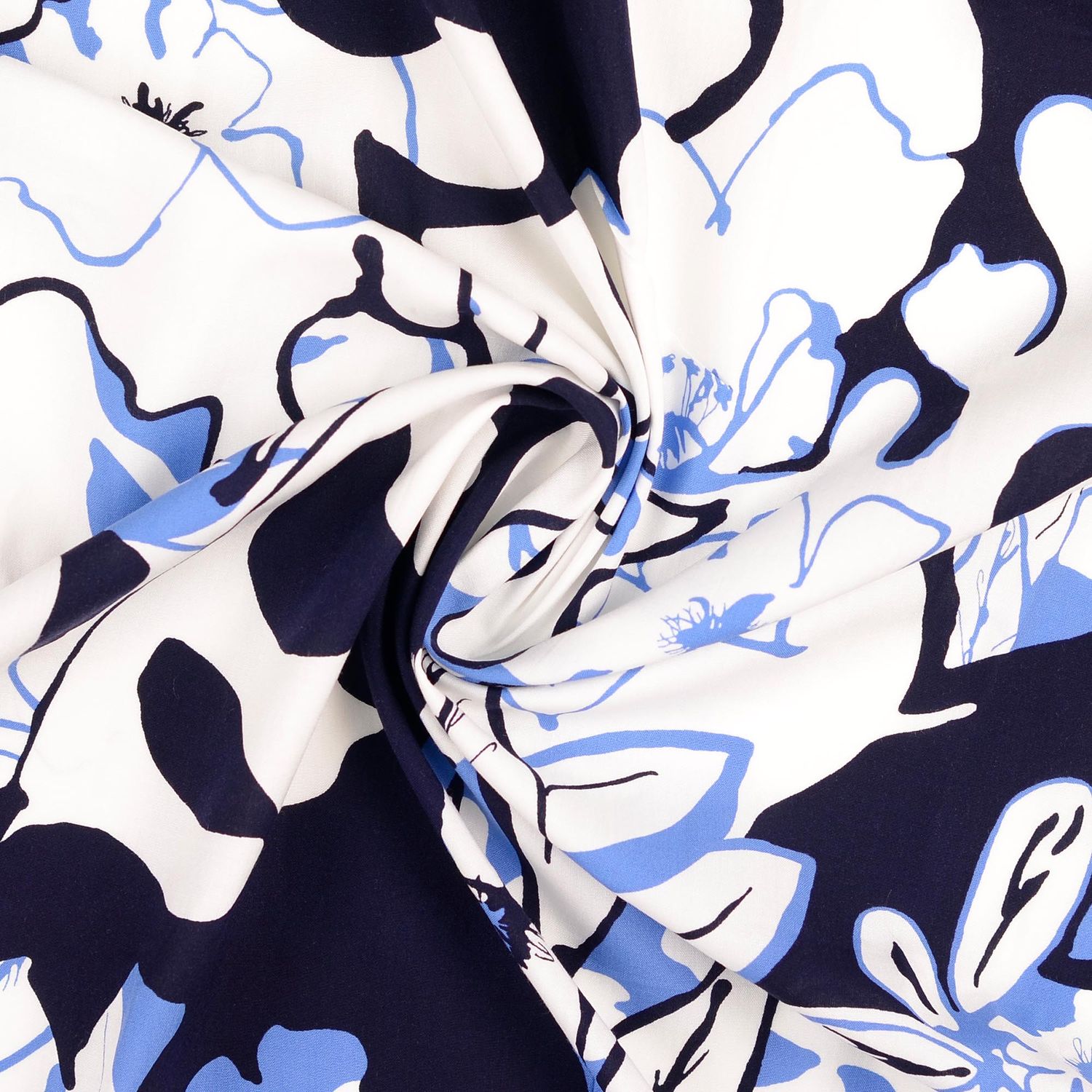 Een stof als een zomerdag aan zee: op een zacht witte achtergrond ontvouwen zich grote, gestileerde bladeren en weelderige bloemen in diep jeansblauw. Het florale motief oogt zowel modern als romantisch – de heldere contouren en het rustige kleurenspel maken het ontwerp heerlijk tijdloos.