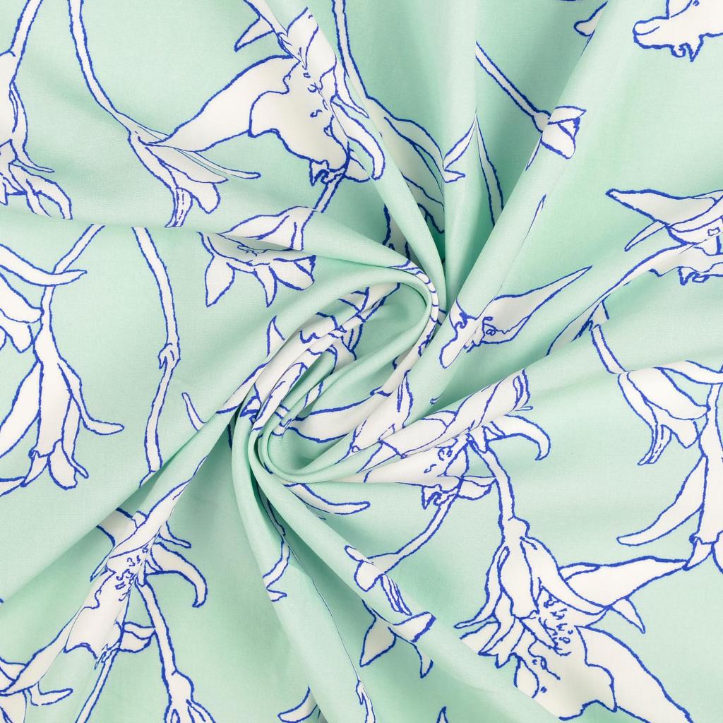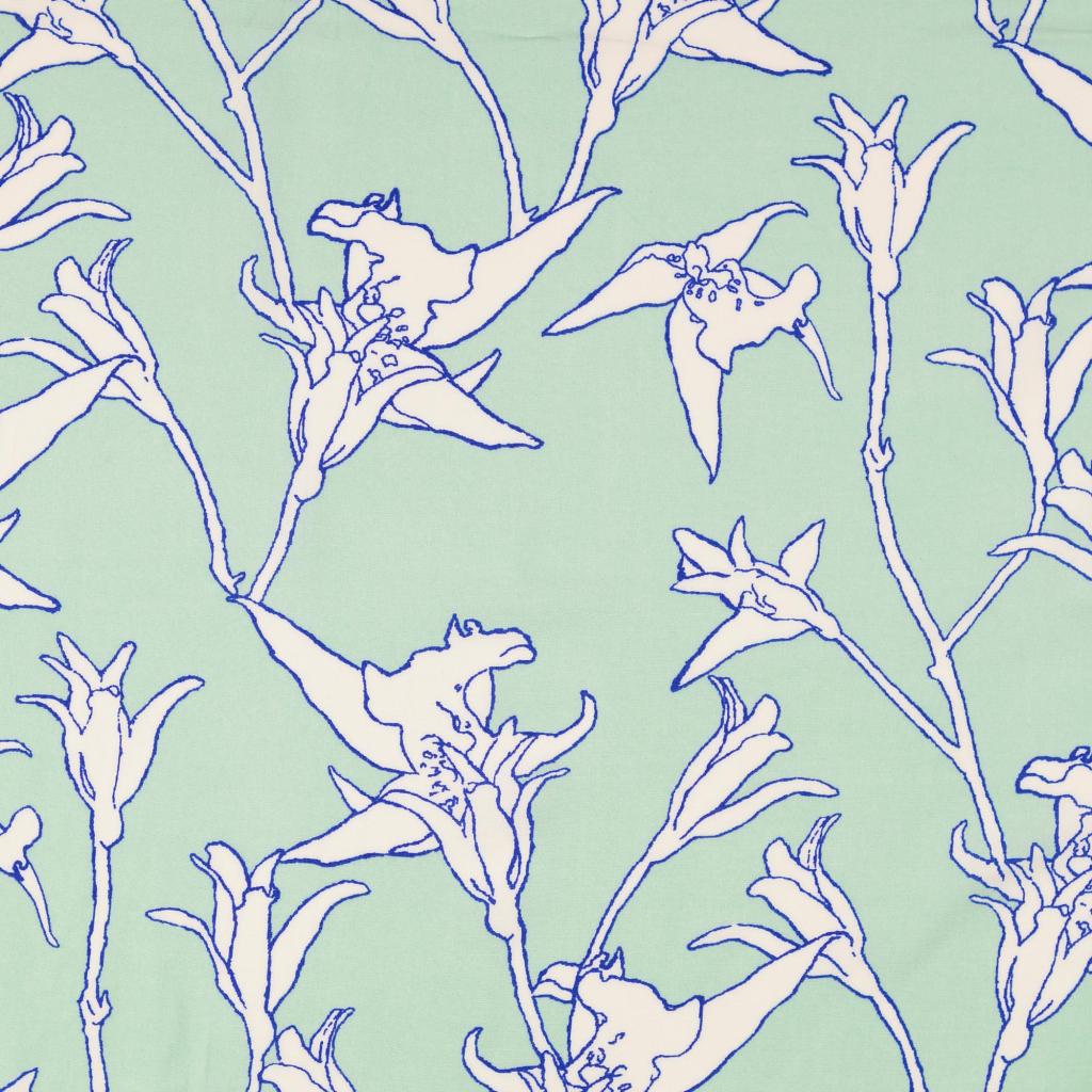 Zacht als een lentedag: Op een zachte mintkleur bloeien elegante lelies, fijn getekend en liefdevol gerangschikt. De bloemen herinneren aan een romantische tuin waar zachte crème- en natuurtinten spelen met subtiele, donkere accenten.
