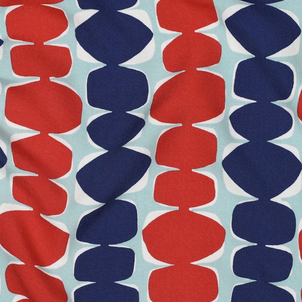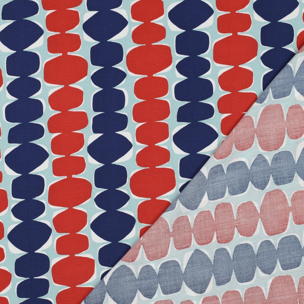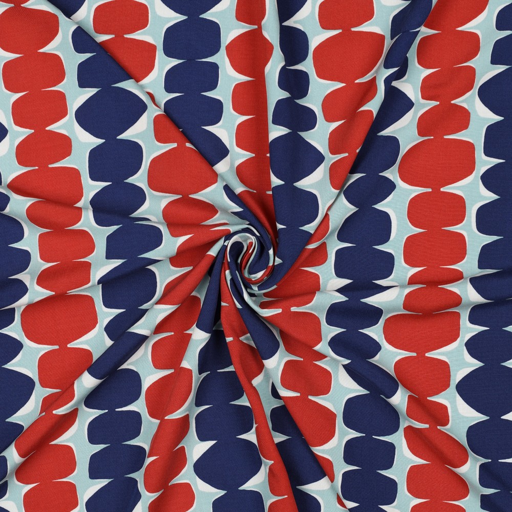 Deze viscose stof betovert met een stijlvol retrodesign in een frisse mintkleur. Het grafische patroon doet denken aan mid-century vormen en geeft elk naai-project een moderne vintage charme. Zachte, gebogen lijnen en subtiel verlopen kleuren creëren een levendige maar toch harmonieuze uitstraling die direct in het oog springt.