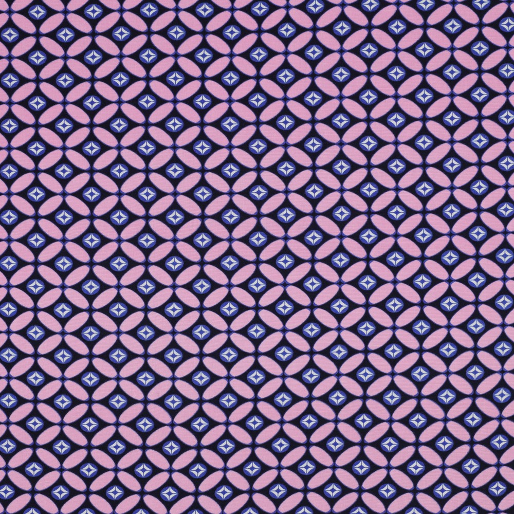 Een stof als een tijdreis: het retrodesign in nachtblauw en roze straalt direct vintage charme uit en oogt tegelijk modern en elegant. Op het diepe nachtblauw komen de grafische vormen in zacht roze en warme beigetinten stijlvol naar voren – als een liefdevol ontworpen retro patroon dat doet denken aan designklassiekers uit de jaren 60 en 70.