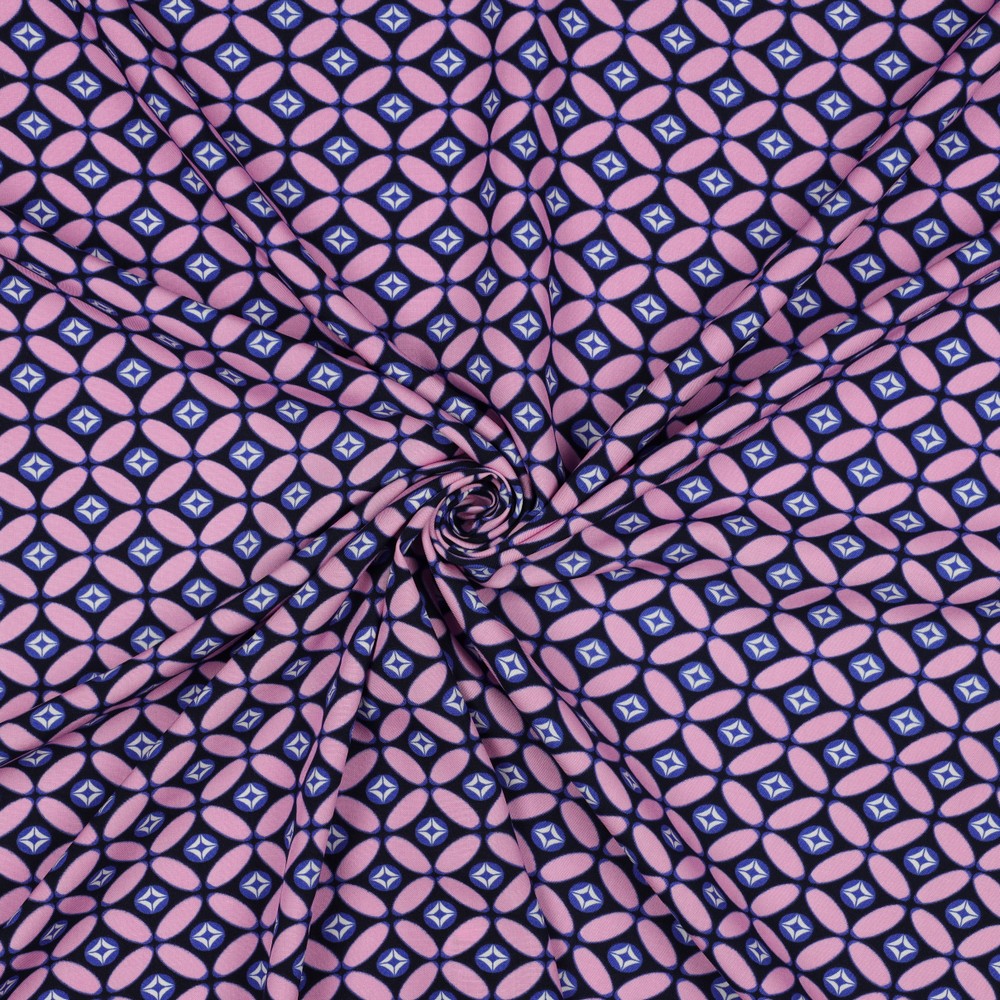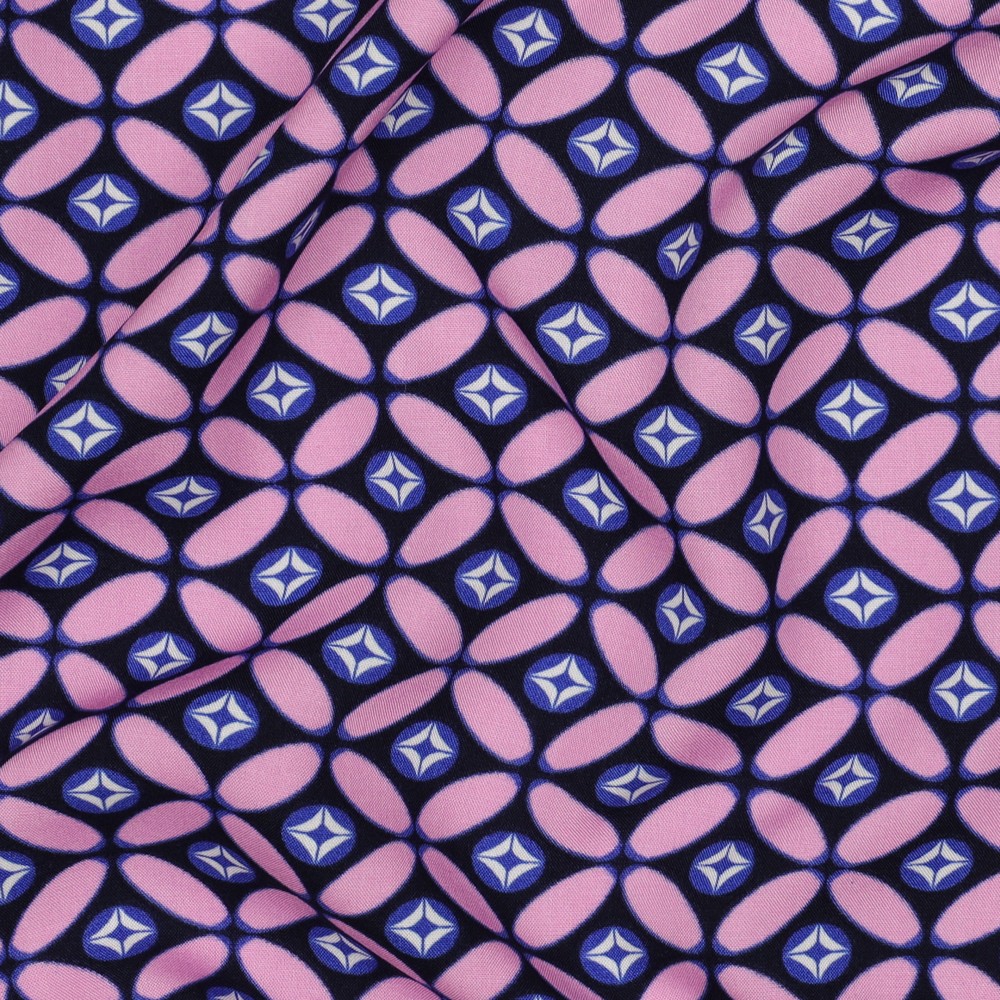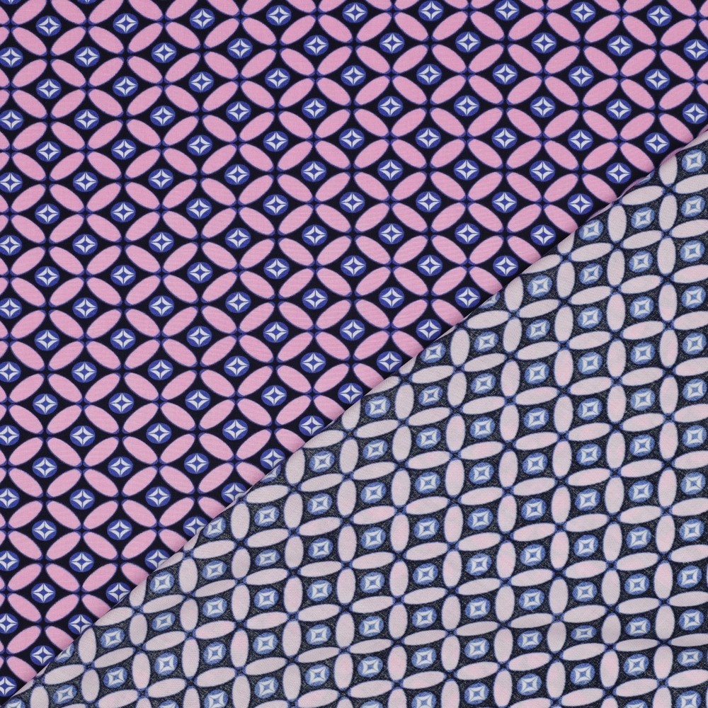 Deze EcoVero-stof is ideaal voor iedereen die modebewustzijn wil combineren met gevoel voor bijzondere patronen. Of het nu voor je nieuwe favoriete jurk is, een licht zomers topje of een stijlvol sjaaltje – met dit retrodesign in nachtblauw en roze wordt elk naai-project een blikvanger.